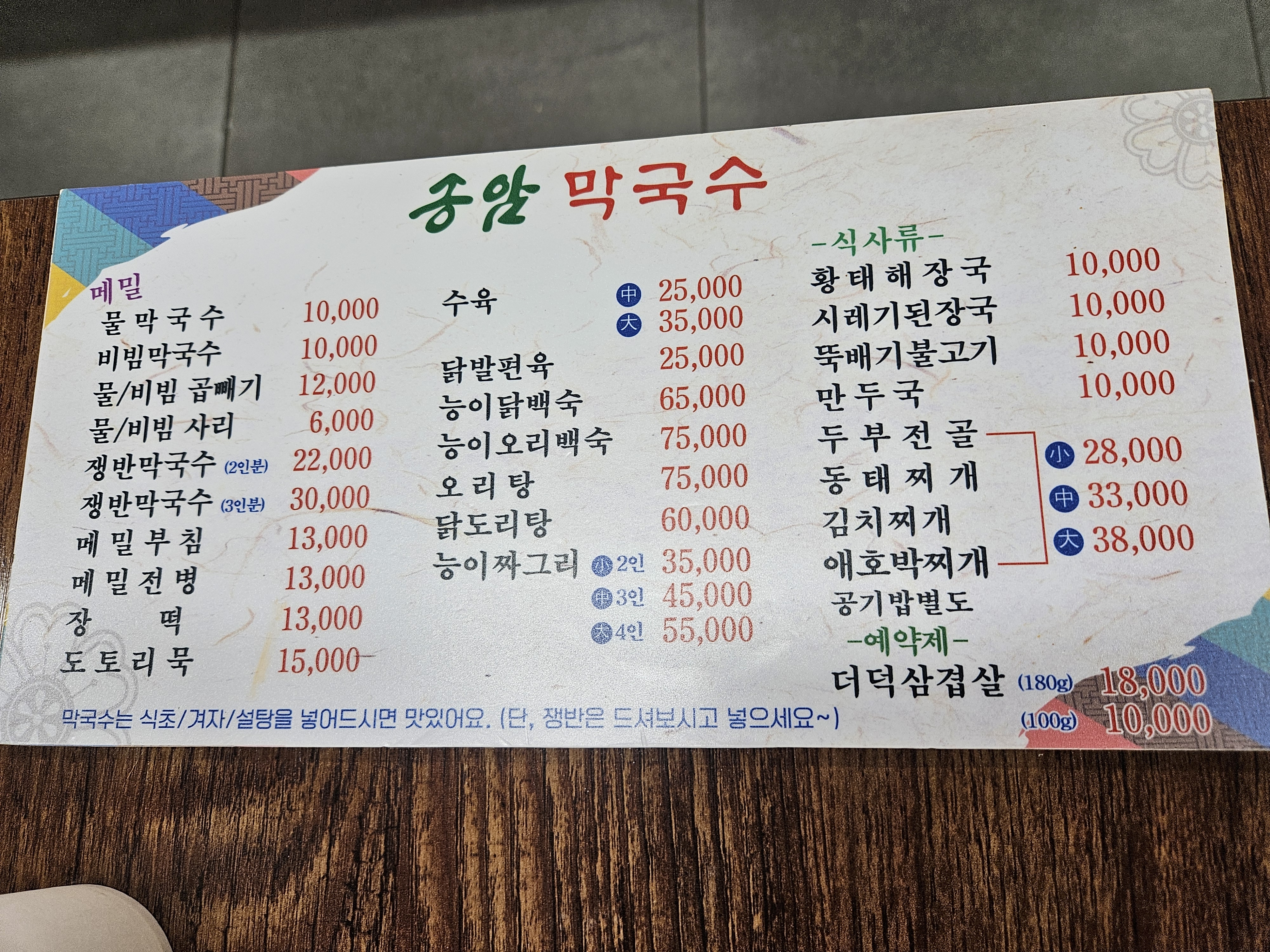 메뉴판을 보니 국수종류 외에도 식사류 등등 다양한 메뉴들도 있었는데요. 그래도 막국수집을 왔으니 막국수를 먹어야겠죠? 그렇게 물막국수와 비빔막국수 그리고 메밀전병을 시켰습니다.