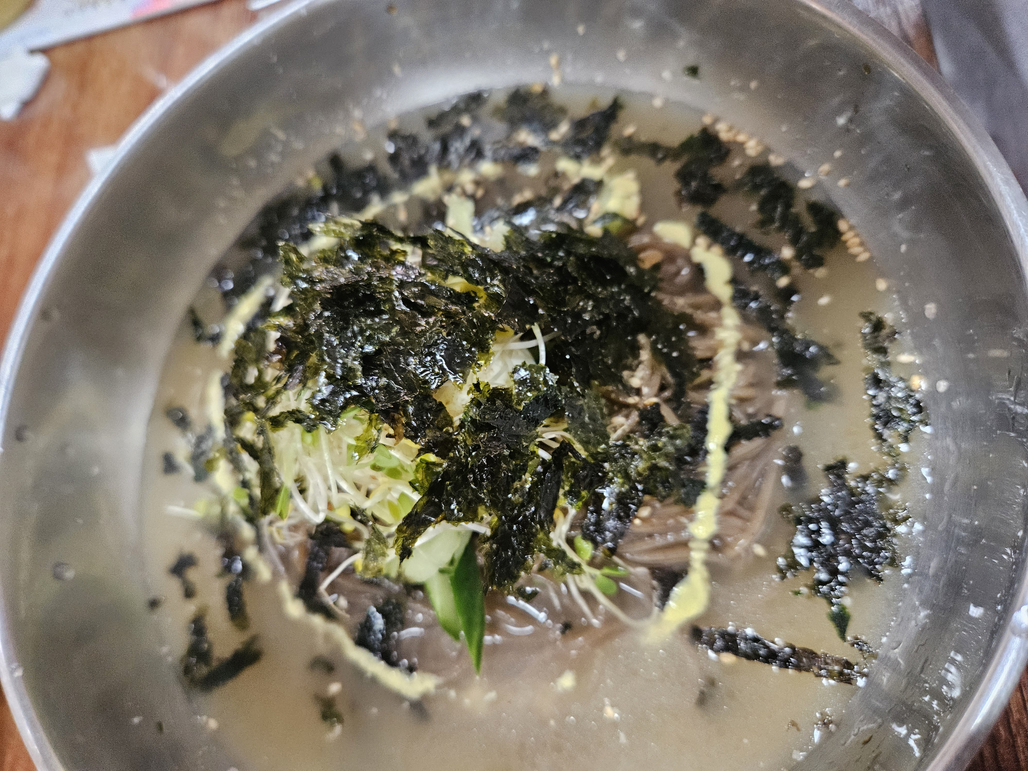 막국수에 식초, 겨자, 설탕을 넣어서 먹으면 맛있다고 하길래 물, 비빔막국수에 식초, 겨자, 설탕 한 바퀴씩 둘러서 먹어보았습니다.