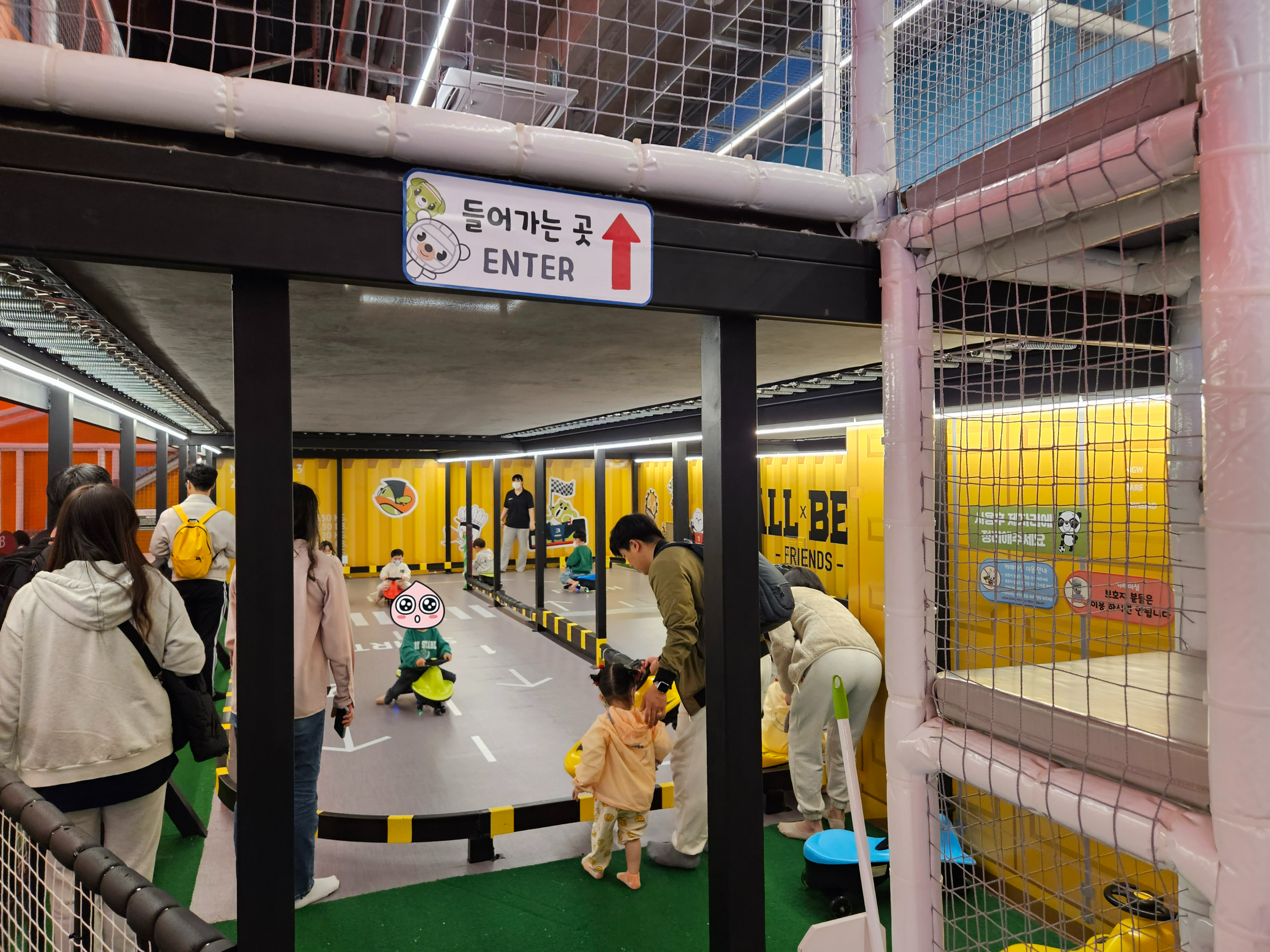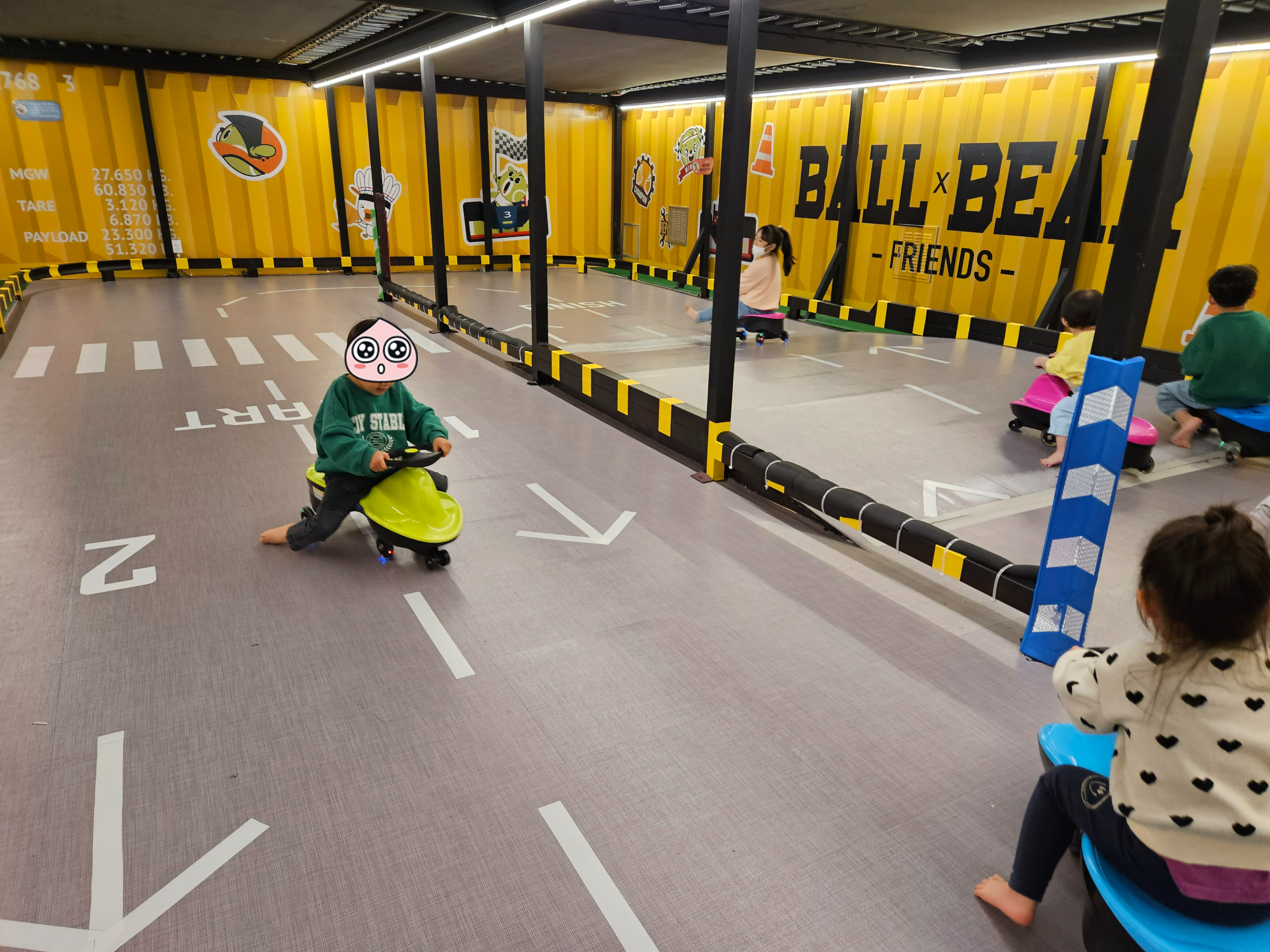 우리 집 아들은 트럼플린은 싫어하지만 볼베어파크는 신기하게 트럼플린이 위에 설치되어 있더라고요. 그리고 바로 아래는 카레이싱을 할 수 있는 곳이 있었는데요.