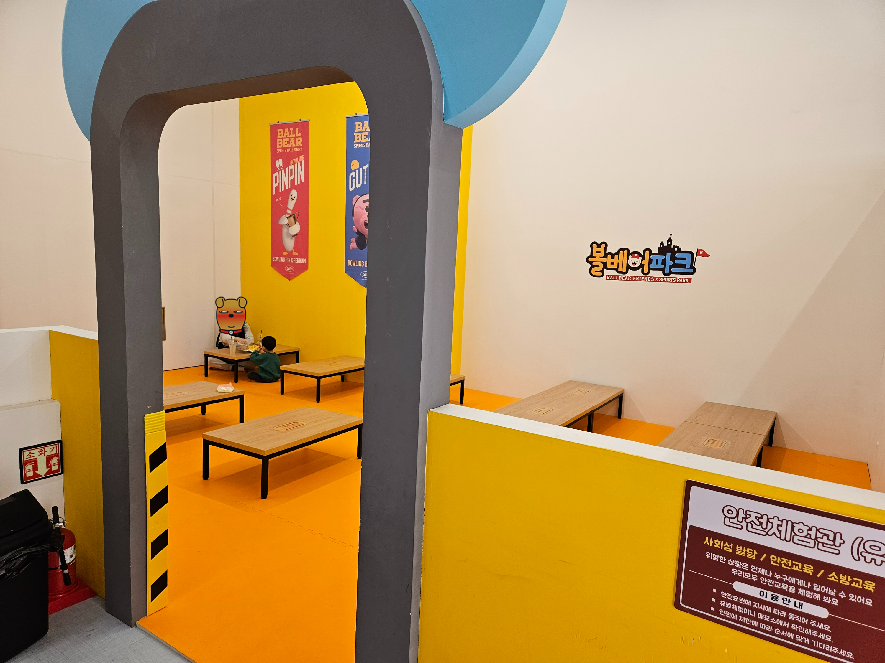 식당에는 자리가 없고 앉아서 과자 먹을 곳을 찾다가 볼베어파크 입구 쪽에 있는 영어로 볼베어라고 써져 있는 곳에 쭉 들어가면 안전체험관이라고 있는데요. 그쪽에 사람이 없는 휴식 공간이 있더라고요. 거기서 조금 쉬다가 와이프가 배고프다고 해서 밥 먹으러 나왔답니다.