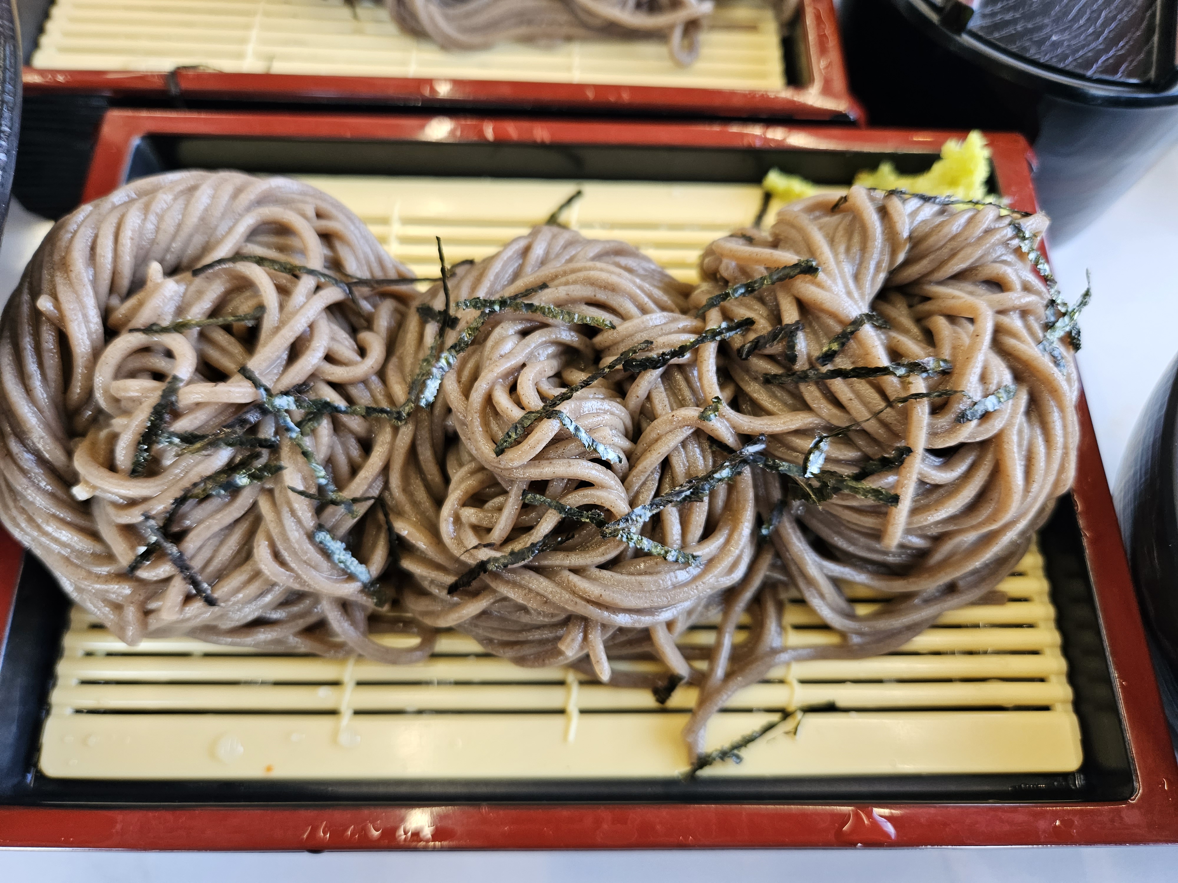 그리고 냉소바를 먹어보았는데요. 개인적으로 여태 먹어본 소바 중에서 제일 맛있었습니다. 면을 직접 뽑아서 그런지 정말 탱탱하고 두툼하면서 쫄깃한 게 맛있었고 특히 육수 또한 한몫했습니다. 그리고 판메밀 형식으로 나오는데 양 또한 엄청 많이 주시더라고요. 비빔소바를 괜히 시켰나 생각이 들 정도로 많은 양이었습니다.