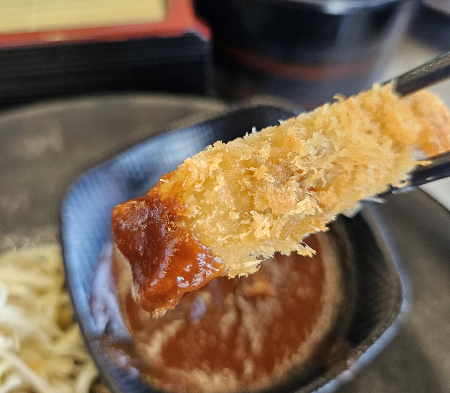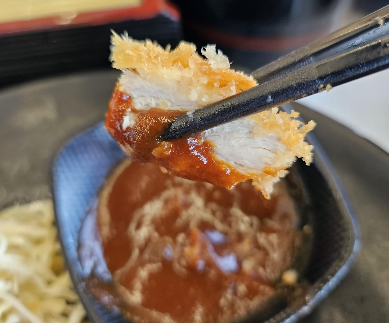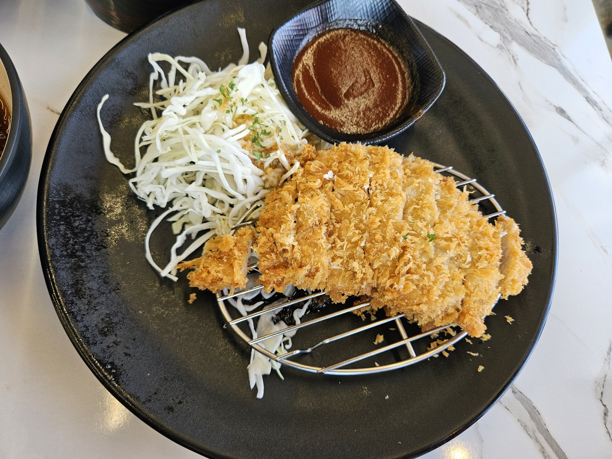 마지막으로 돈카츠(돈가스) 또한 속살은 부드럽고 겉은 바삭바삭한 게 맛있더라고요. 36개월 아들도 냉소바랑 돈카츠를 잘 먹어줘서 기분 좋았습니다. 그리고 야채샐러드 소스를 조금 특이하게 타코야끼에 들어가는 가쓰오부시 맛이 나는 소스를 사용한 것 같더라고요. 처음 먹어보는 샐러드 소스였지만 맛은 있었습니다.