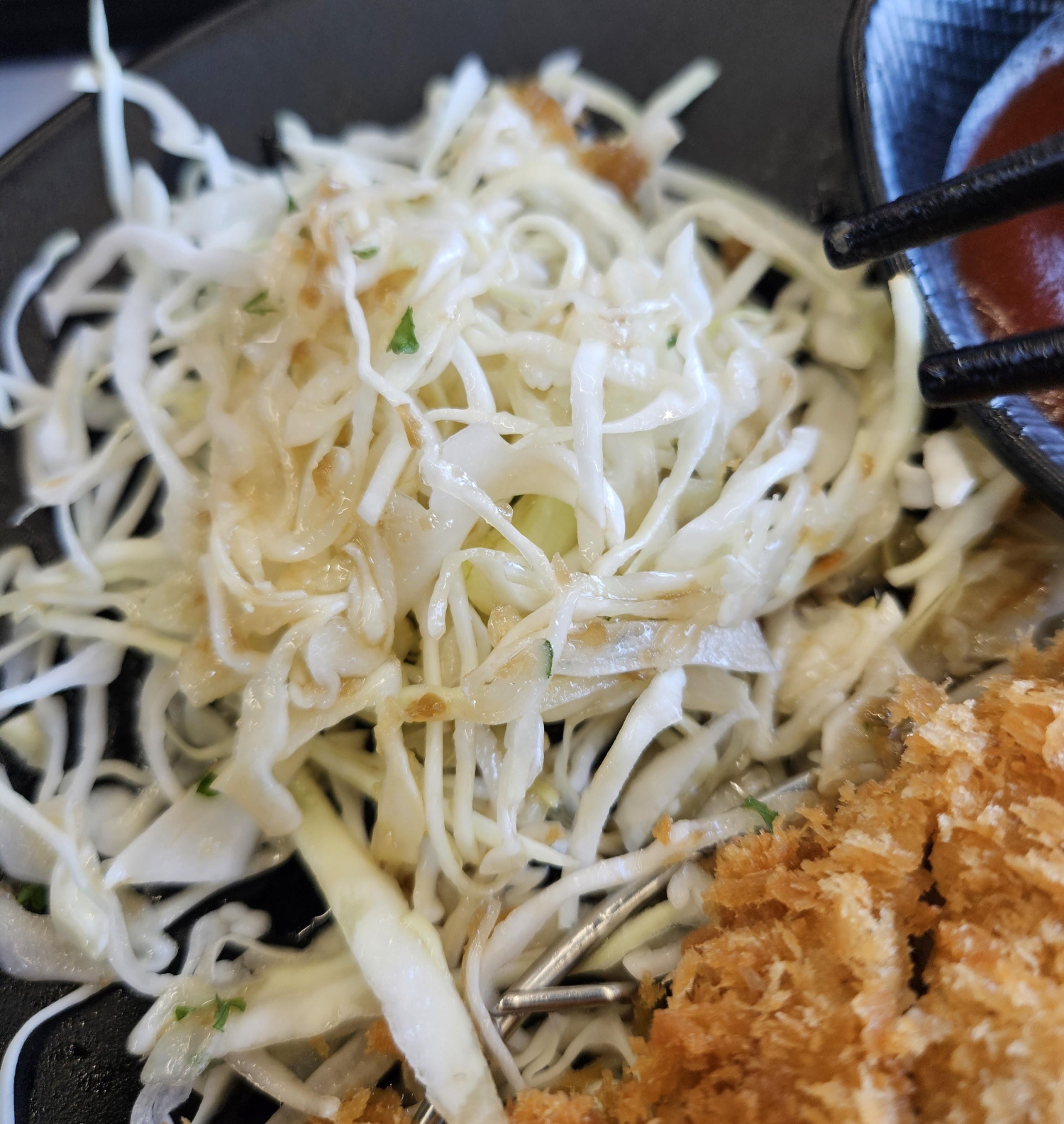 마지막으로 돈카츠(돈가스) 또한 속살은 부드럽고 겉은 바삭바삭한 게 맛있더라고요. 36개월 아들도 냉소바랑 돈카츠를 잘 먹어줘서 기분 좋았습니다. 그리고 야채샐러드 소스를 조금 특이하게 타코야끼에 들어가는 가쓰오부시 맛이 나는 소스를 사용한 것 같더라고요. 처음 먹어보는 샐러드 소스였지만 맛은 있었습니다.