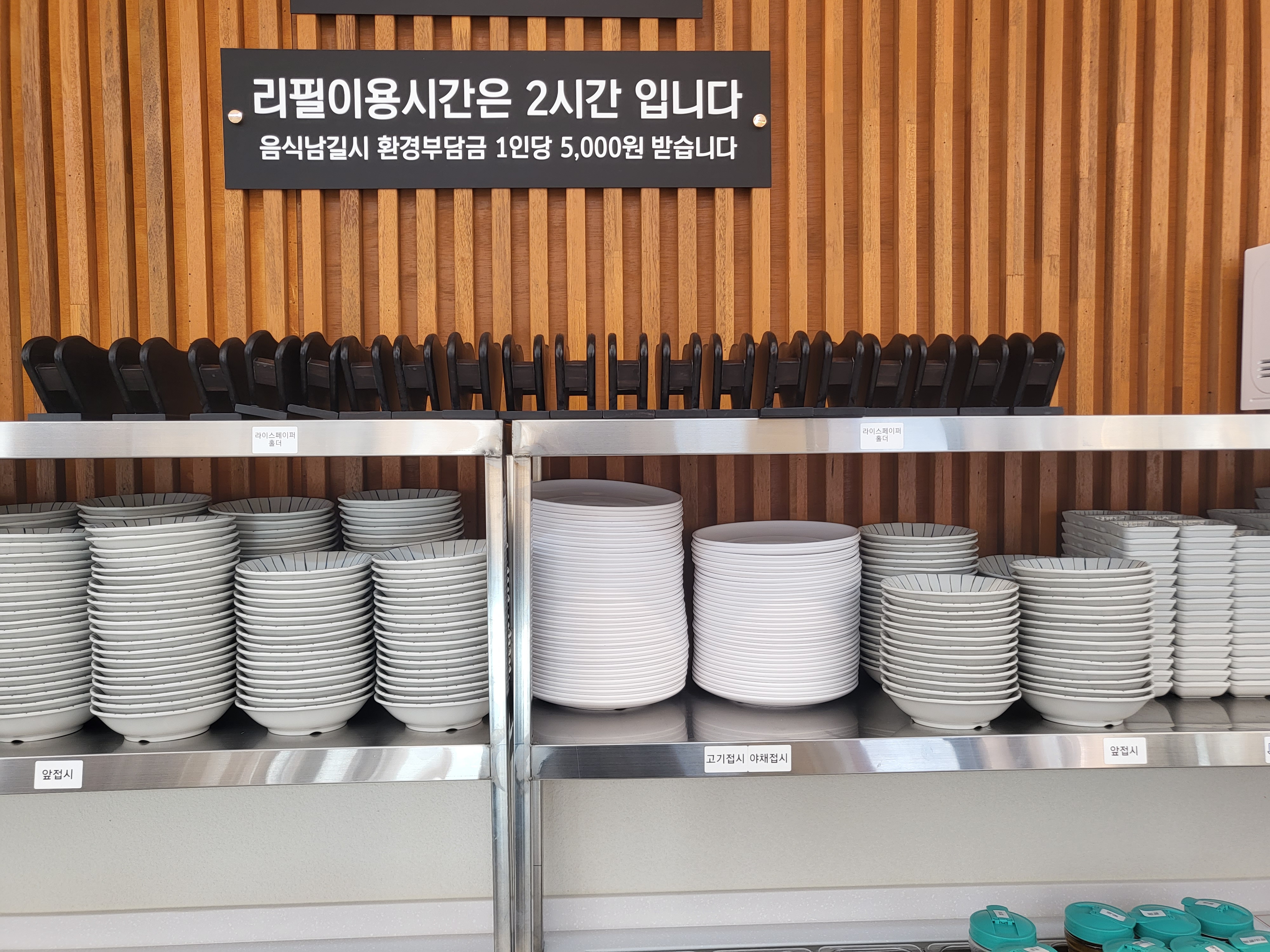 편백찜이 익는 동안 월남쌈을 먹으면서 기다리기 위해 셀프바 쪽을 갔는데요. 월남쌈재료, 샤브 재료 나눠서 배치되어 있고 그릇 관련된 것들은 바로 위에 배치되어 있더라고요.