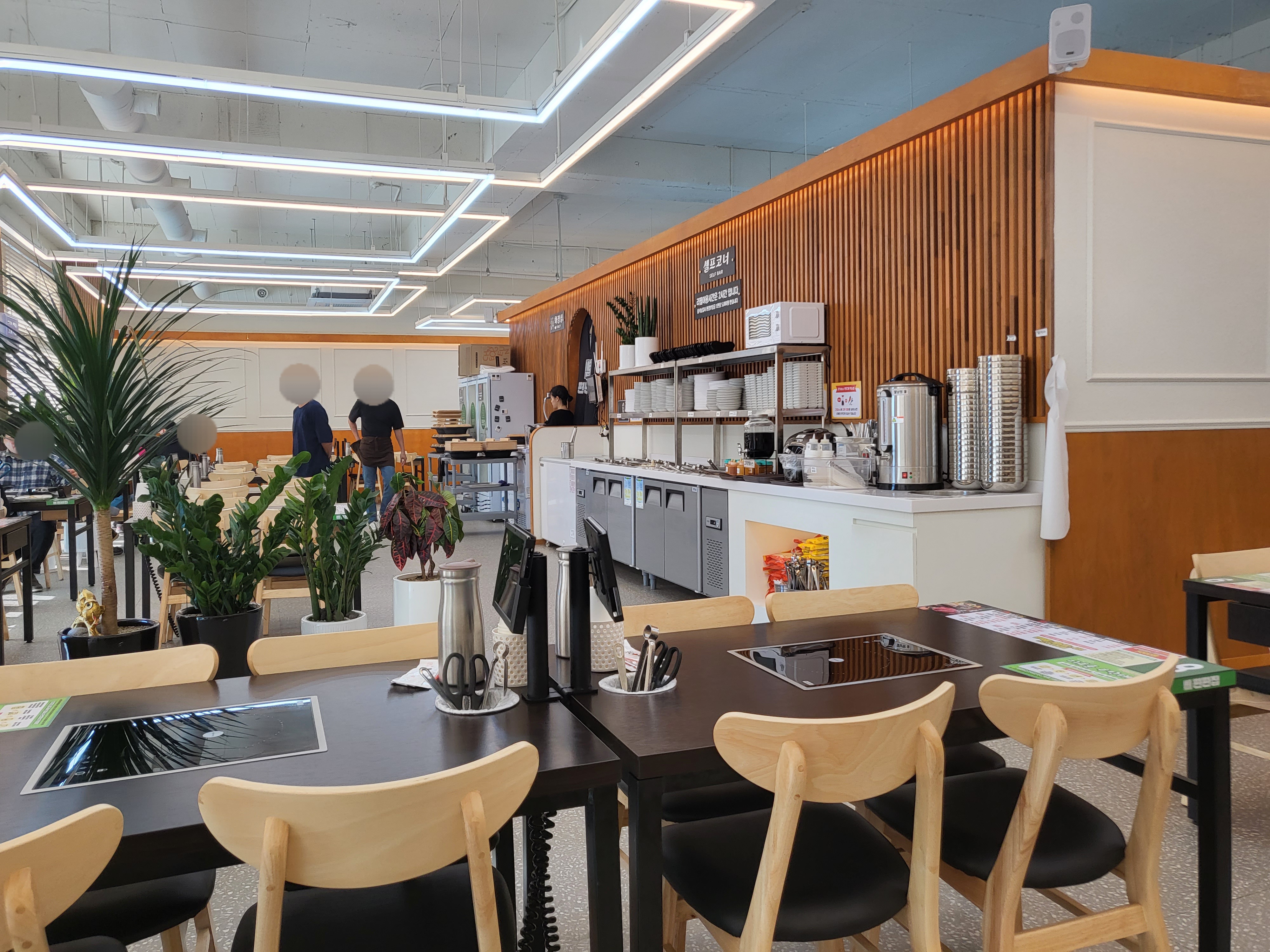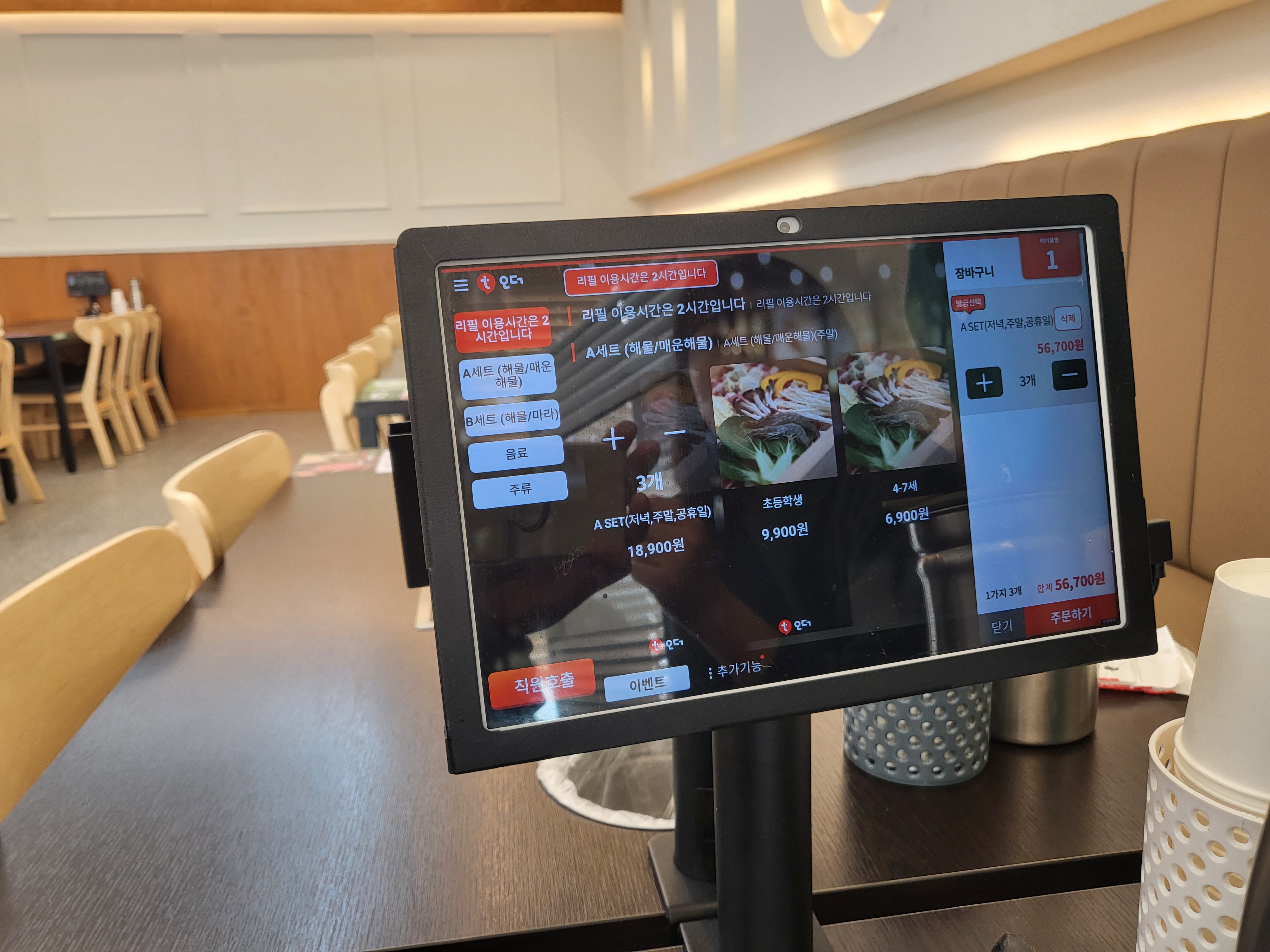 아직 지어진 지 오래 안되어서 그런지 역시 깨끗하고 뭔가 편백나무 같은 느낌이 들면서 좋더라고요. 그리고 각 테이블에 있는 키오스크를 이용해 주문을 하는 방식이었습니다.