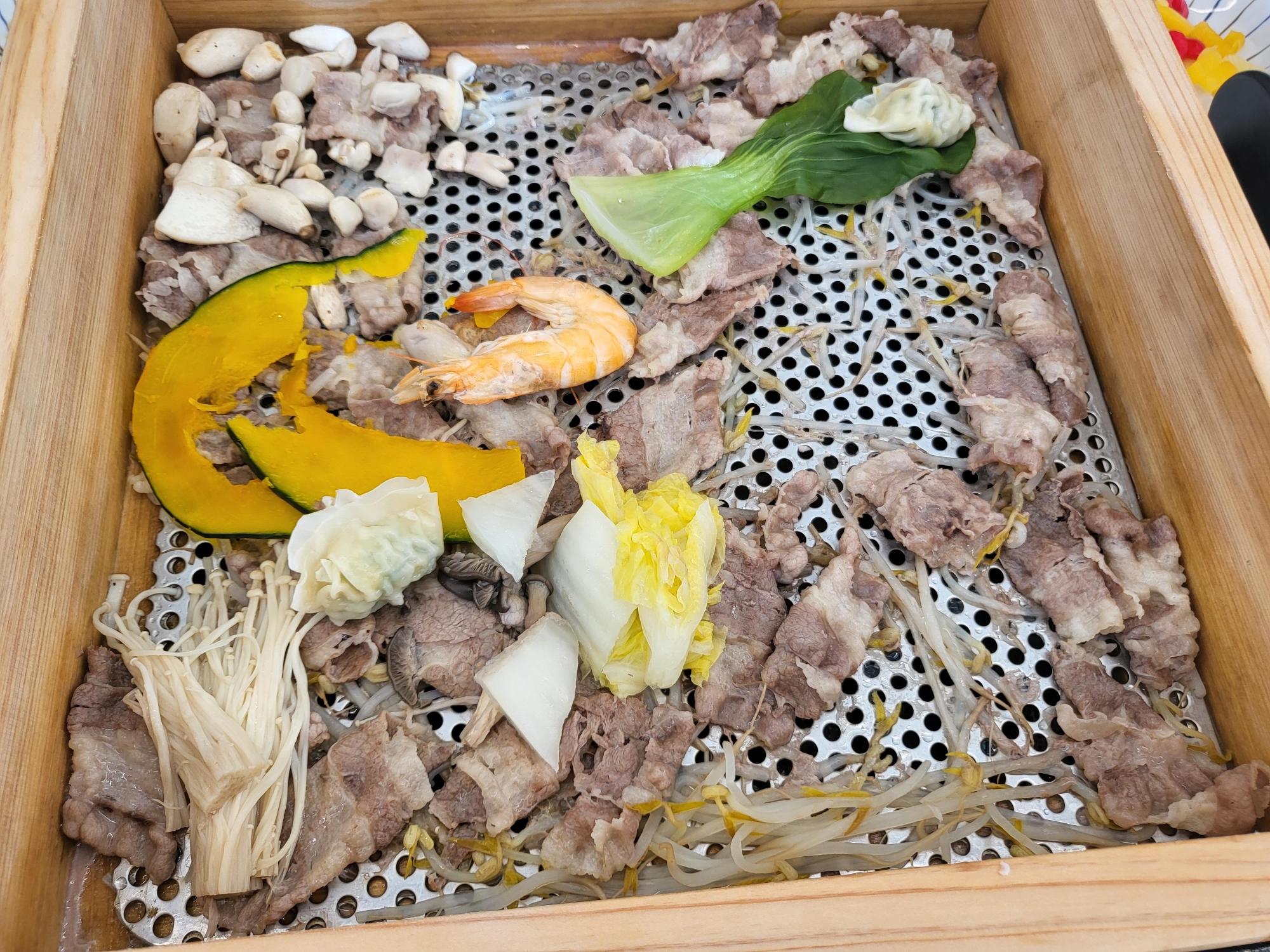 그 위에 편백찜기를 올려놓고 숙주 고기 해물 그리고 각종 야채를 15분간 쪄서 먹는 거더라고요. 타이머 시계를 통해 15분이 지나면 직원을 부르면 편백찜 뚜껑을 빼주는 방식이었습니다.