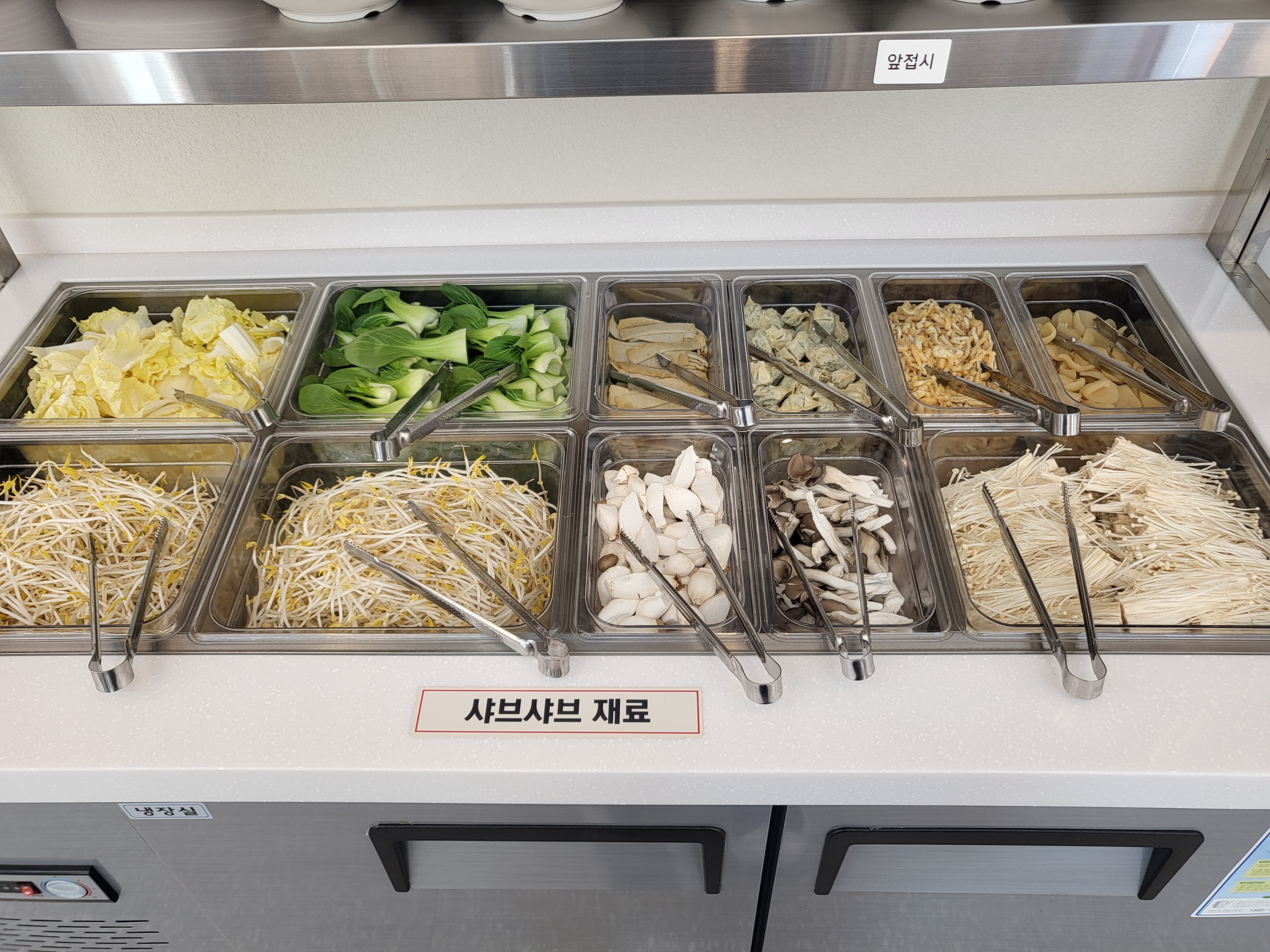 다시 셀프바에 가서 샤브용 야채를 듬뿍 담아 각 육수에 넣어서 먹었답니다. 해물 육수는 딱 아이들이랑 먹기 좋았고 매운 해물 육수는 제 입맛에는 막 맵진 않았지만 와이프는 쫌 맵다고 하더라고요. 그래서 매운 해물 육수는 거의 저 혼자 먹었답니다. 제 입맛에는 신라면이랑 비슷하거나 신라면보다 조금 매운 정도였습니다.