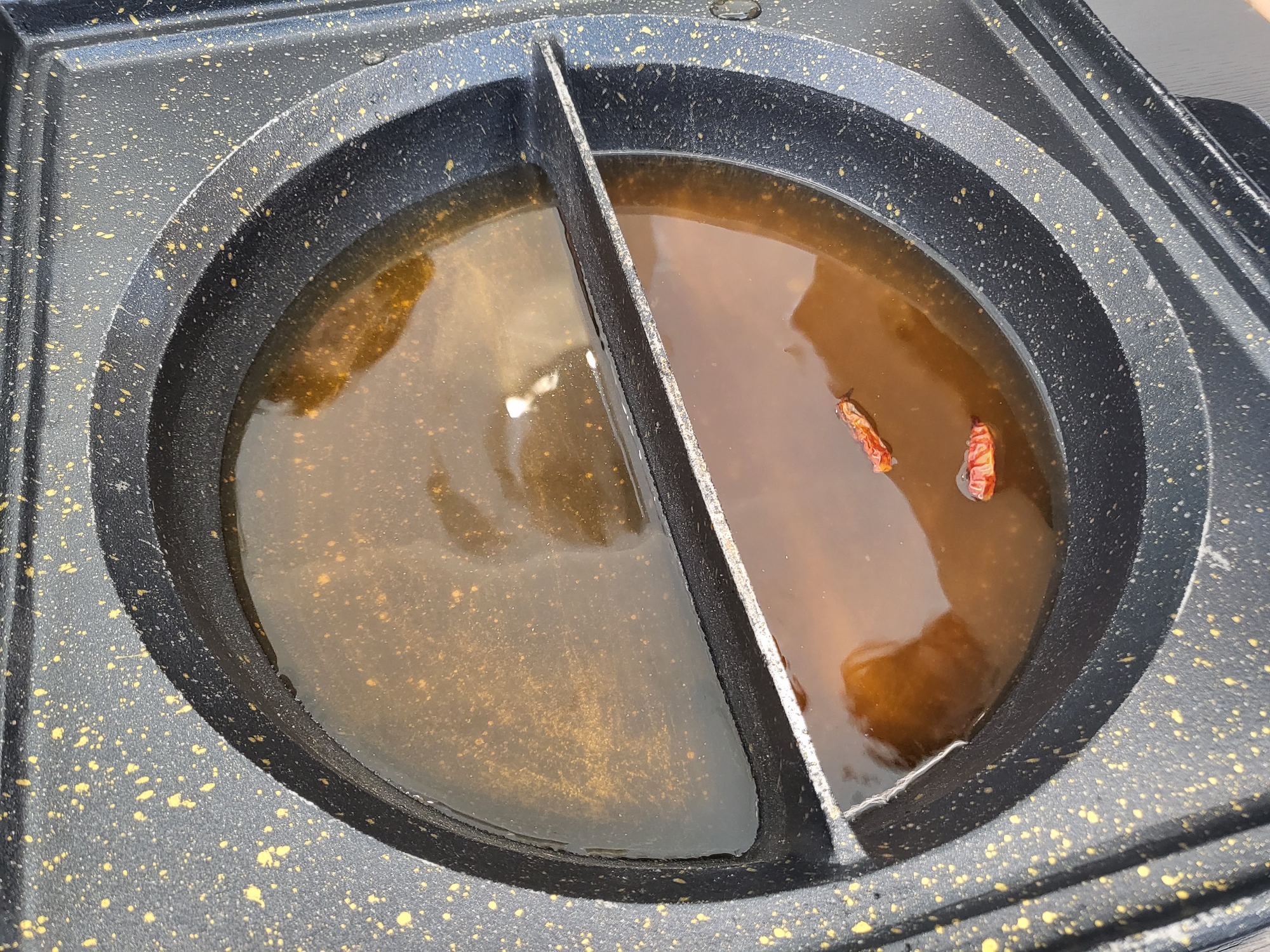 편백찜을 다 먹고 직원을 부르면 찜통을 빼주는데요. 바로 밑에 해물 육수와 매운 해물육수가 담긴 샤브샤브 냄비가 등장했습니다.