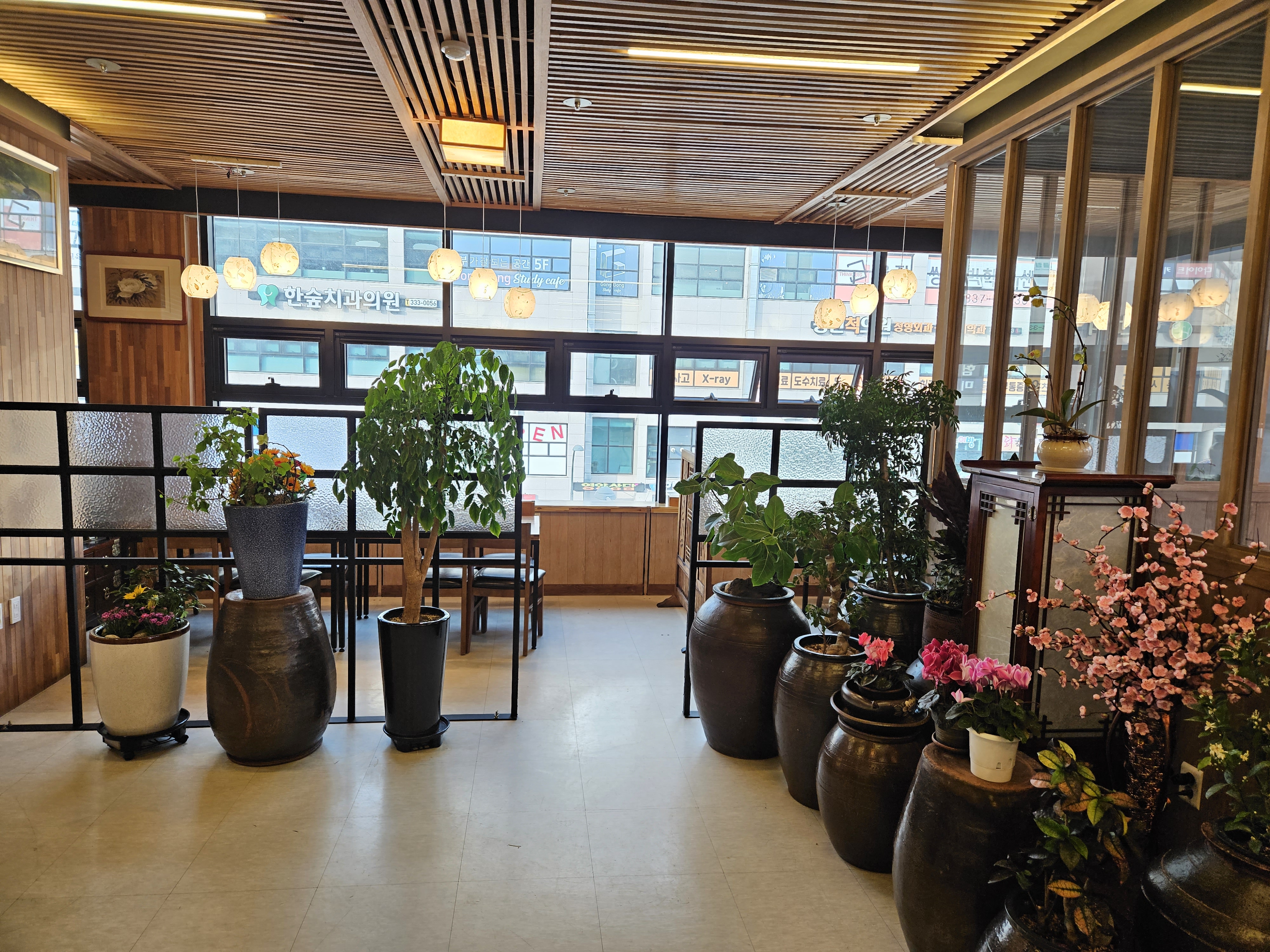 채아 한정식 매장 내부는 넓고 깔끔한데요. 입구에는 화분이 있어 엄청 화사한 느낌을 주고 조명도 엄청 밝지도 않고 은은하니 좋습니다.