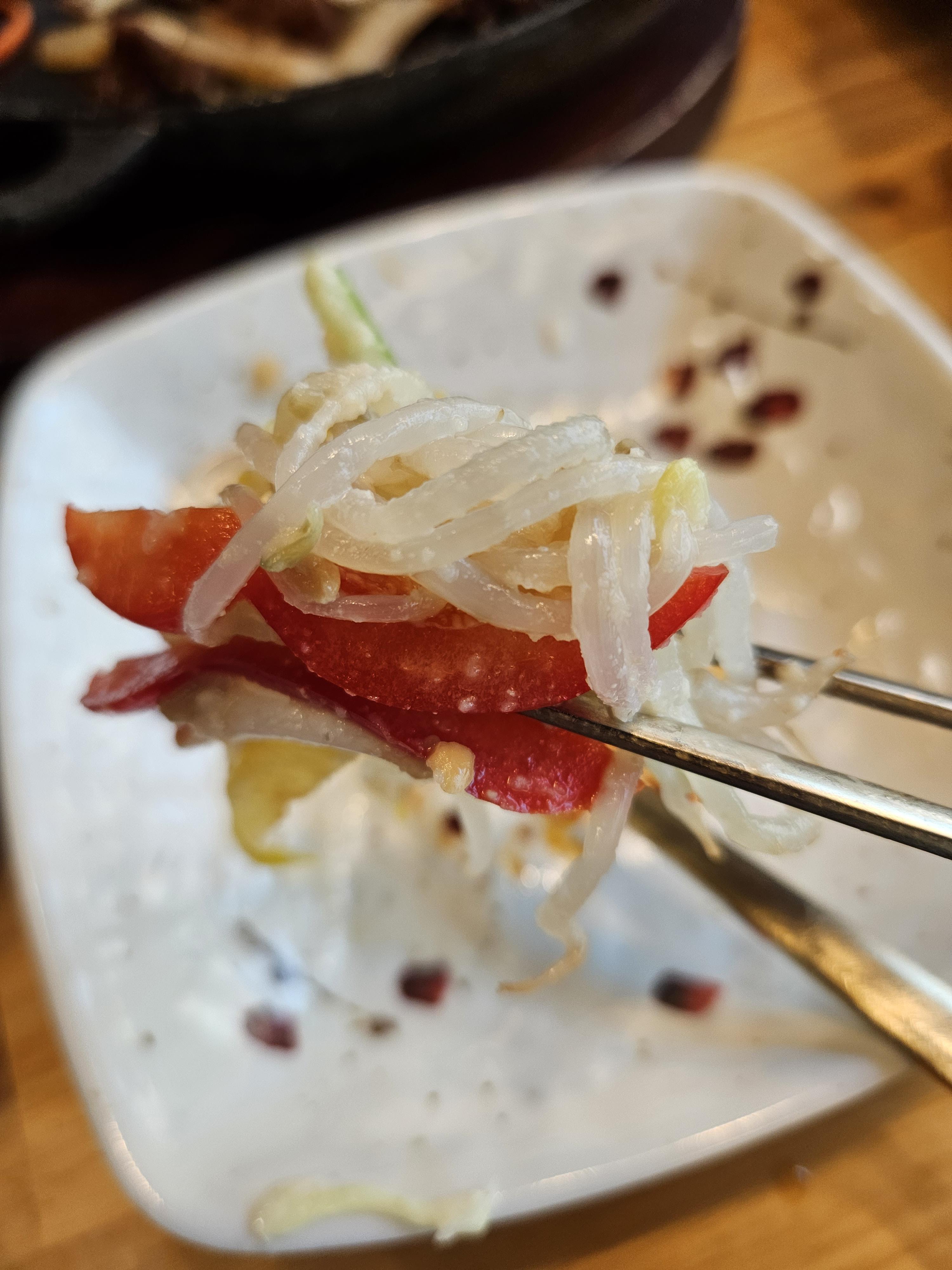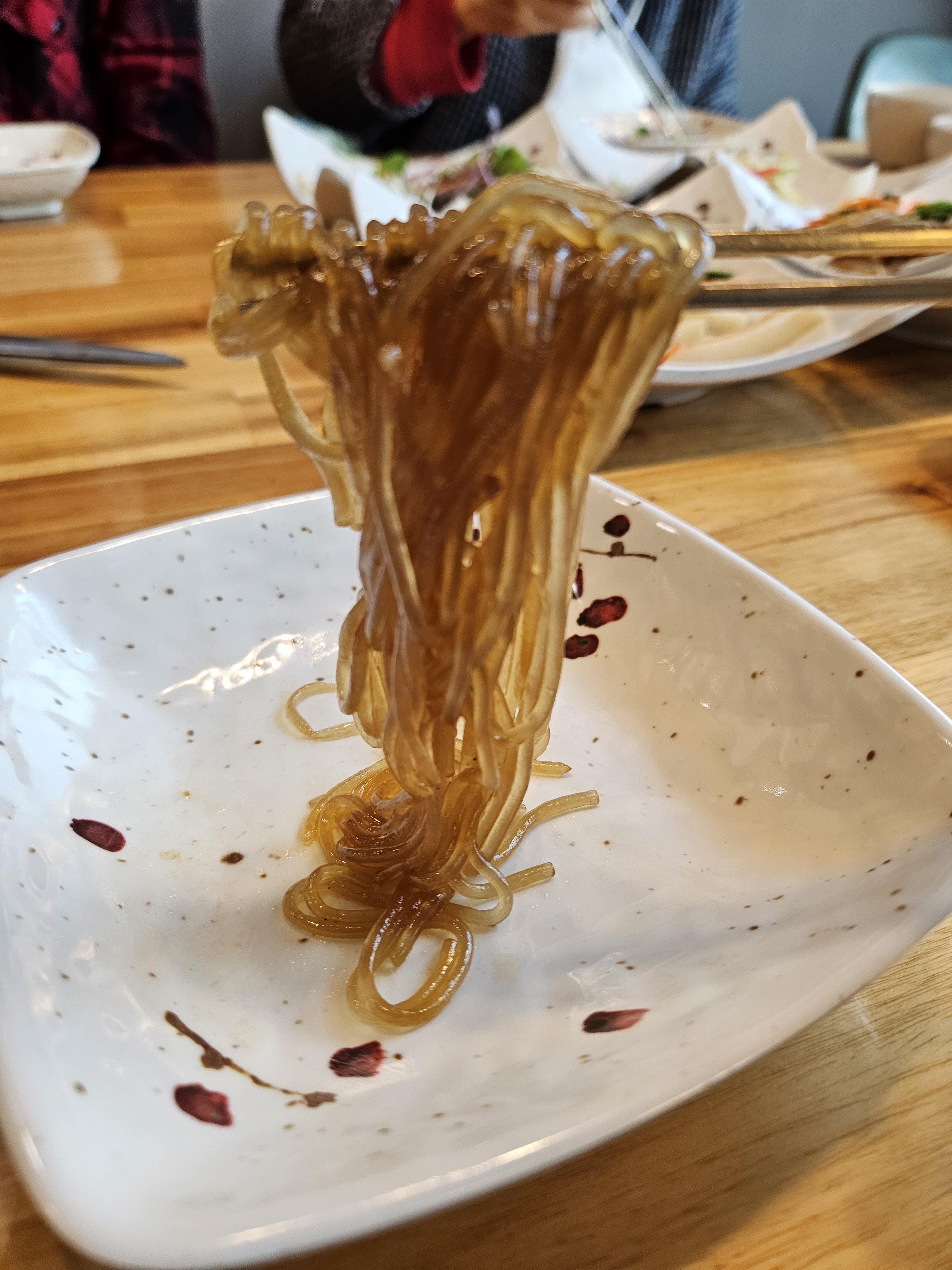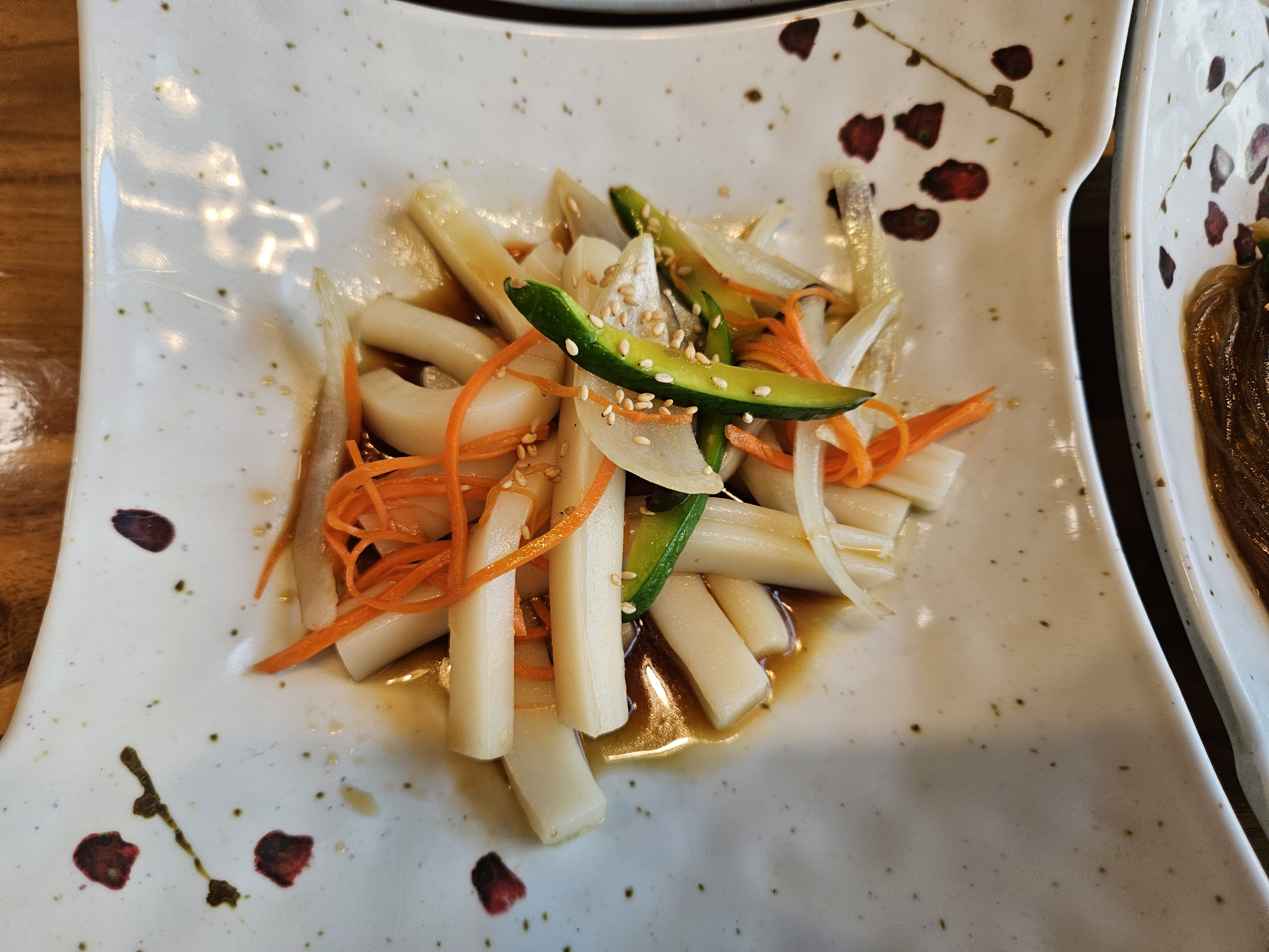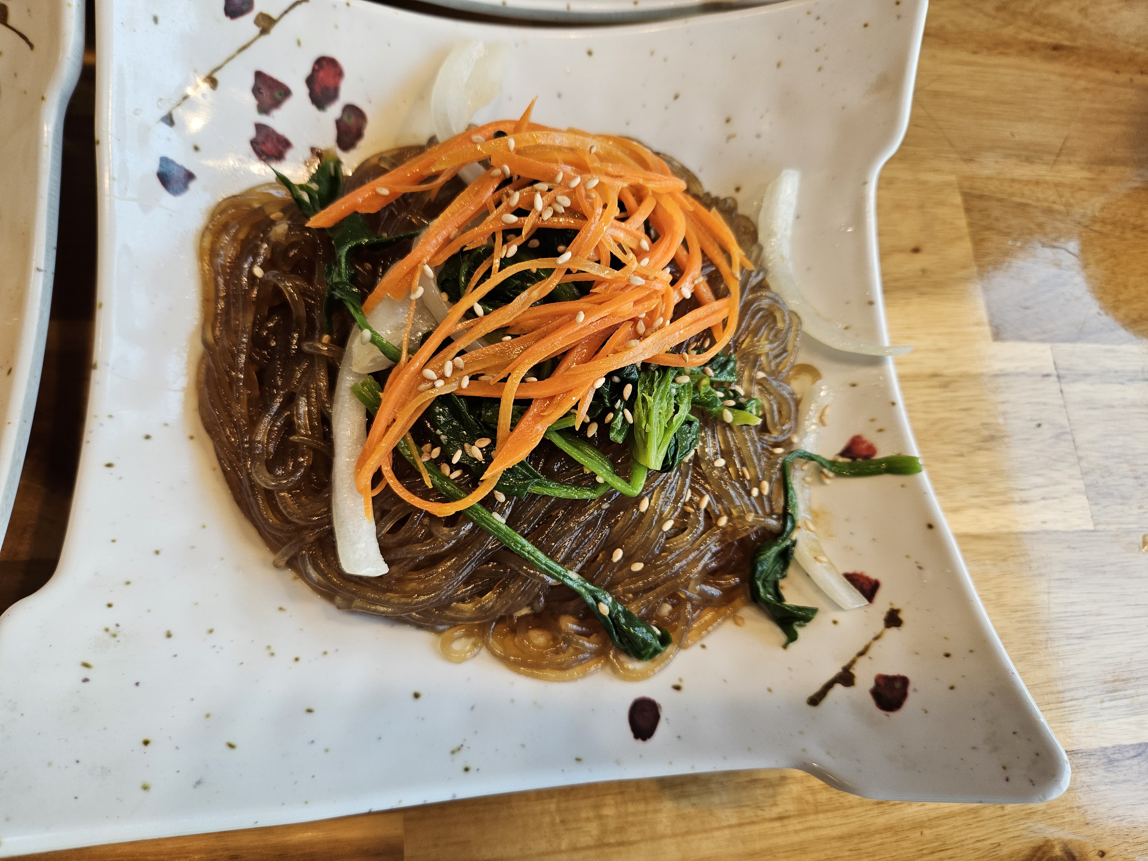 잡채는 우선 짭조름하면서도 막 짜지 않아서 정말 맛있습니다. 그리고 떡잡채는 또한 간장 베이스지만 떡이 쫄깃쫄깃하면서 짜지 않아 맛있는데요. 야채랑 같이 먹으면 아삭아삭한 식감이 더해져서 더 맛있습니다.