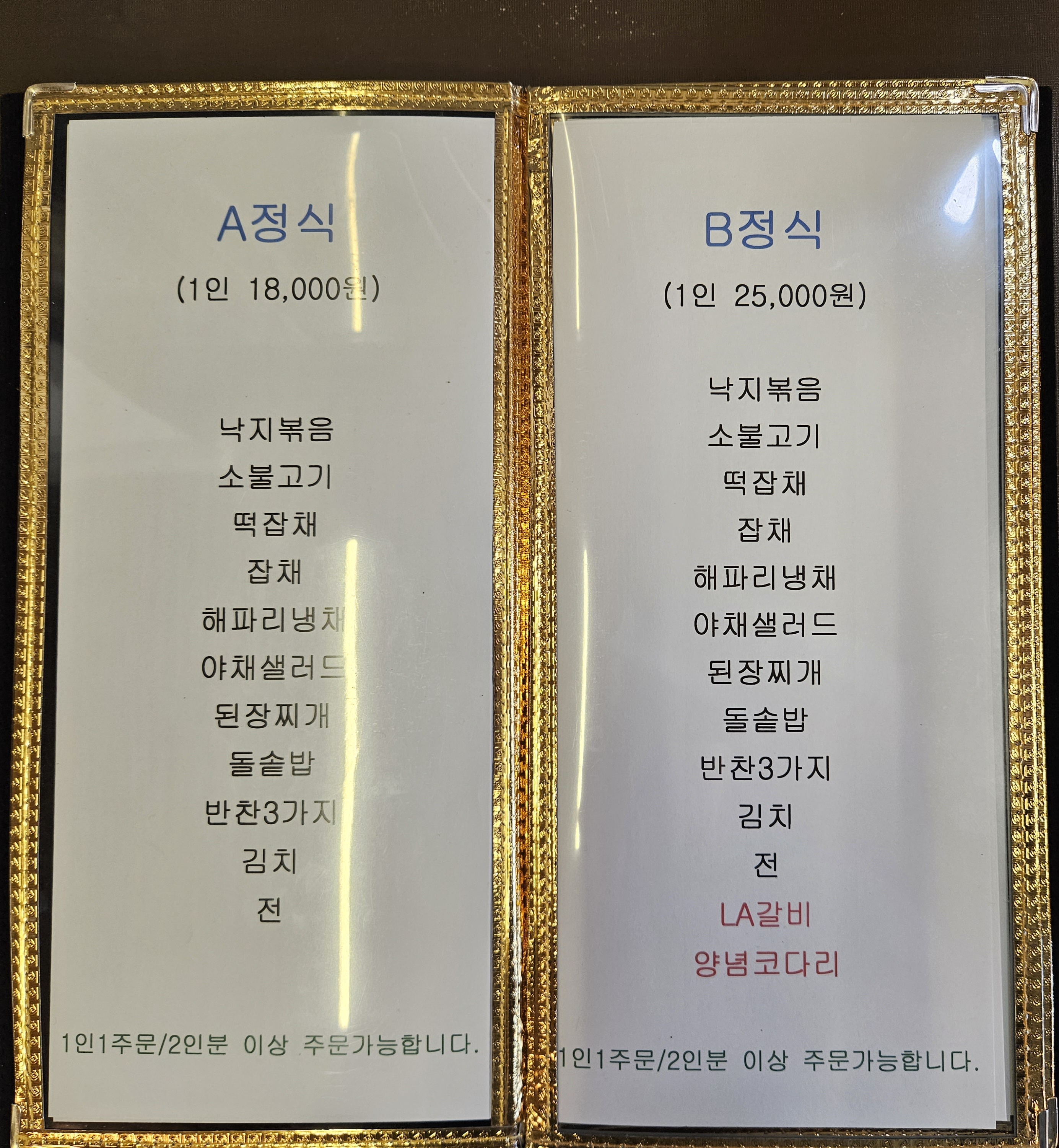 메뉴는 A정식 혹은 B정식으로 정말 심플한데요. B정식을 시키면 A정식보다 LA갈비, 양념코다리 반찬이 추가로 나옵니다.