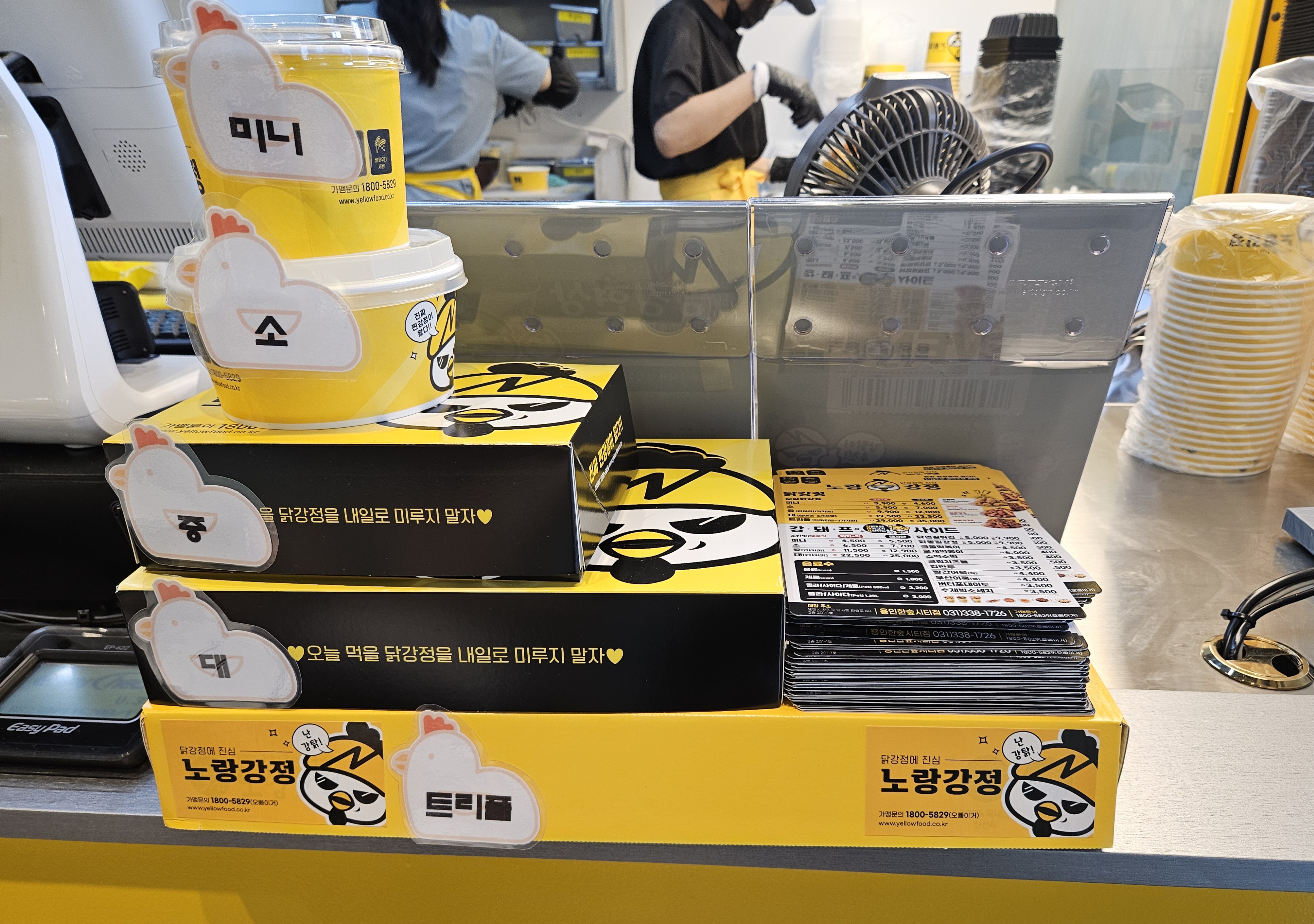 개인적으로 닭요리를 좋아하는데 닭강정에 진심이라고 하니 기대가 되었고 노랑강정 캐릭터가 개인적으로 엄청 귀엽더라고요. 결제는 외부에 위치한 키오스크를 이용해 결제하는 시스템으로 되어있어 키오스크를 이용해 트리플 박스(강정+떡)를 주문해 보았습니다.