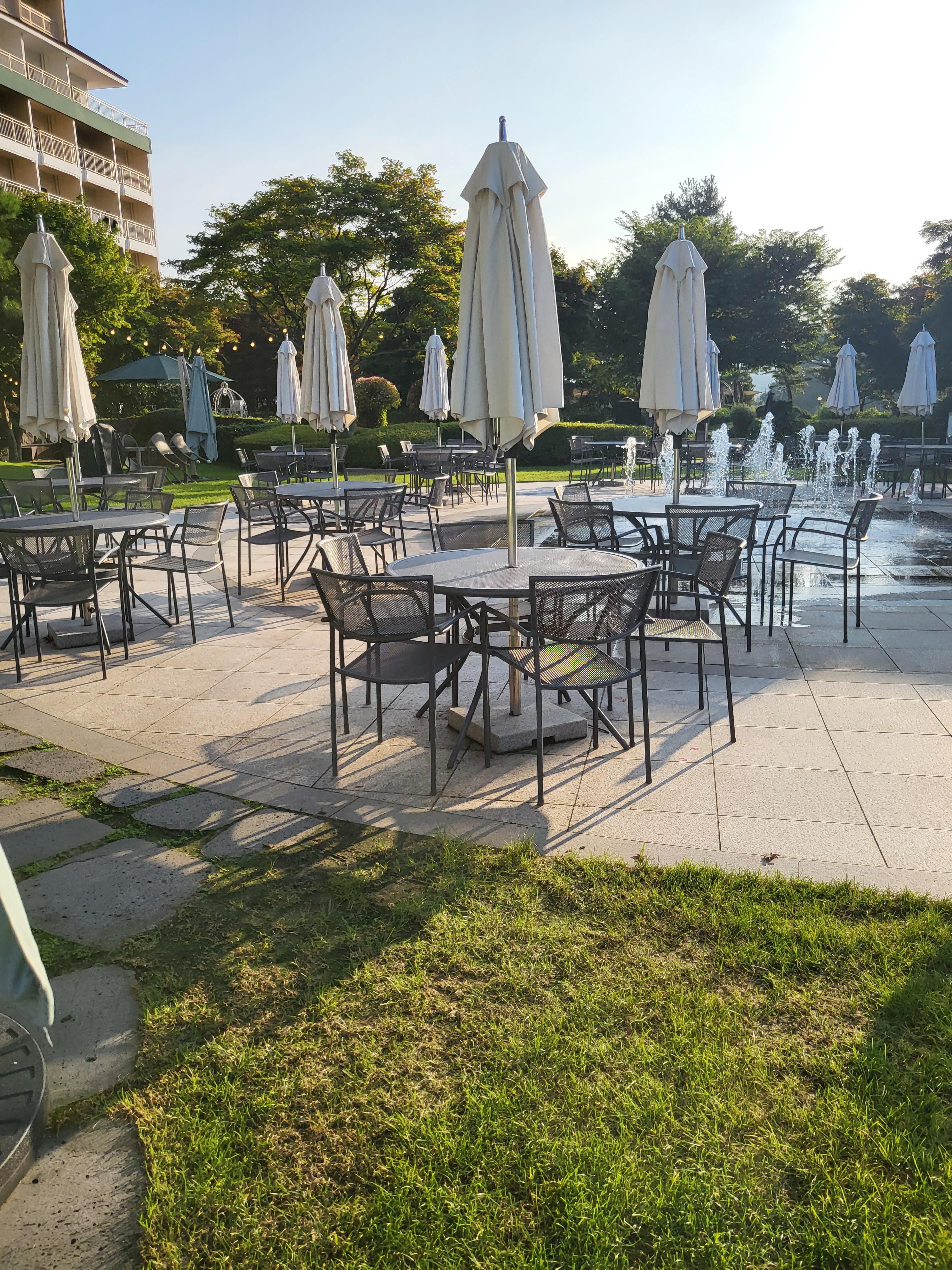 그릴을 이용해야 하기 때문에 야외 정원으로 안내를 해주었고 옆에 분수와 함께 뷰는 정말 좋았습니다. 공기도 좋고 자리도 평일이어서 한산한 덕분에 중앙에 좋은 자리로 안내해주시더라고요.