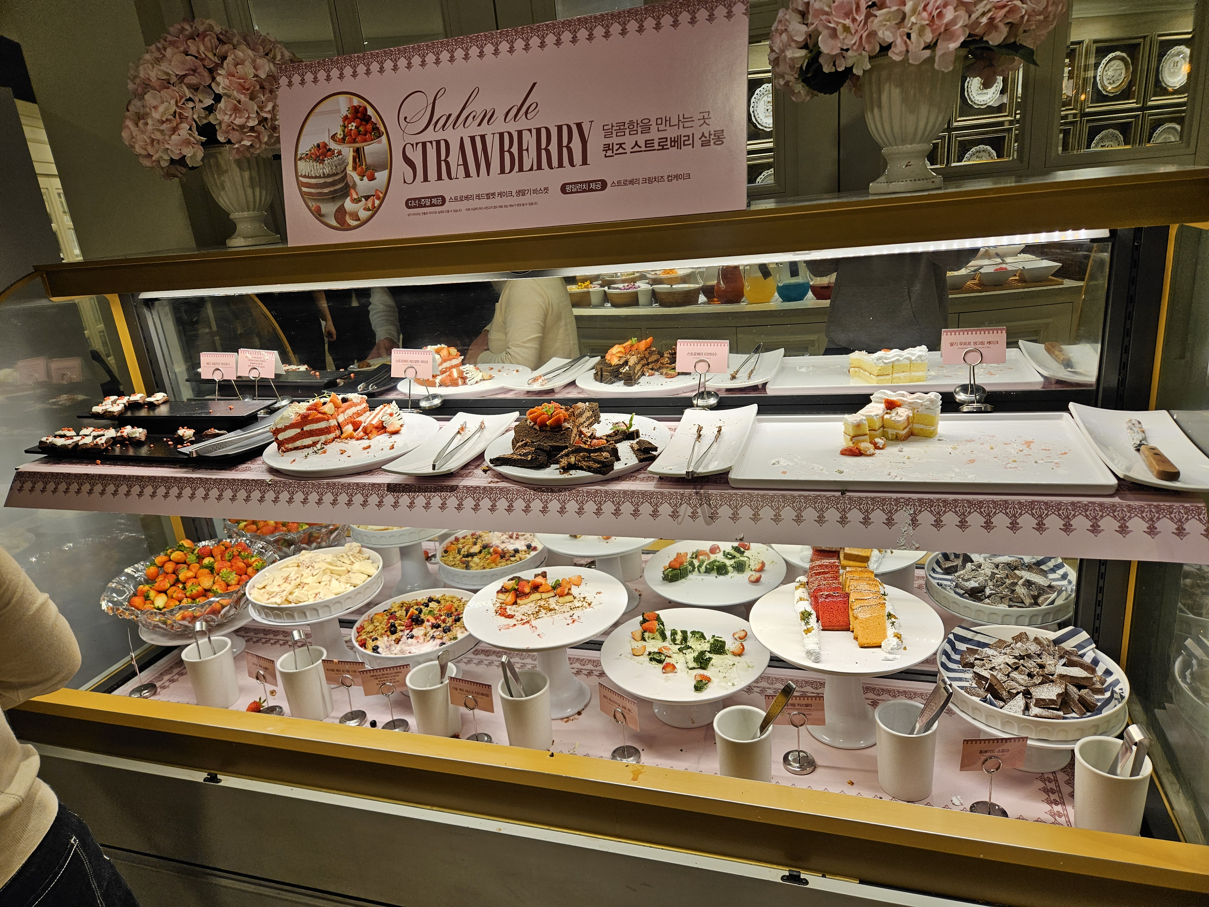 그리고 스트로베리 케이크 후식도 쭉 진열되어 있고 화이트초콜릿 분수와 와플기계 등등 음식 외에도 다양한 후식들도 많아 좋았는데요.