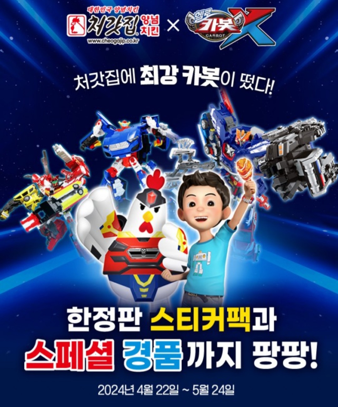 처갓집양념치킨 헬로카봇X 콜라보 행사기간은 2024년 4월 22일 ~ 5월 24일까지 진행 중이며 헬로카봇 세트는 처갓집양념치킨 전용앱으로만 주문가능합니다. 혜택으론 스티커팩(3종 /각 1매) 선착순 증정, 초이락 인기 장난감(100명), 슈프림양념치킨(200명)은 추첨을 통해 증정해 준다고 합니다. 보다 자세한 사항은 처갓집양념치킨 전용앱을 알아보시길 바랍니다.