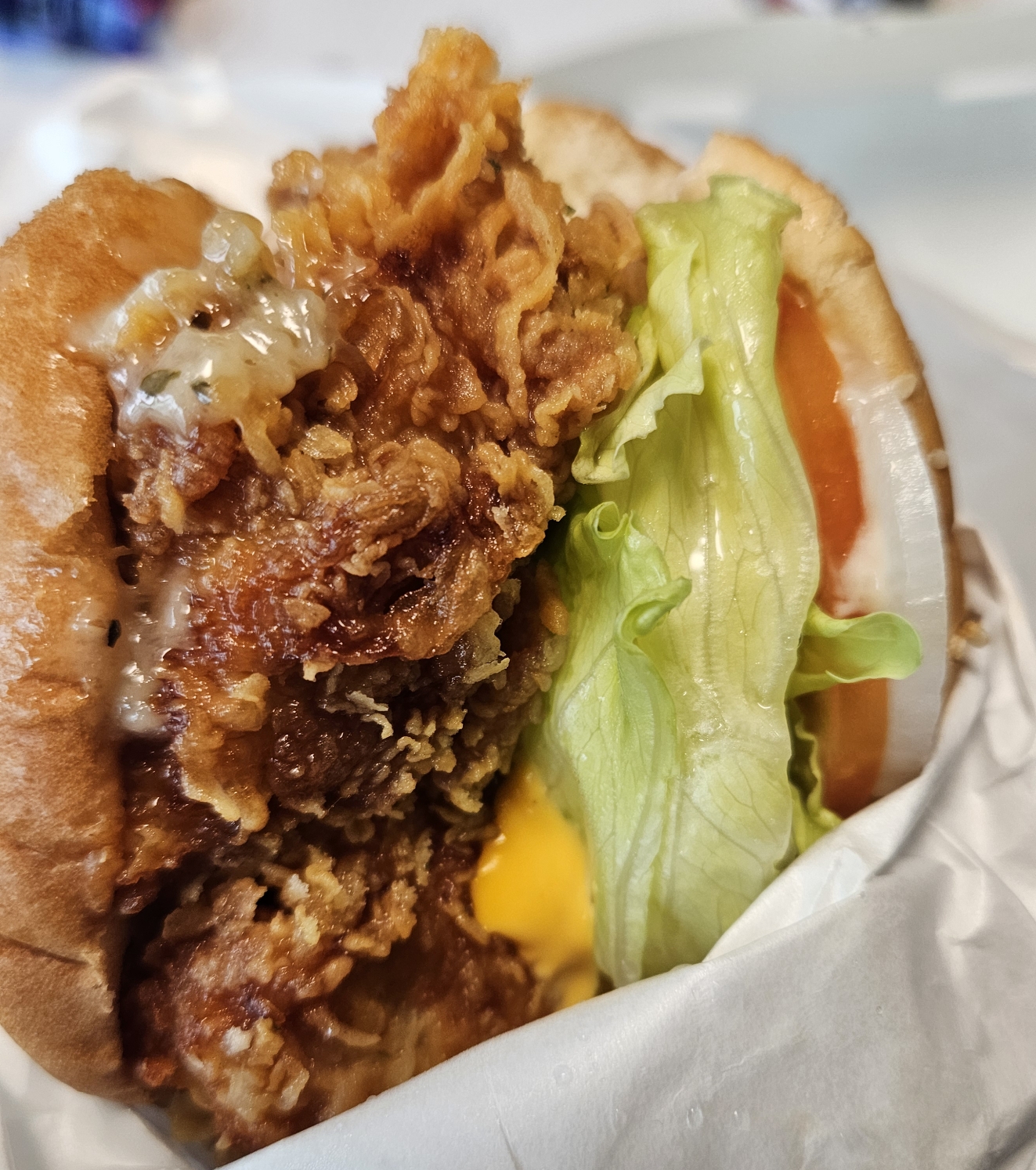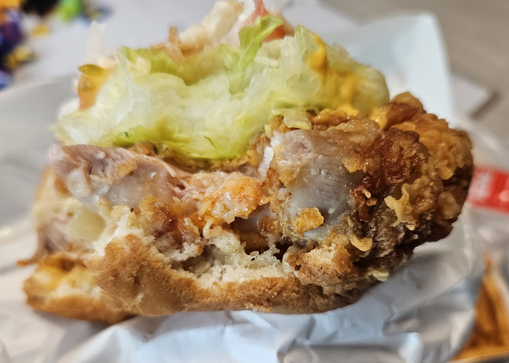 일단 포장지가 엄청 크길래 햄버거도 클 거라고 생각했지만 그렇게 크게 느껴지진 않더라고요. 패티 또한 돈가스 넣은 것처럼 옆으로 많이 튀어나오는 줄 알았지만 그렇지 않았습니다.
