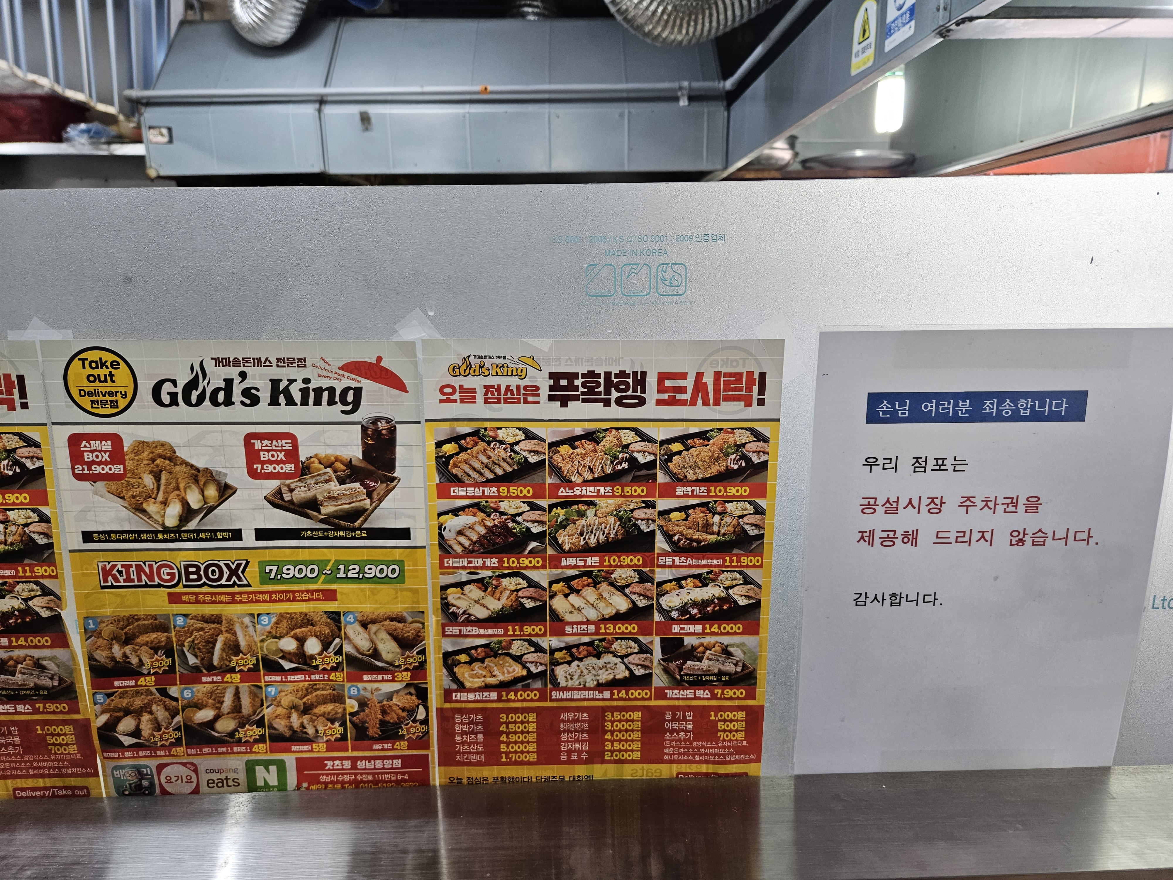 식당 입구 앞에는 여름특별 메뉴로 콩국수, 돈냉면, 비빔면, 물냉면도 판매한다는 POP과 튀김종류를 판매하는 모습을 볼 수 있었습니다. 튀김만 따로 포장해 가는 사람들도 많았는데요.