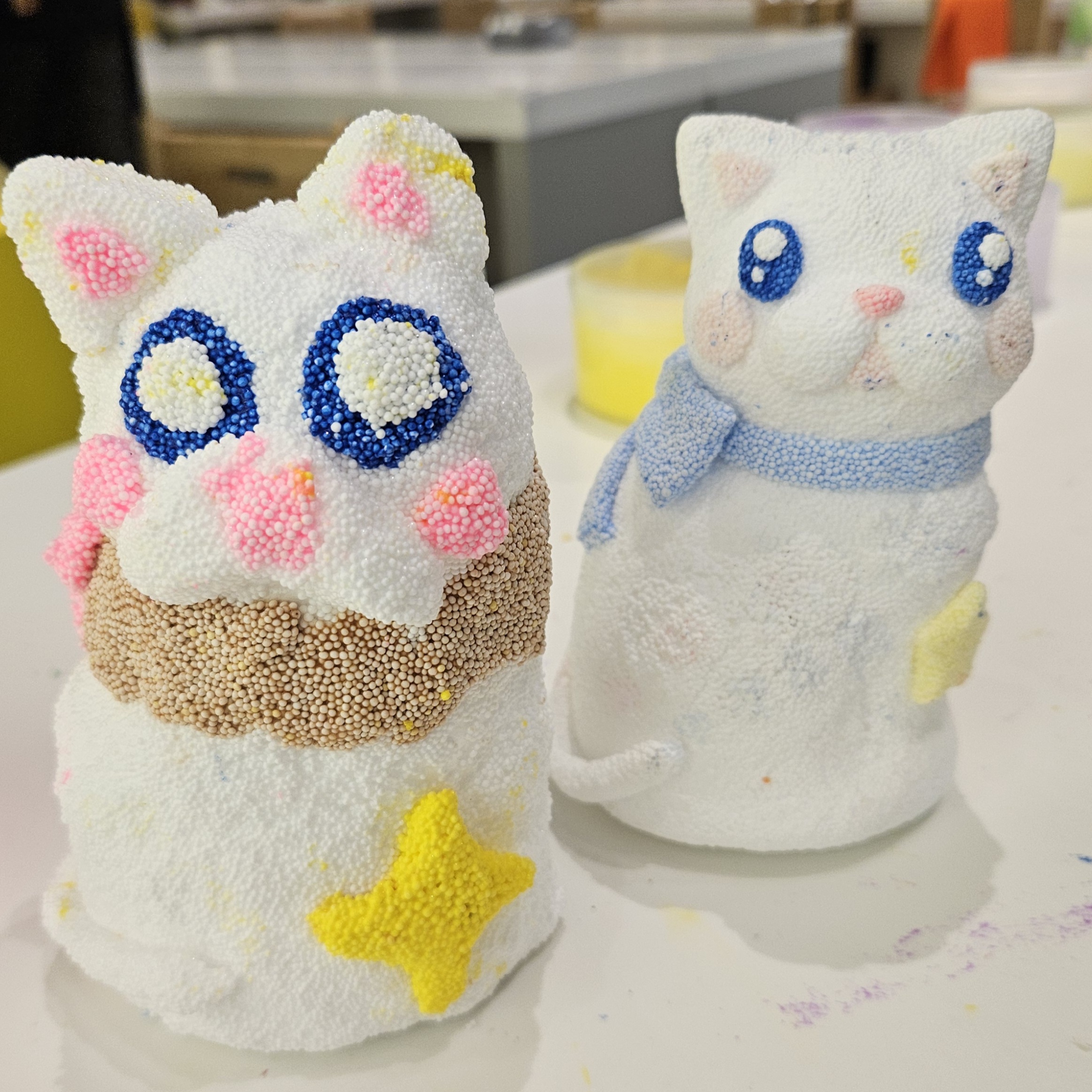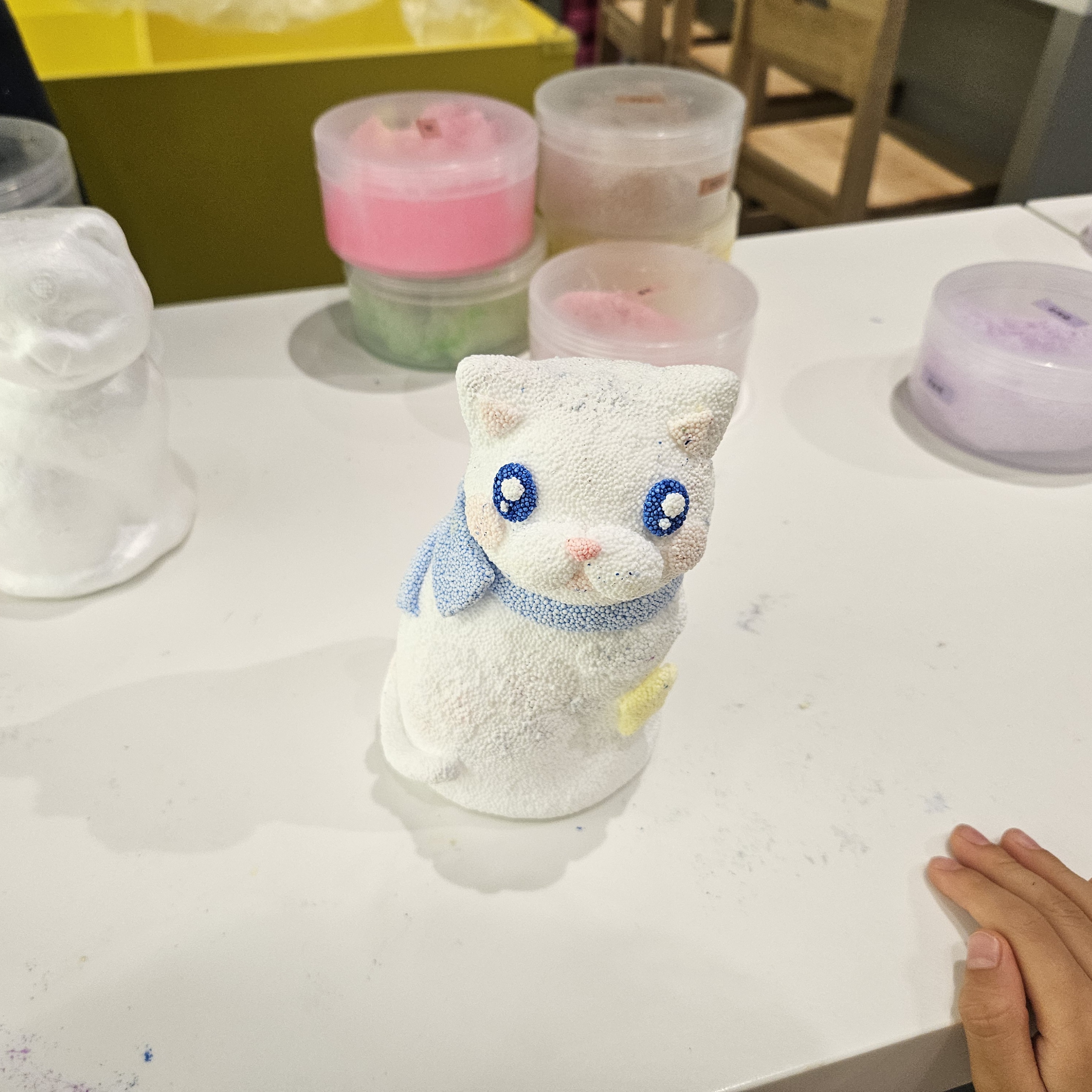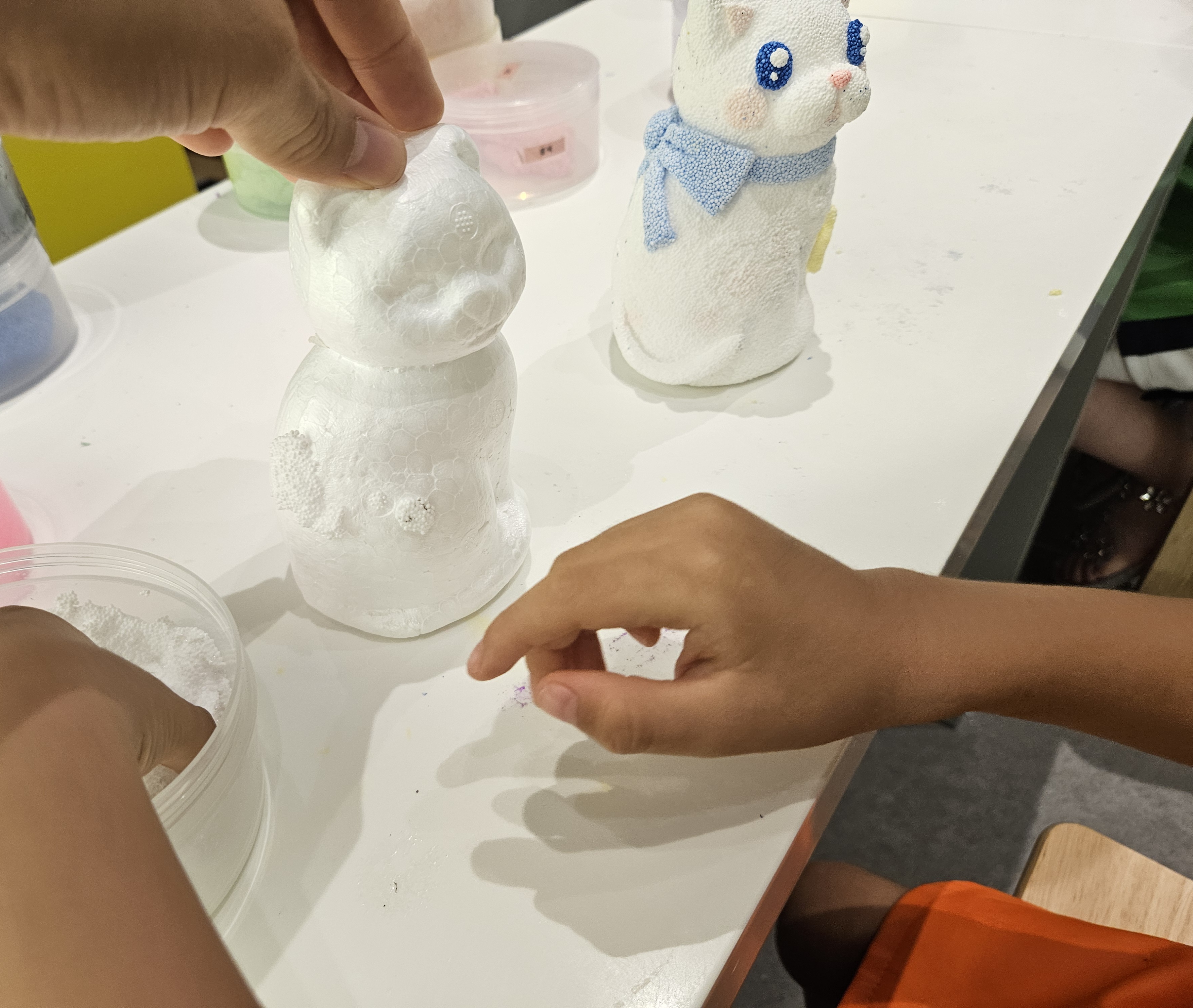 조그마한 손으로 만지작만지작 거리면서 열심히 흰색폼을 플라스틱 고양이한테 덮어주기 시작했는데요. 중간중간 도와주긴 했지만 본인도 재미있는지 열심히 하더라고요.