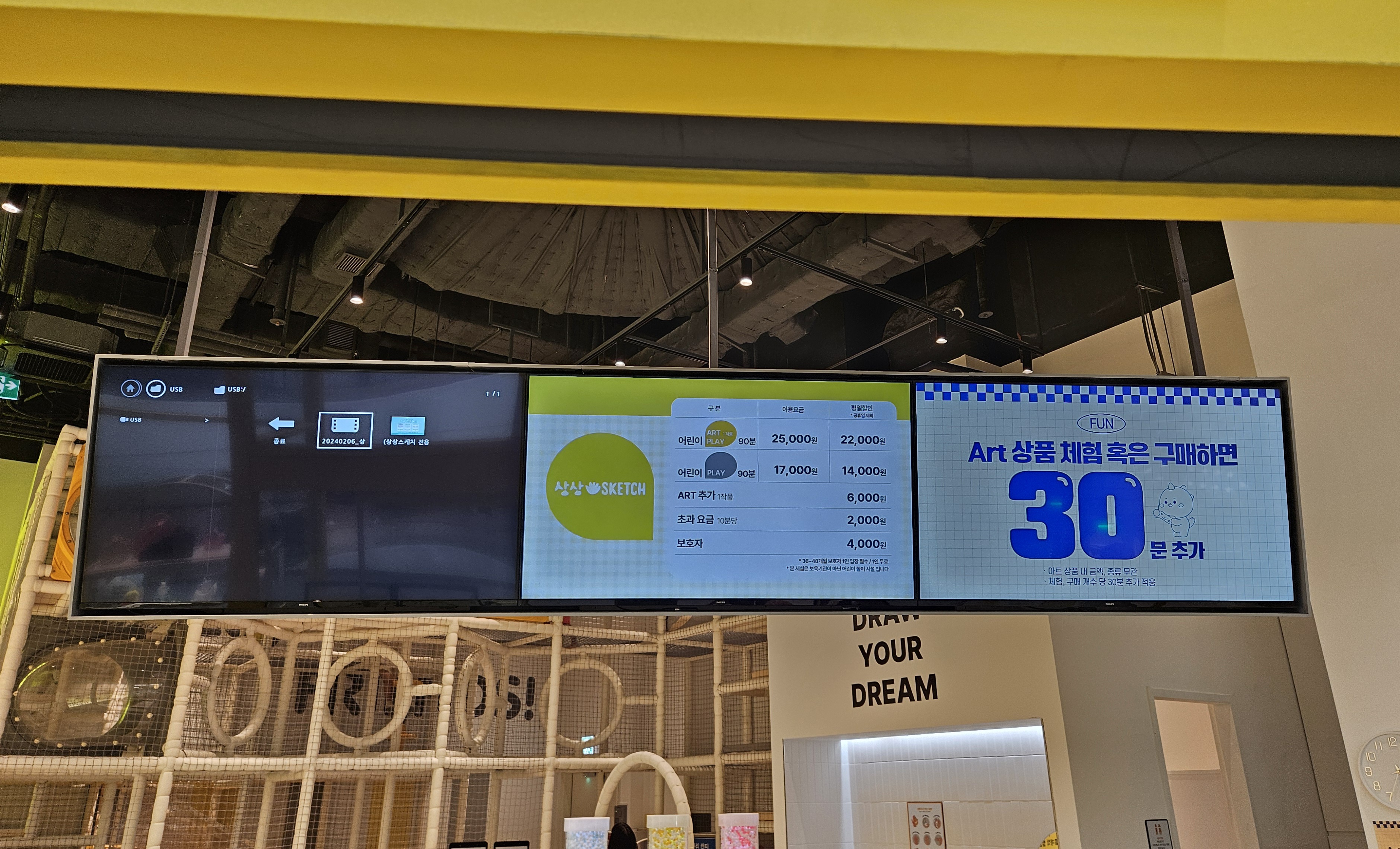 수원 스타필드 상상스케치 이용금액은 이와 같습니다. 평일 기준 만들기 1개 포함 22,000원, 놀이시설만 이용 시 14,000원이더라고요. 주말, 공휴일 방문 시 만들기 1개 포함 25,000원, 놀이시설만 이용 시 17,000원이라고 되어있었는데요. 이용시간은 총 90분이며, 그 외 만들기 추가 시 6,000원(추가시간 X), 이용시간 10분 초과 시 2,000원 추가요금발생, 보호자 입장료는 4,000원이었습니다.