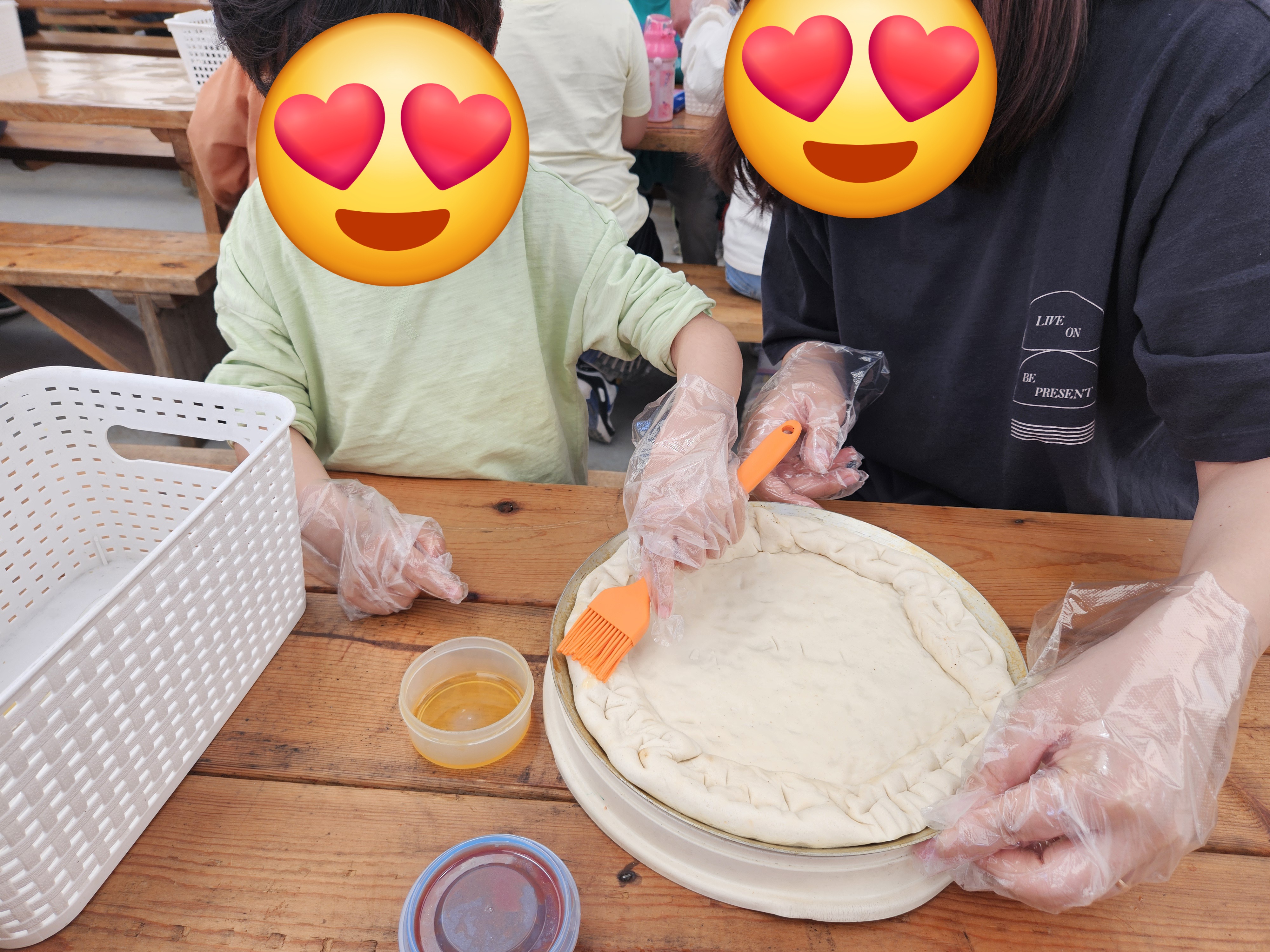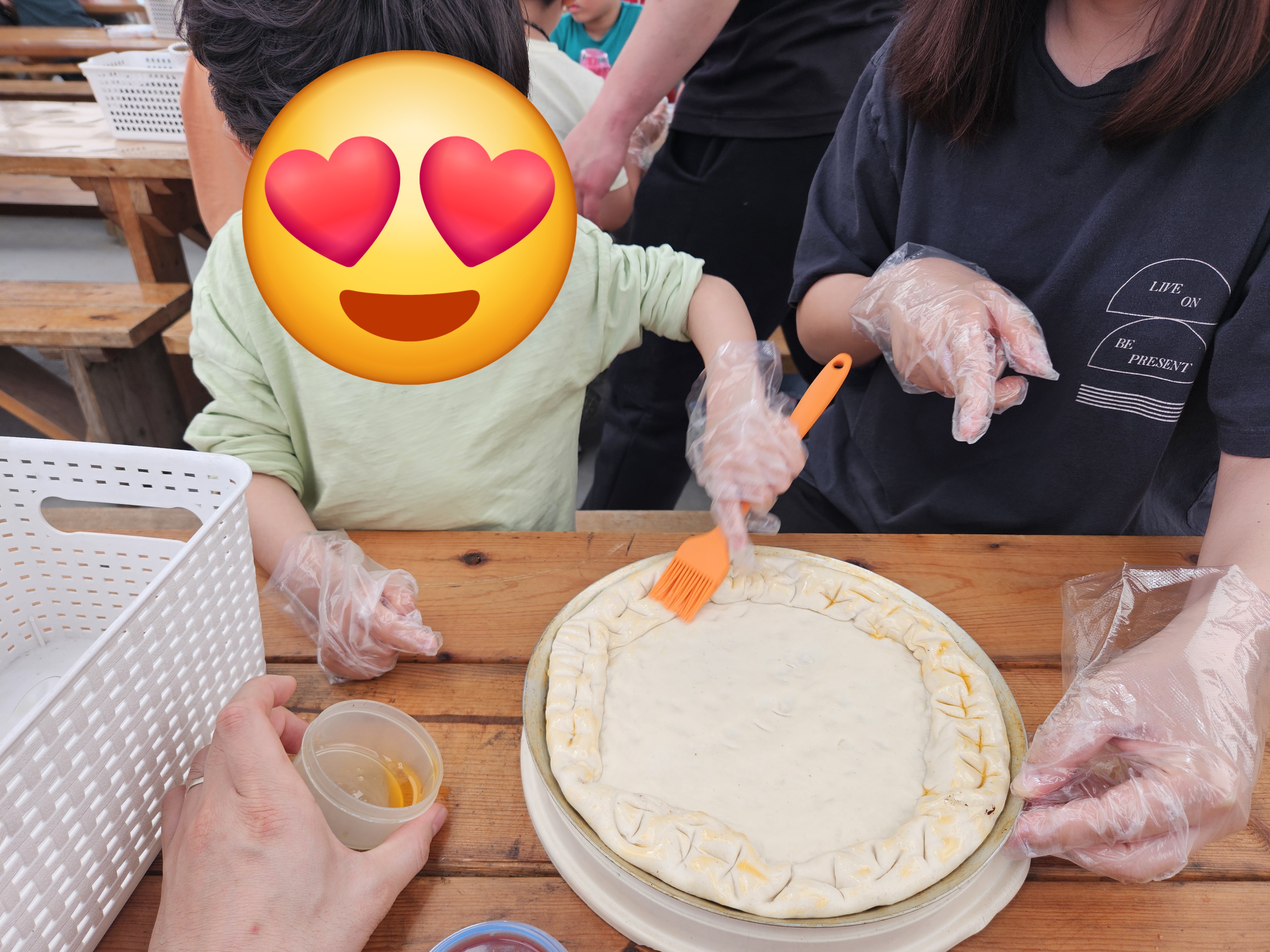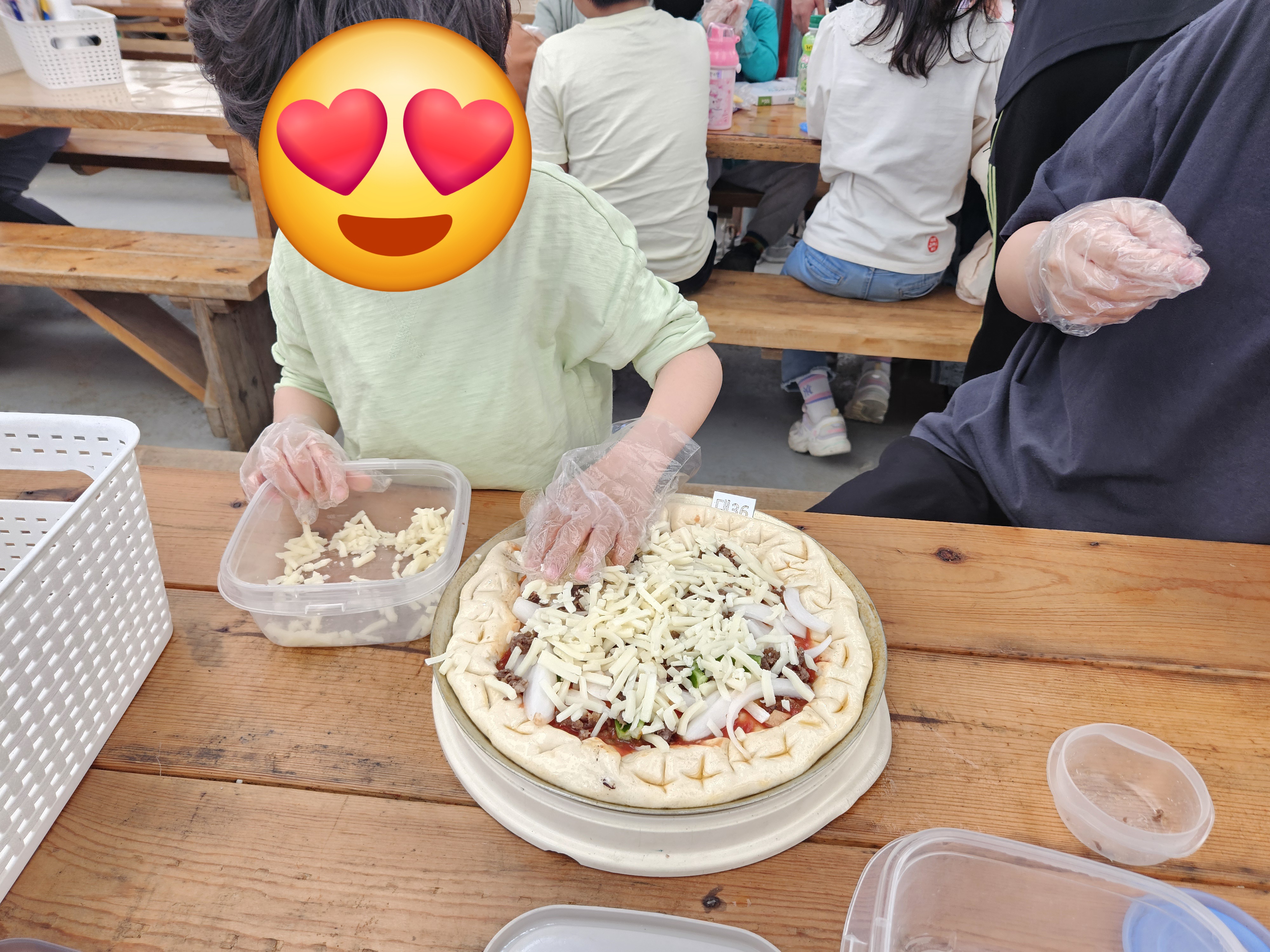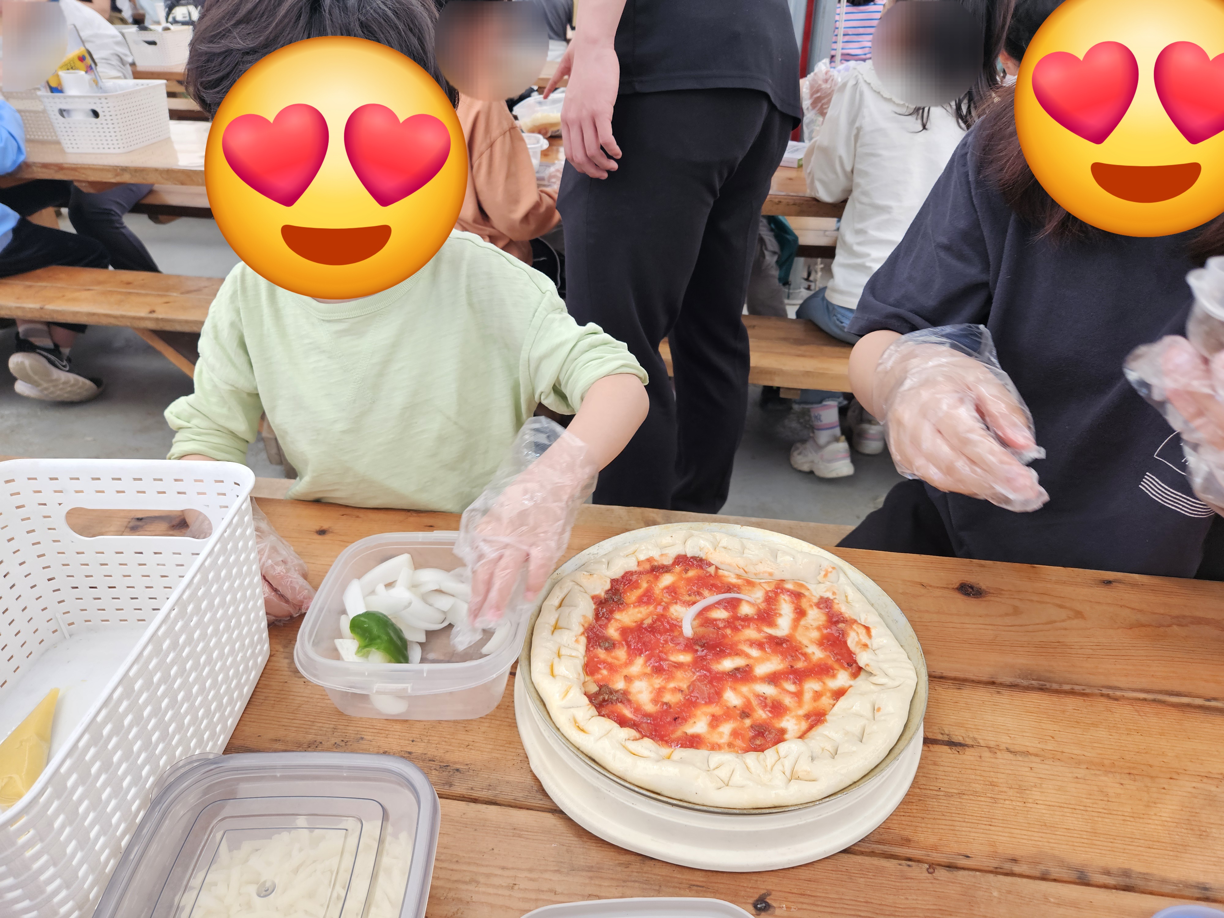 마지막 모차렐라 치즈 위에 고구마로 장식하고 자기 자신이 뿌듯했는지 사진 찍어달라고 해서 한 장 찍어줬습니다. 다 만든 피자는 다른 피자랑 안 섞이게 숫자 표시를 해놓고 직원분들이 가지고 가더라고요.