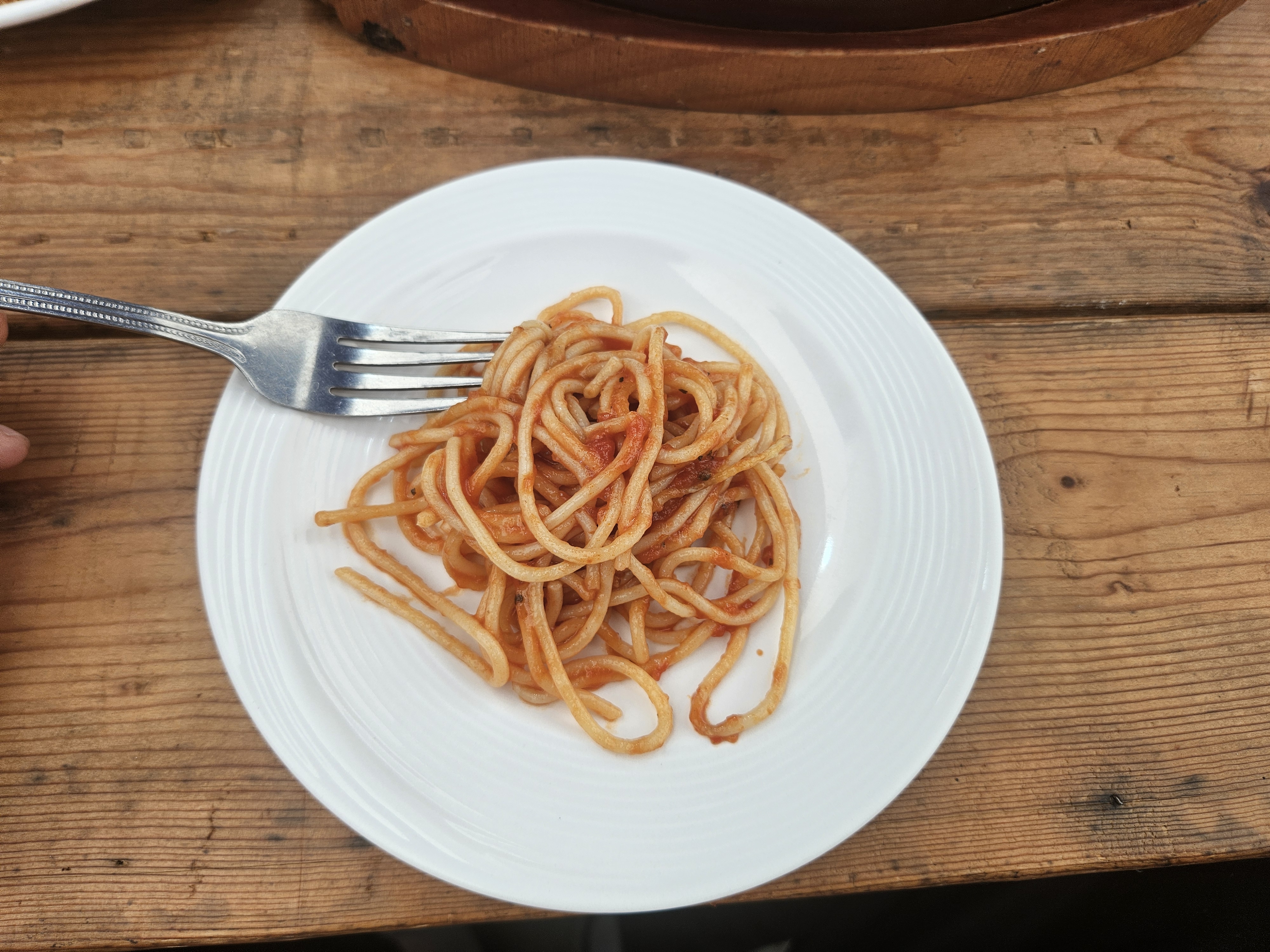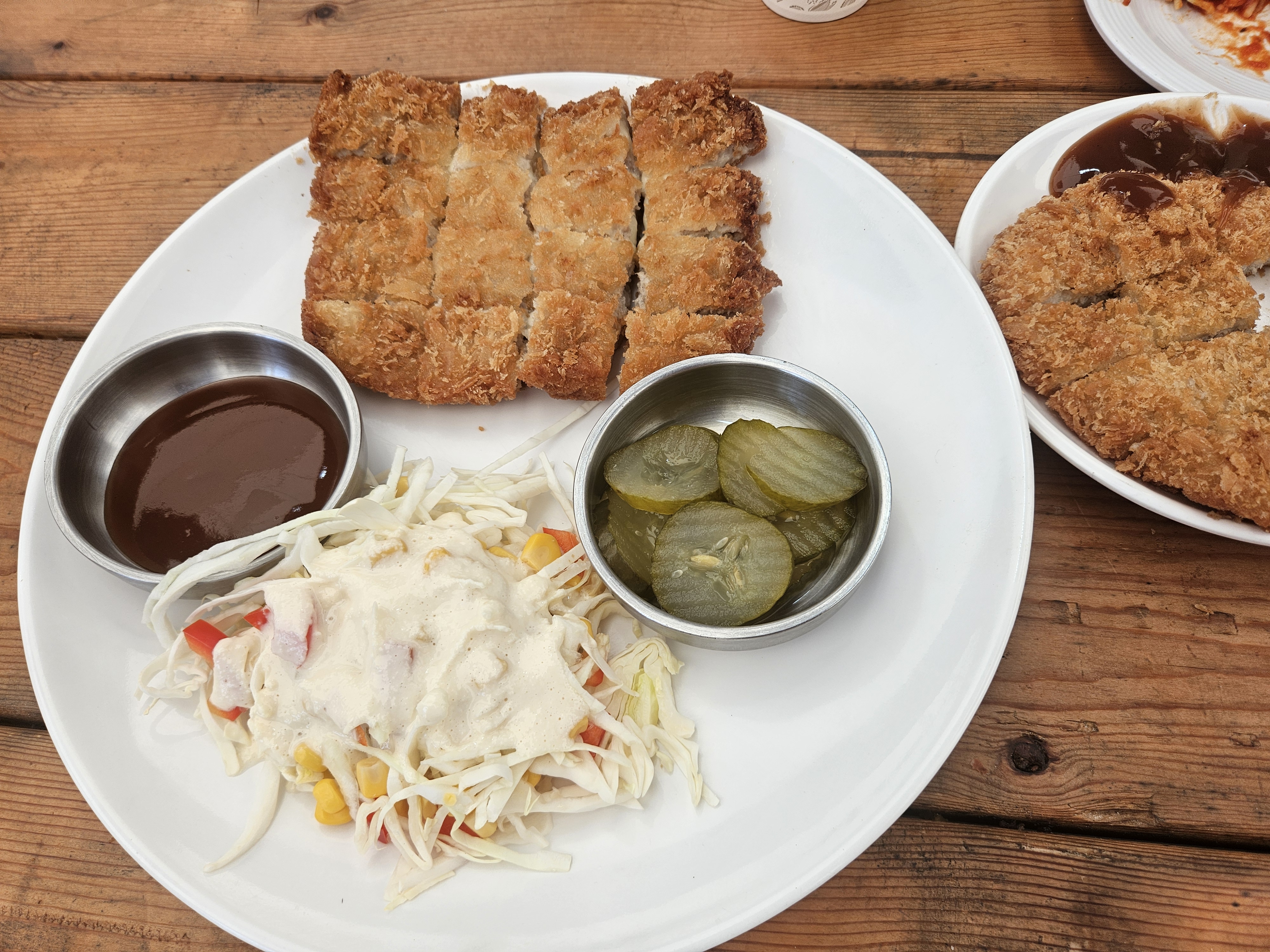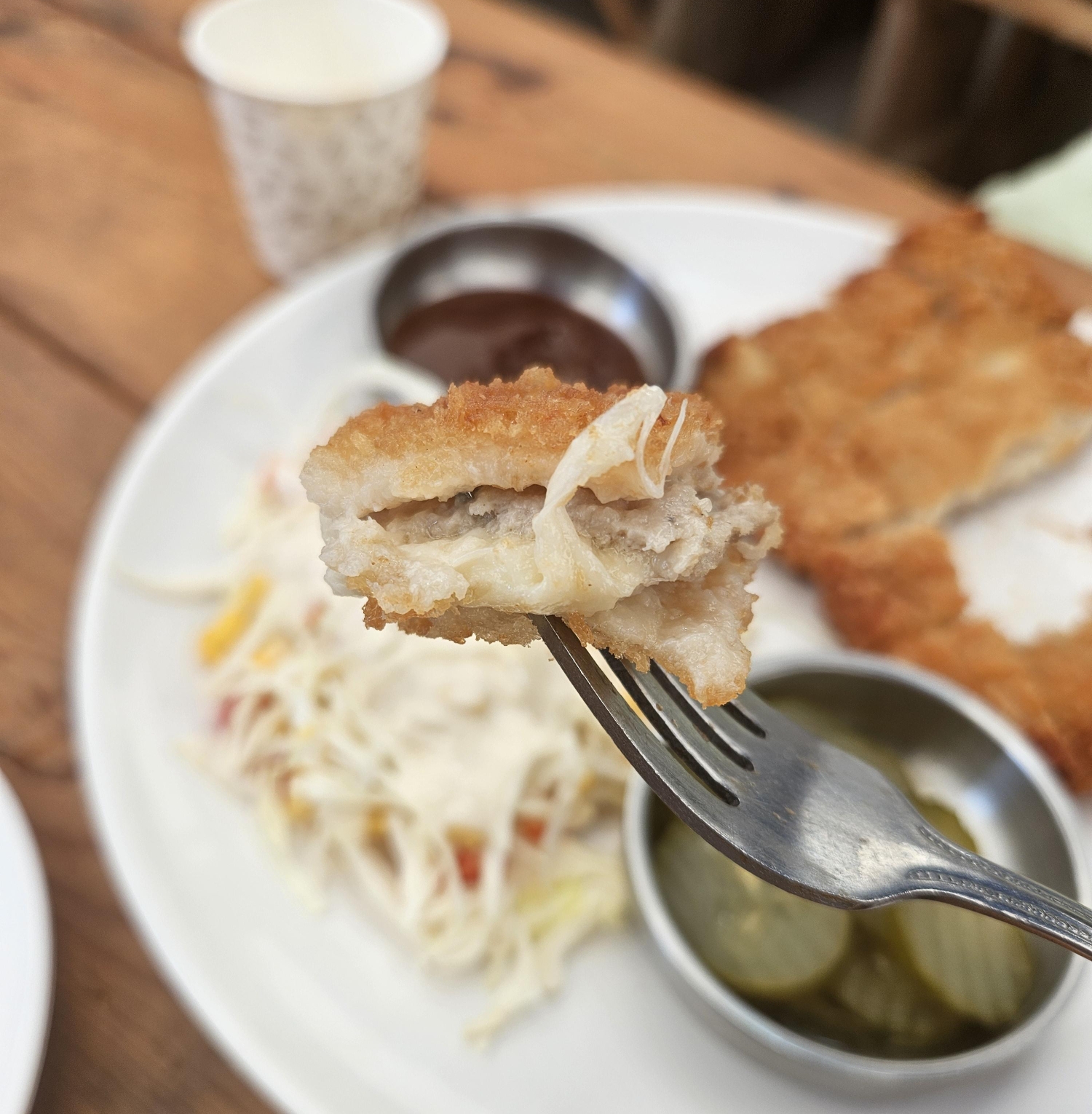 우선 스파게티 맛은 그냥 평범한 토마토스파게티 맛이었습니다. 치즈가 더 듬뿍 얹혀있었다면 더 맛있었을 텐데 조금 아쉽더라고요. 그리고 치즈돈가스로 알고 있던 메뉴가 일반 돈가스로 나오길래 프로모션이 바뀌었나 보다 했는데요. 알고 보니 단체로 온 아이들에게 나눠줘야 할 돈가스를 저희에게도 주셨더라고요.