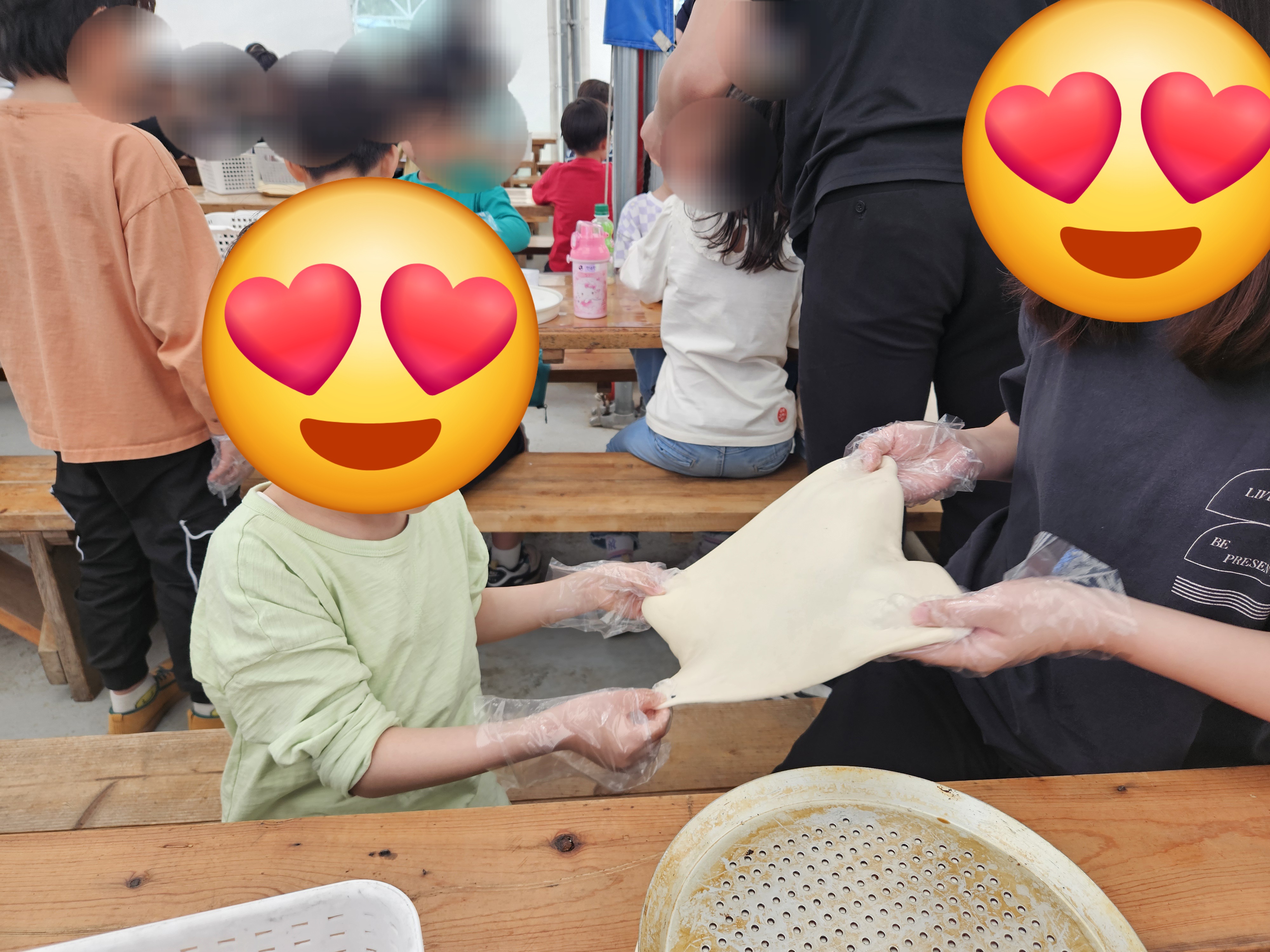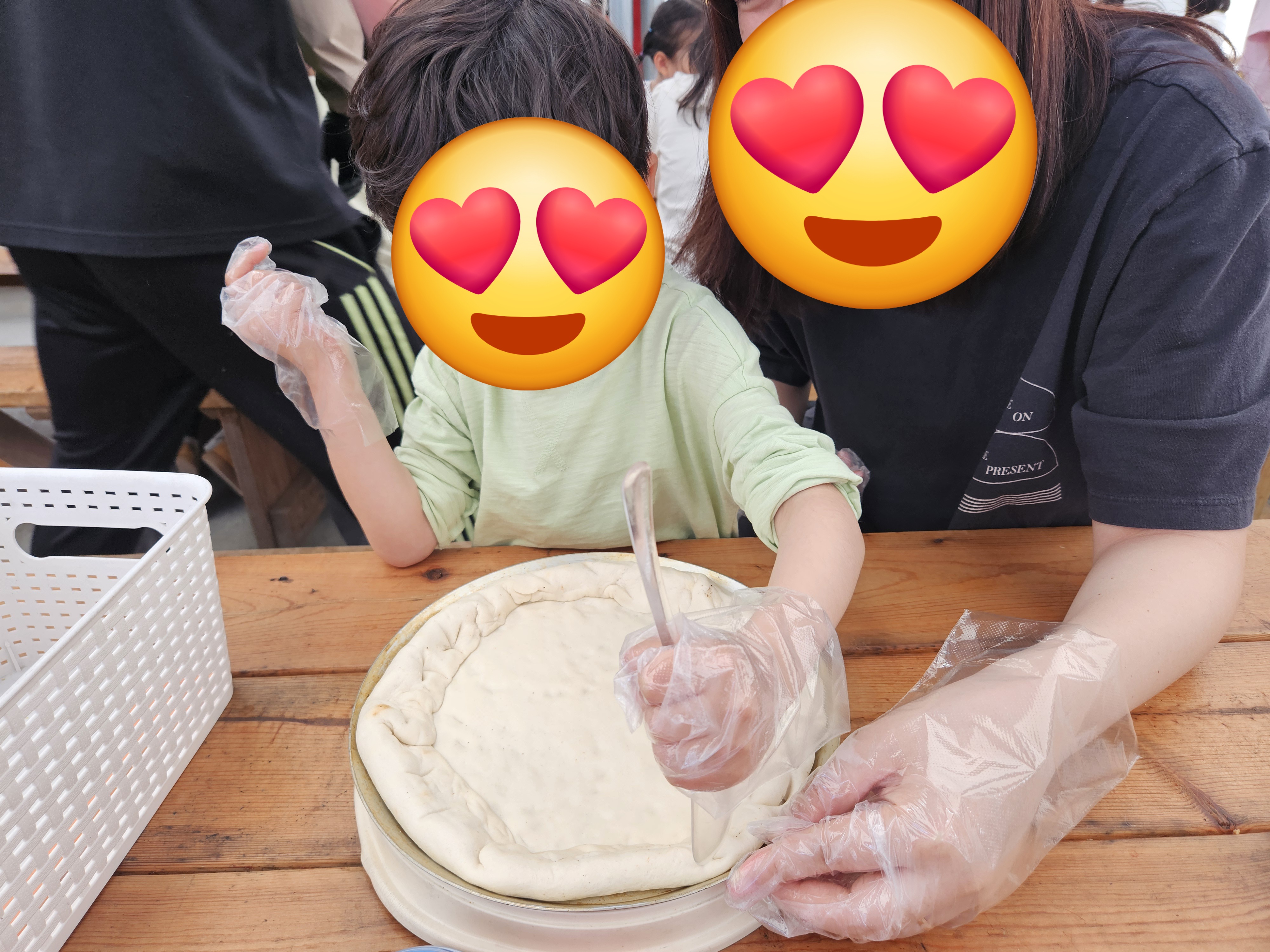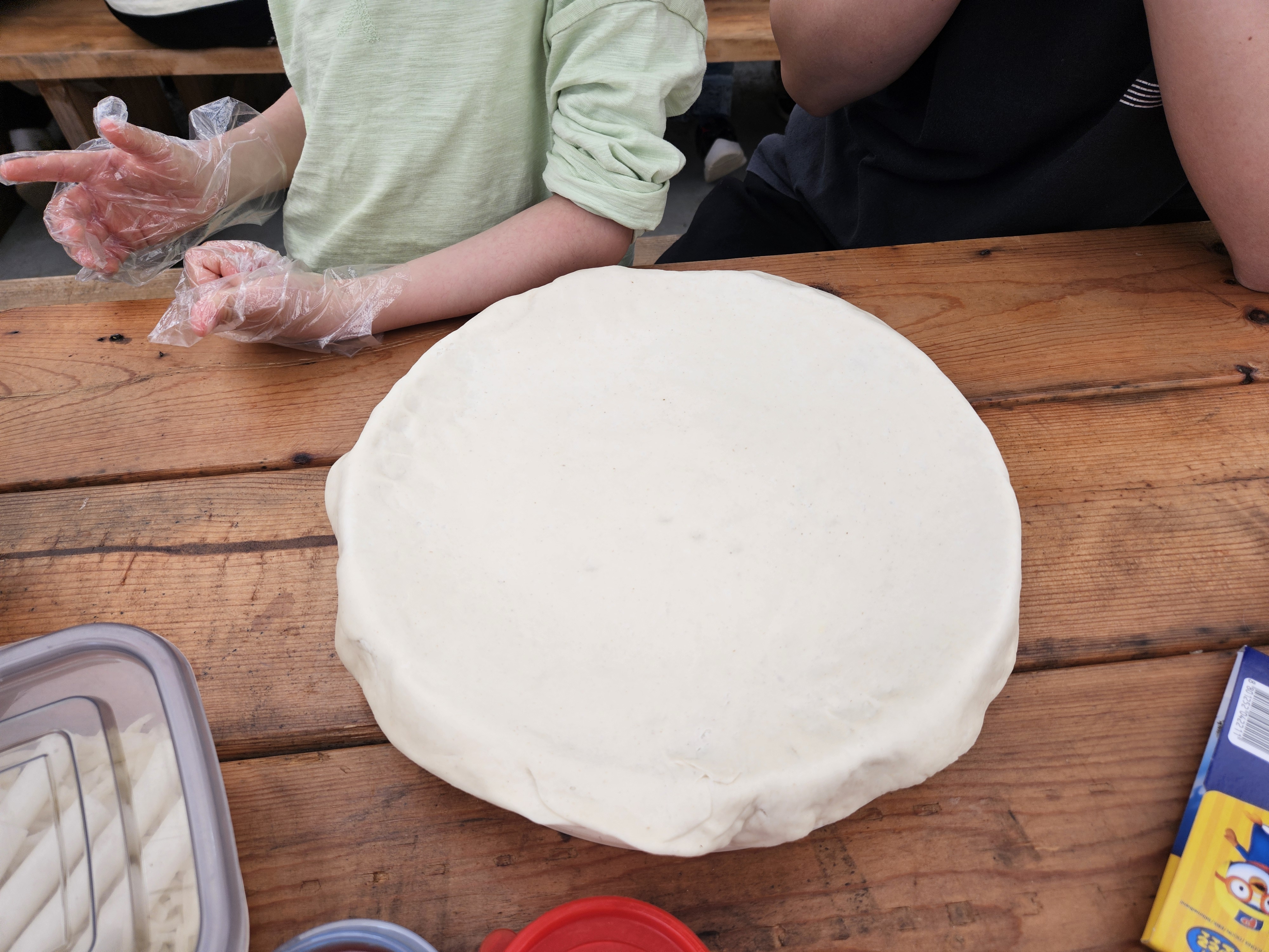 그렇게 드디어 선생님의 설명과 함께 피자 만들기 시작!! 우선 반죽되어 있는 도우를 쭉쭉 늘려주라고 하더라고요. 아들이 어찌나 즐거워하던지.