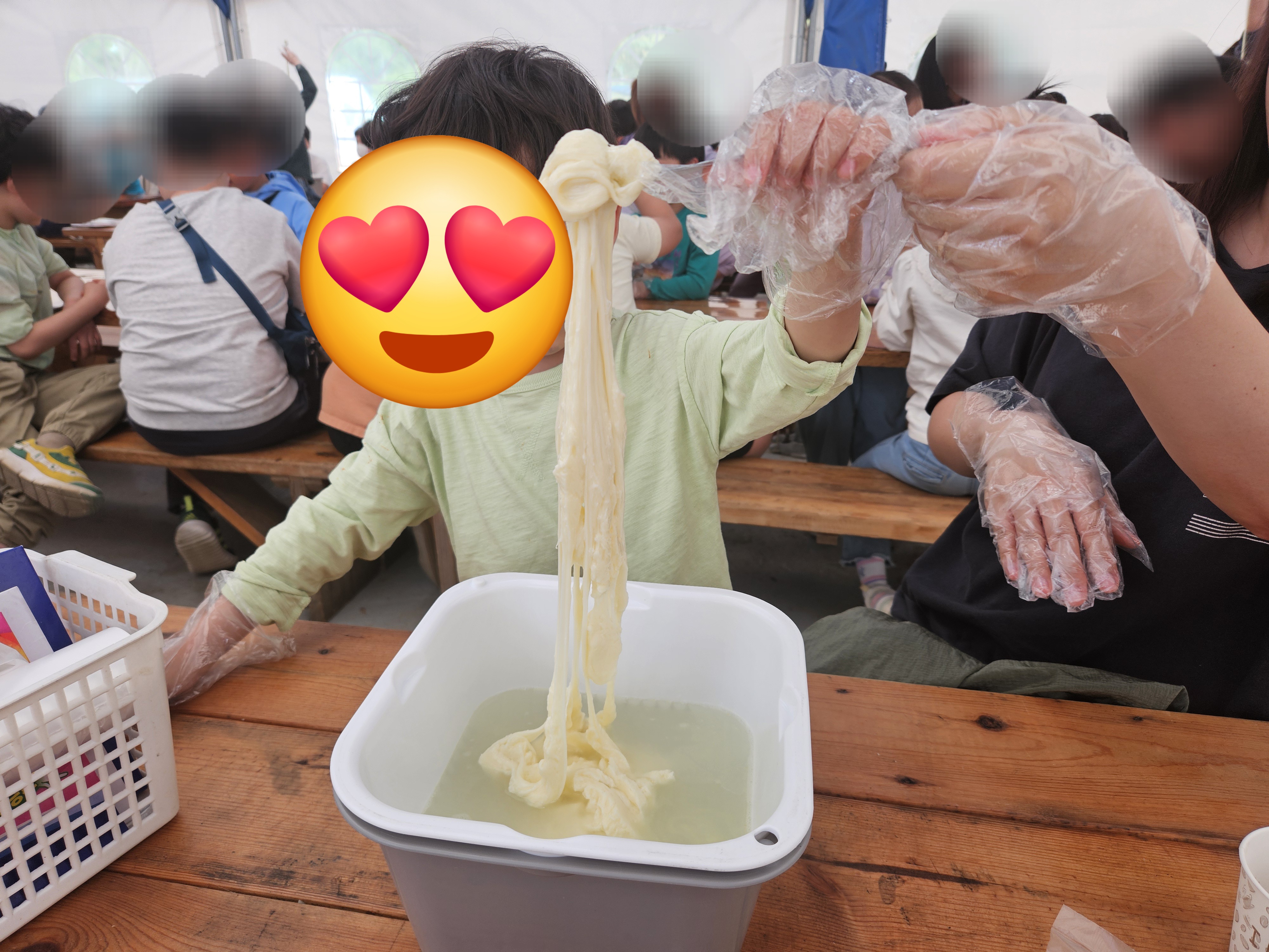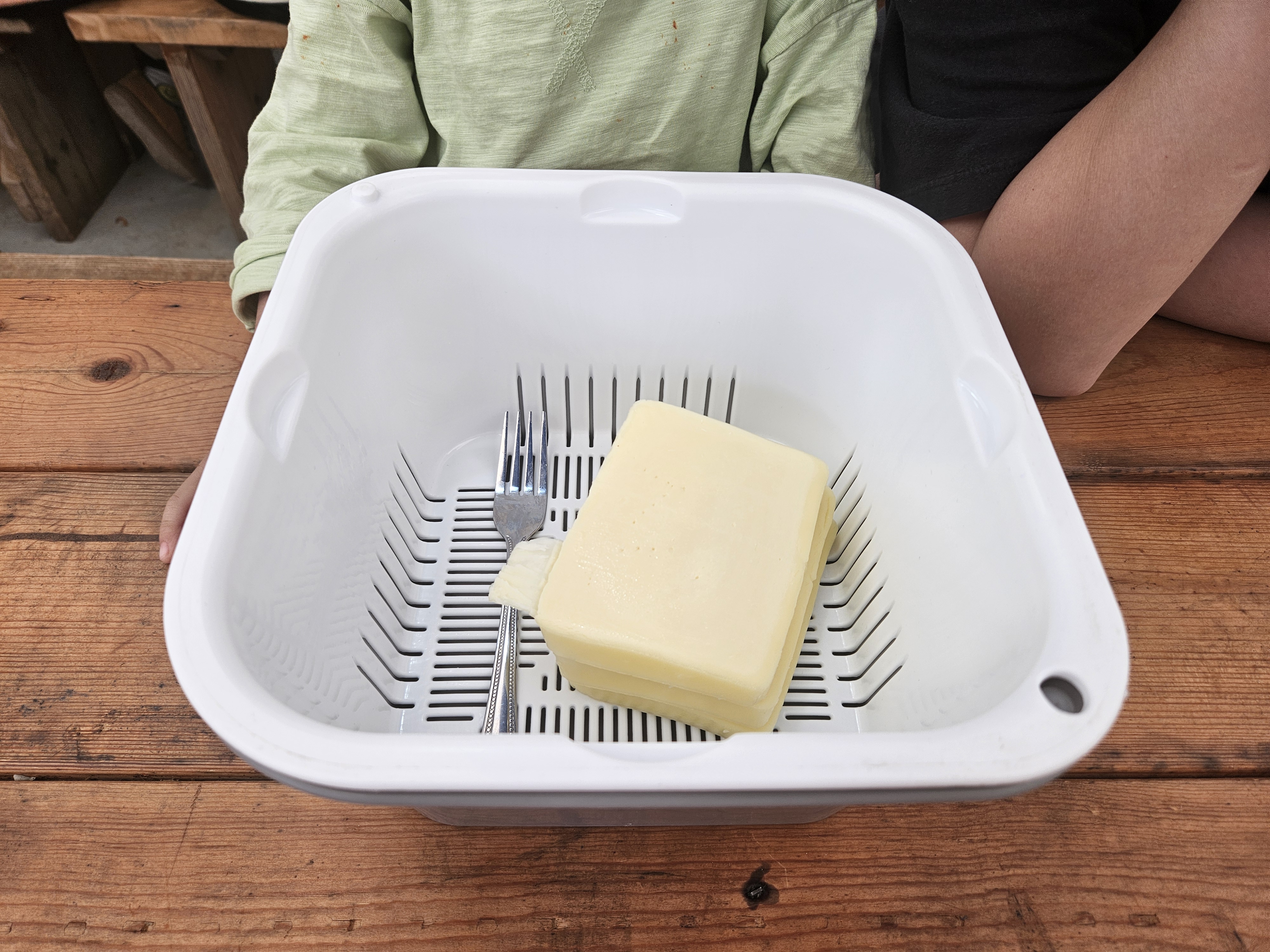 치즈체험시간이 다가와 피자 만들기 하던 곳으로 다시 갔는데요. 원래 앉았던 테이블에는 네모난 모짜렐라 치즈가 준비되어 있었습니다.