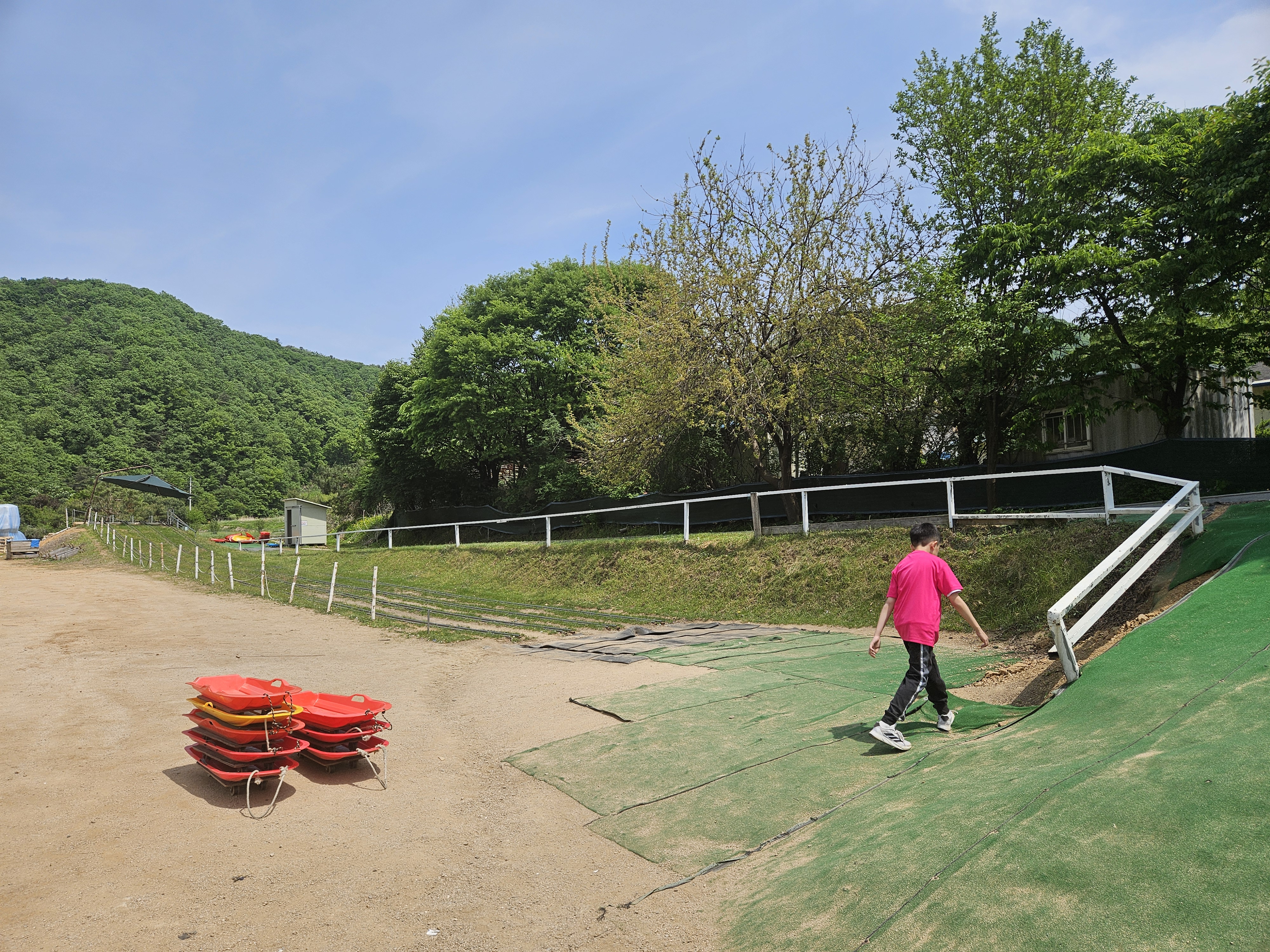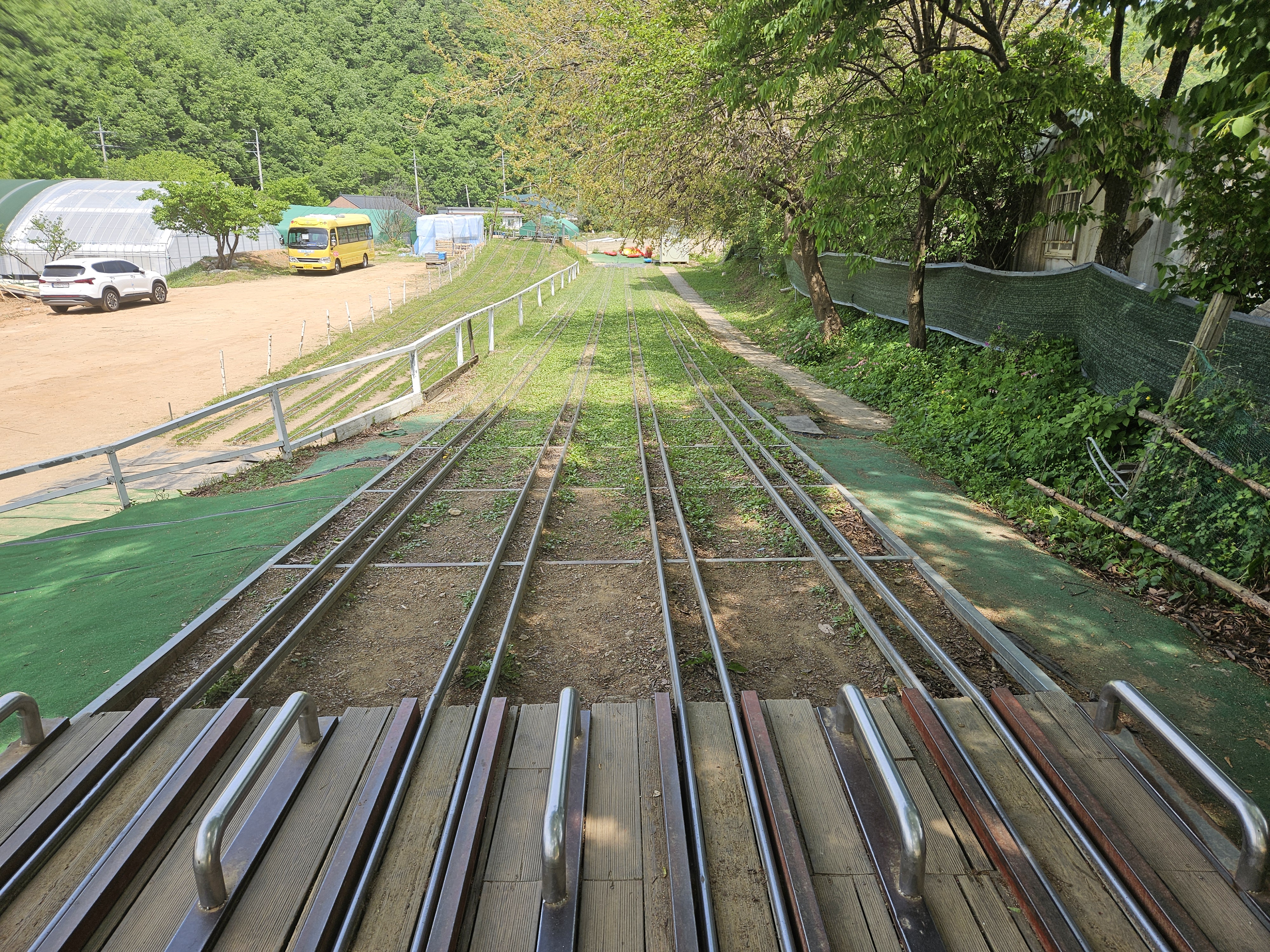 그리고 임실치즈마을 입구 바로 왼쪽 편에는 또 다른 놀이시설인 바퀴 달린 눈썰매가 있었는데요. 레일을 이용해 타는 놀이기구였는데 재미있어 보여 같이 타자고 했지만 아들이 무섭다고 안 탔습니다.