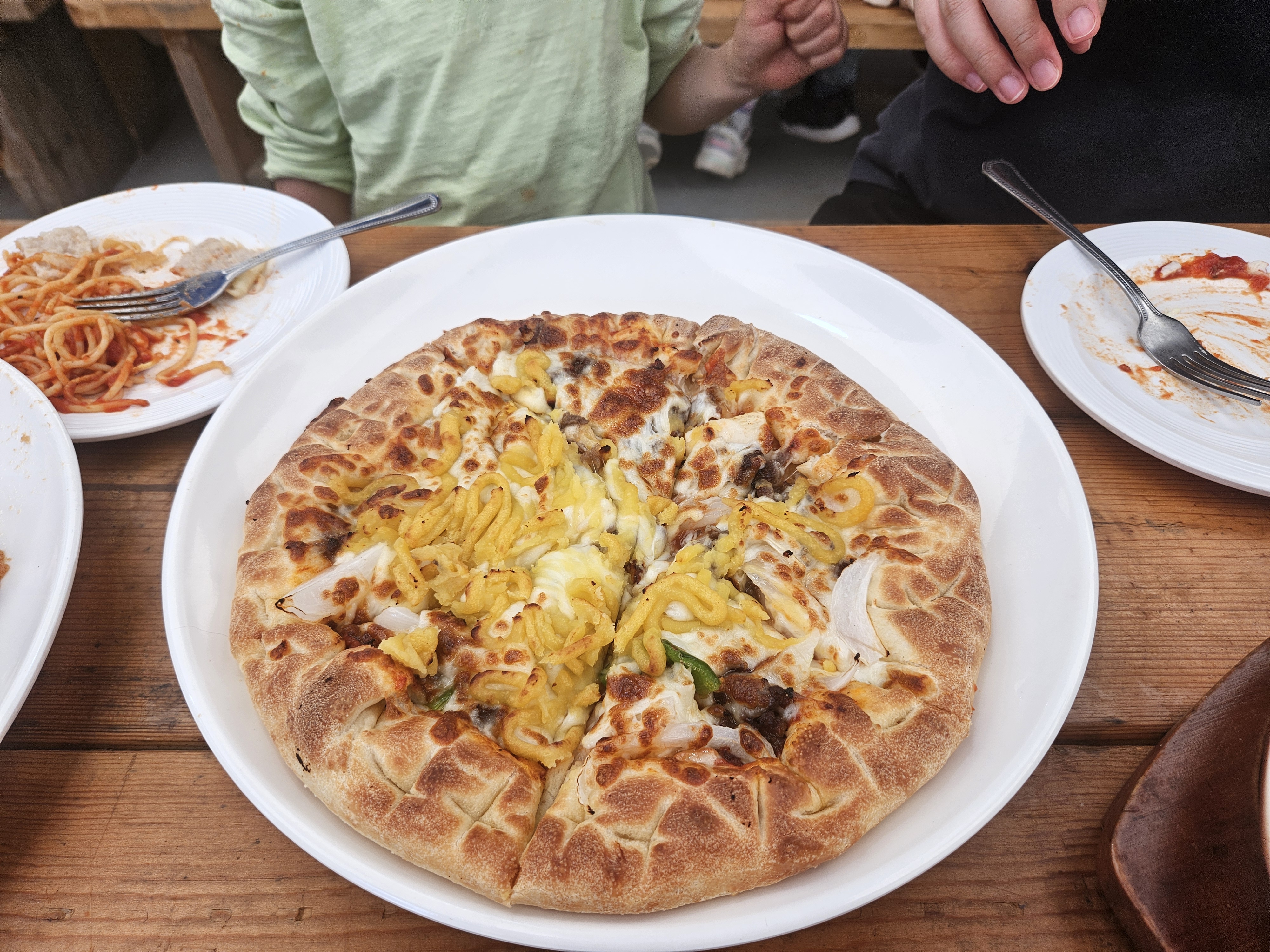 그렇게 열심히 음식을 먹다 보니 드디어 아들이 만든 피자 등장!