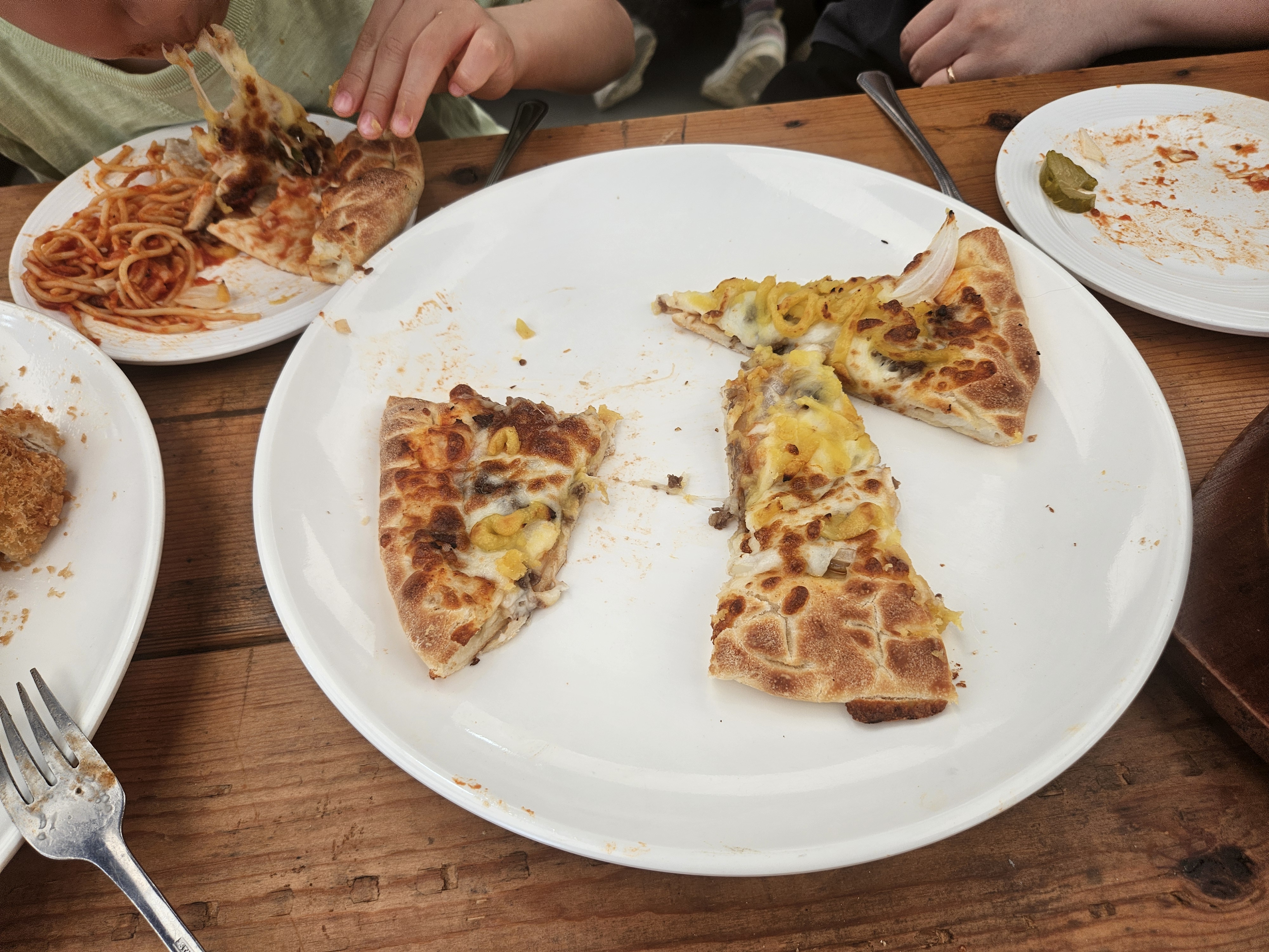 아들도 자기가 만든 피자를 먹더니 아들의 시그니처 포즈인 엄치척을 날리더라고요. 막상 먹다 보니 음식들이 생각보다 너무 많아서 배부르더라고요. 남은 피자는 야무지게 포장해 왔습니다.