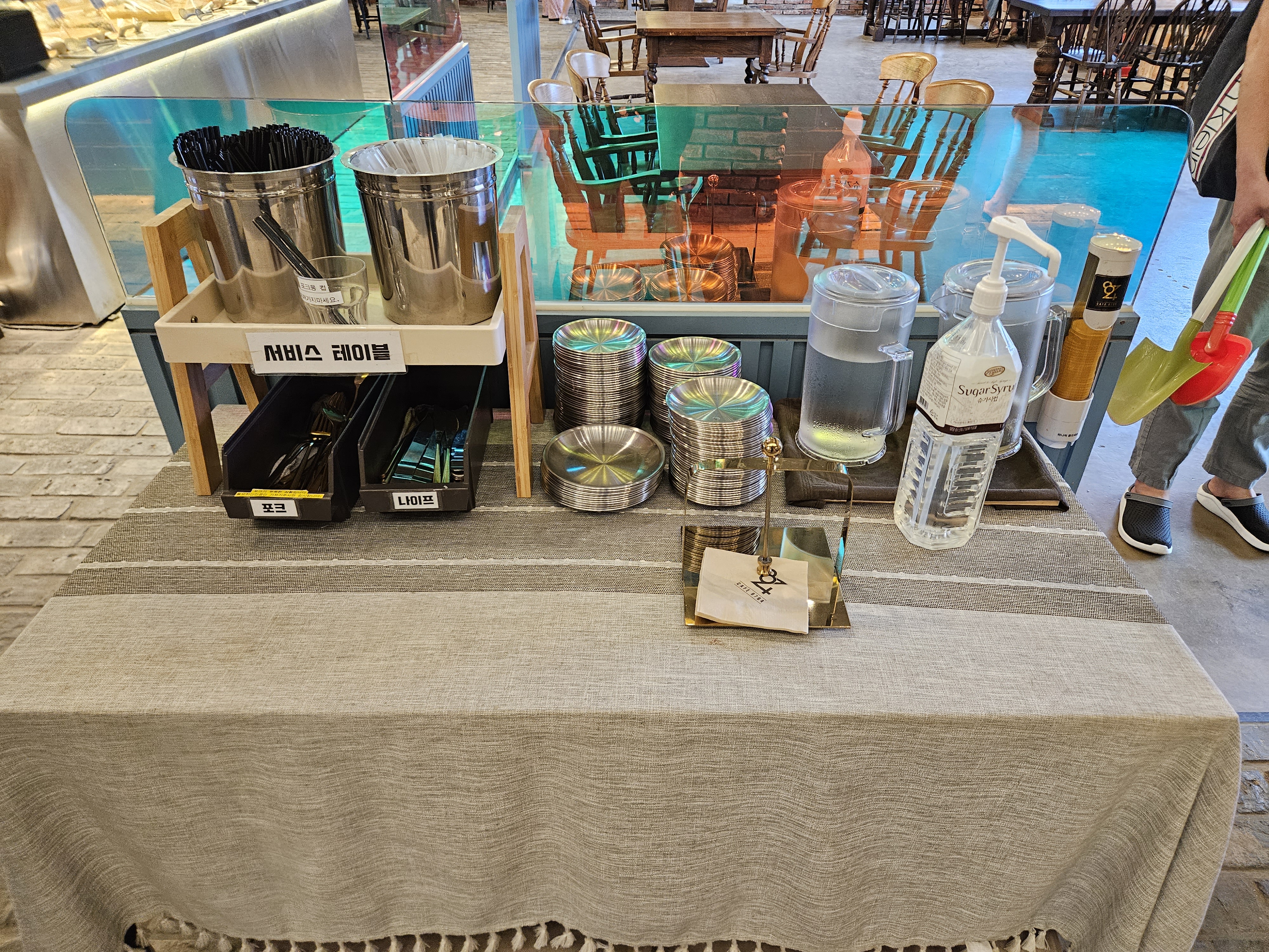 카운터 바로 앞에는 셀프로 식기도구 및 접시, 휴지 등등이 준비되어 있었습니다.