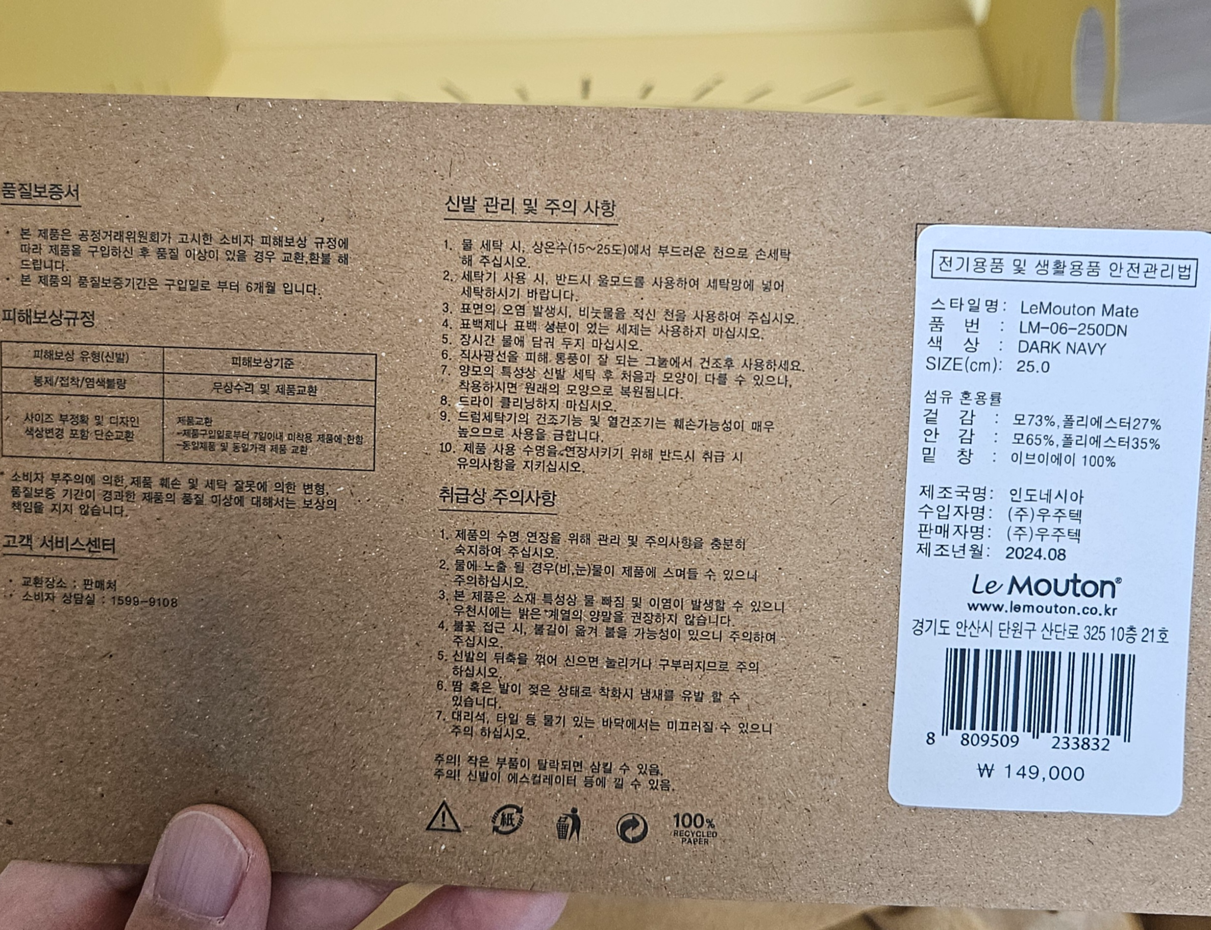 그 종이는 바로 신발 재질 관련 및 품질보증서와 신발 관리, 주의사항이 적혀있는 종이였습니다. 실제로 신어보고 디자인을 보고 구매하는 제품인 만큼 보상 관련 내용도 적혀있으니 구매할 의사가 있다면 한 번씩 읽어보세요.