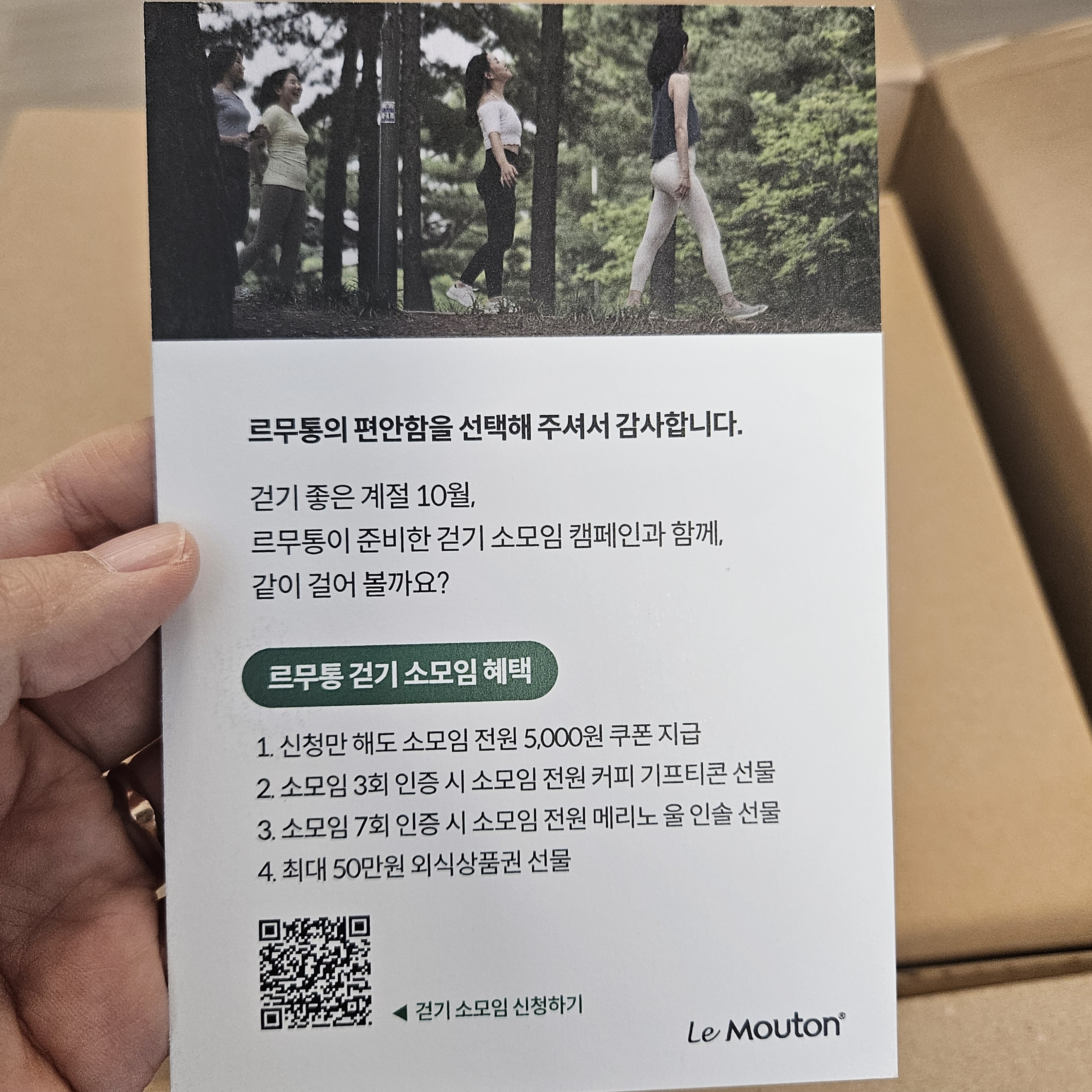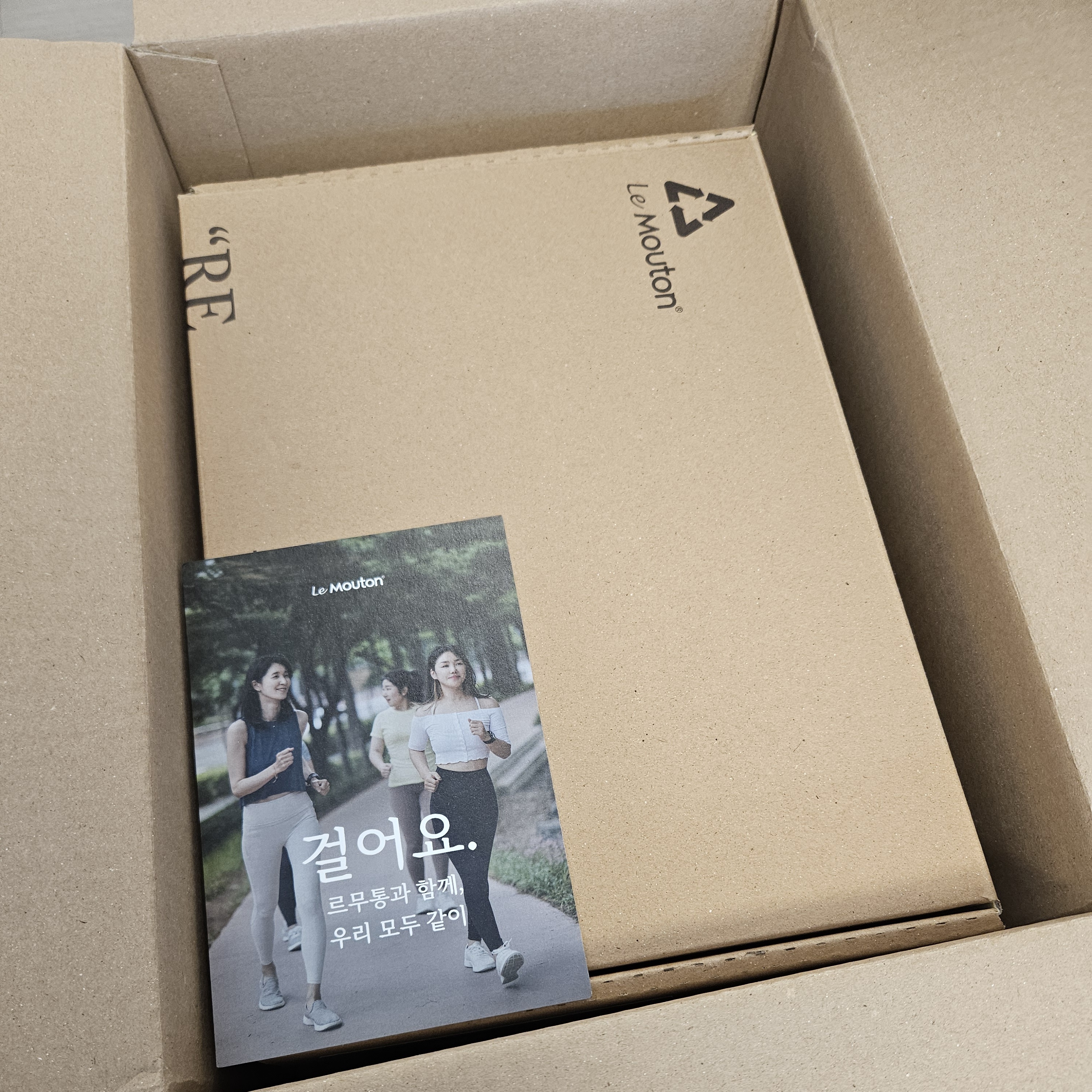 장모님이 와이프한테 선물해 준 르무통 메이트 운동화. 박스도 이중포장으로 배송되었는데요. 안에는 르무통 걷기 소모임 캠페인 관련 혜택에 관한 종이도 들어있습니다.
