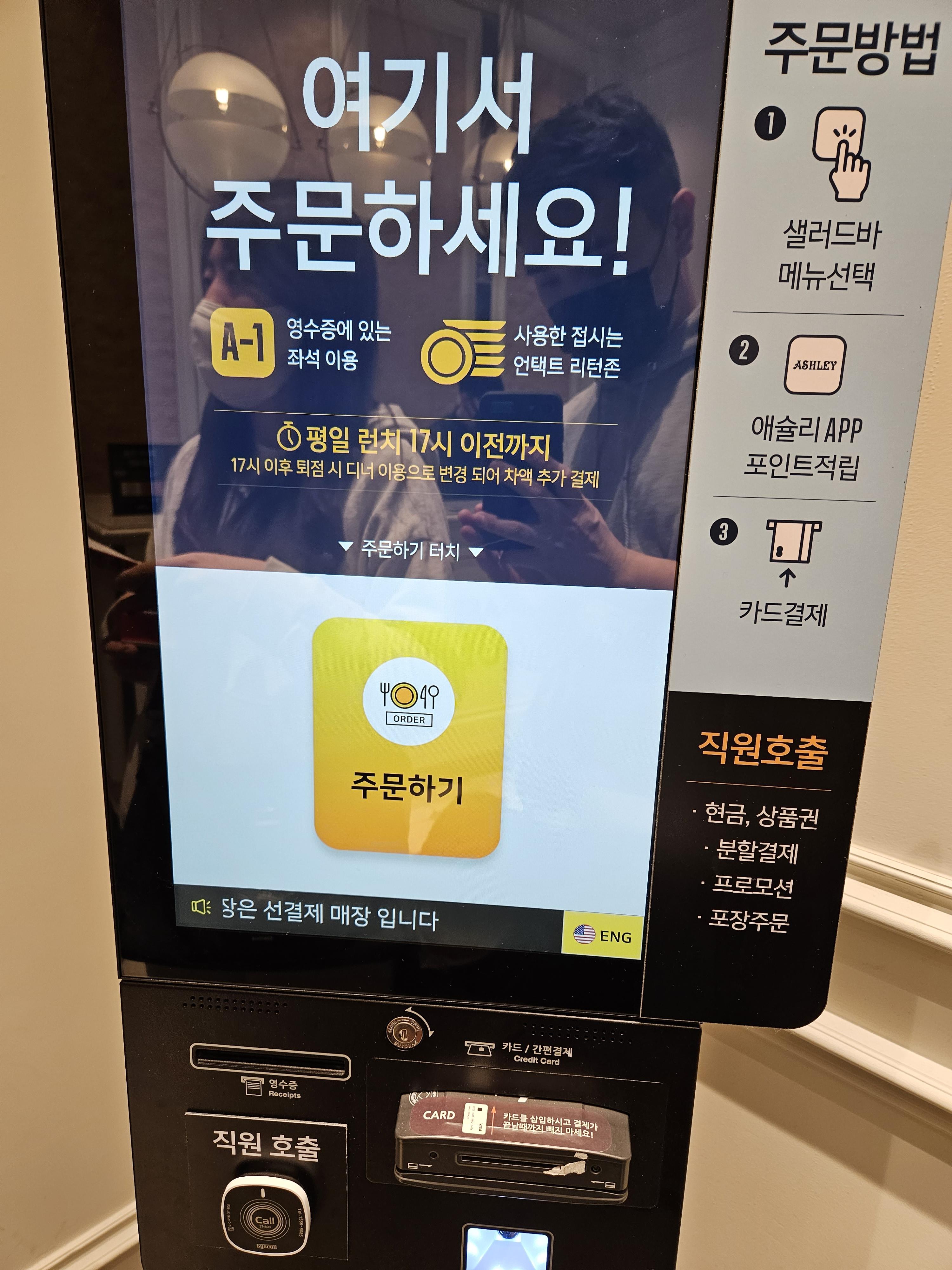 애슐리 퀸즈 레이크꼬모 동탄점 안에 들어가면 있는 키오스크를 이용해 미리 결제하고 이용하는 방식이었는데요.