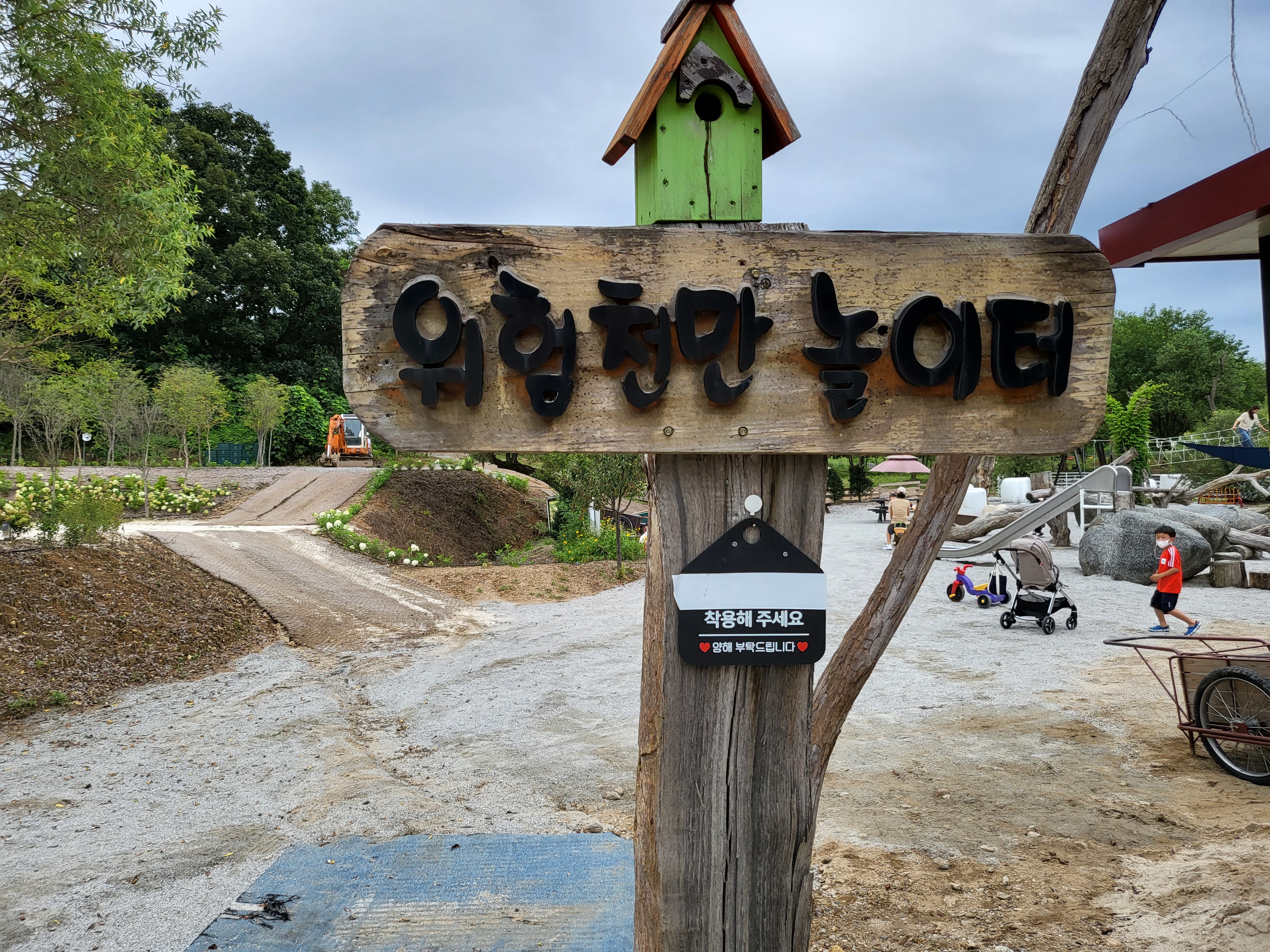 위험천만 놀이터에는 미끄럼틀도 있고, 타이어 그네에 다양한 놀이를 할수있게 꾸며져 있었습니다. 그리고 사람이 많아서 사진을 못찍은 곳이 있는데요. 위험천만 놀이터 판넬 옆에 모래장이 있습니다. 그곳에서 많은 아이들이 놀고 있더라고요.