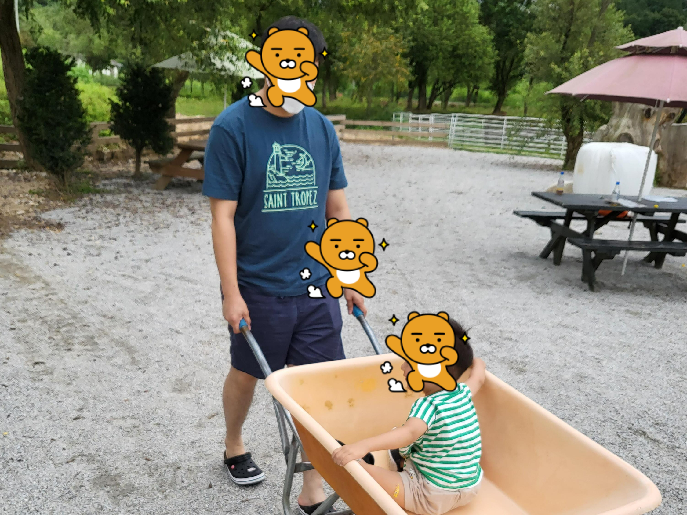 하지만 우리집 꼬맹이는 발에 모래가 들어가는 걸 싫어하는 아이입니다. 평소 신발에 작은 모래같은 게 들어가기만해도 신발에 뭐가 들어갔다고 움직이질 않는 아이라서 모래 놀이는 포기했네요. 하지만 자동차 장난감과 탈것을 좋아하는 아들은 또래 아이가 손수레를 타고 있는 모습을 보더니 자기도 하고 싶다며 태워 달라고 하더라고요. 정말 신나게 태워줬습니다.