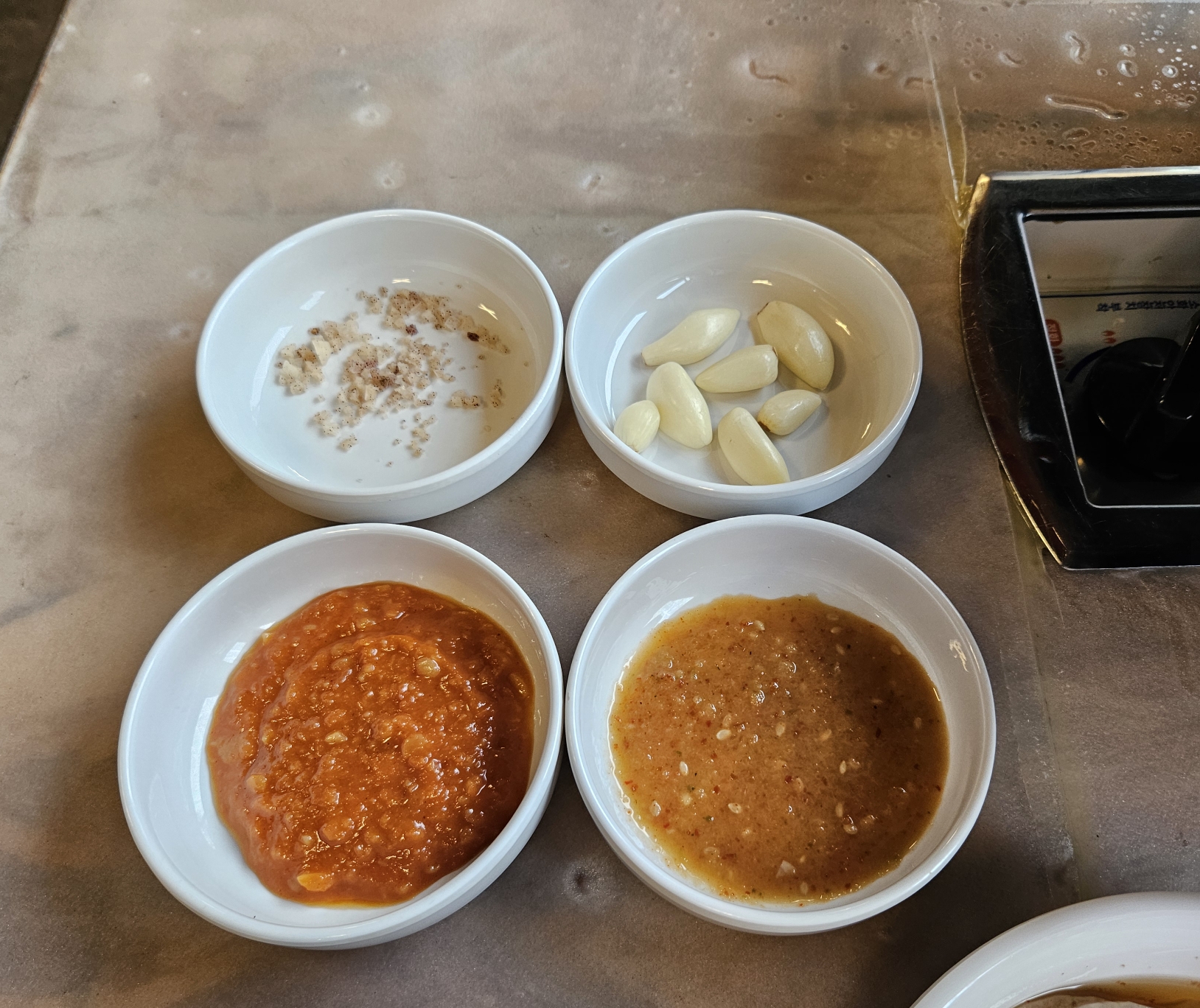그렇게 주문과 동시에 밑반찬으로 각종 양념장 및 양파, 쌈야채, 김치 등이 나오더라고요. 그리고 모자란 반찬은 셀프바에서 더 떠올 수 있었습니다.