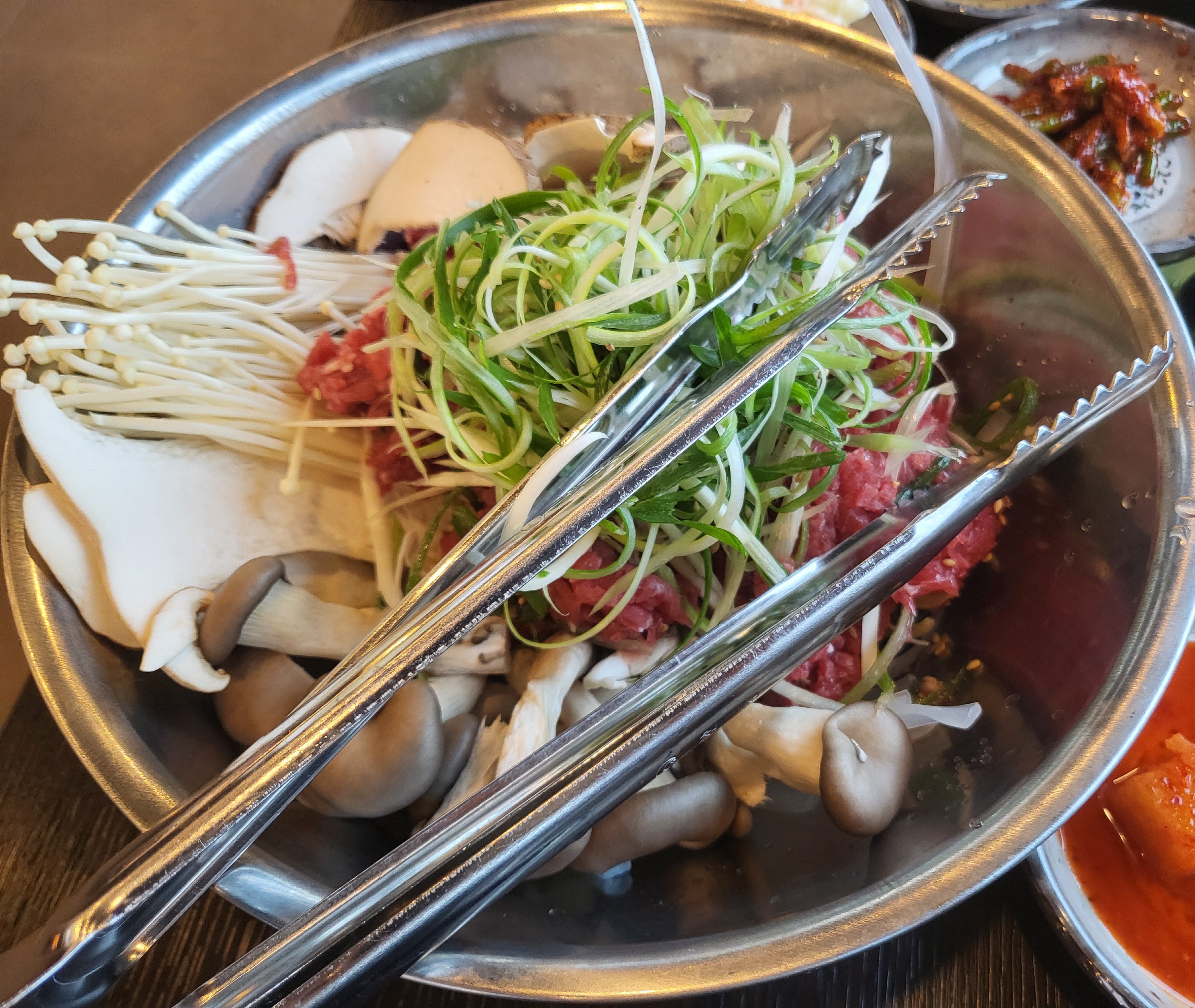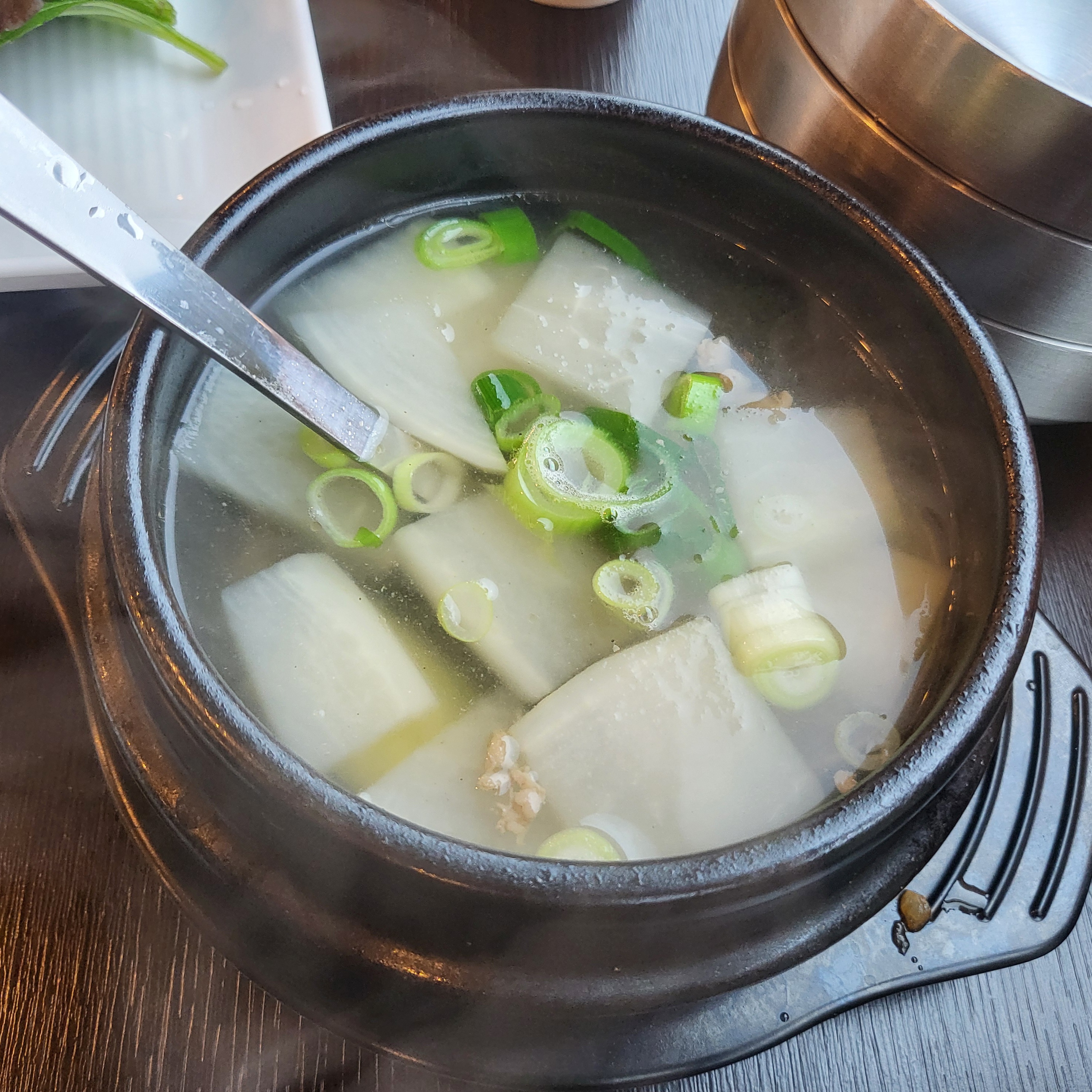 그렇게 쌈을 담아오니 돼지 불고기를 시키면 나오는 김치찌개랑 소불고기 시키면 나오는 소고기뭇국이 나왔고