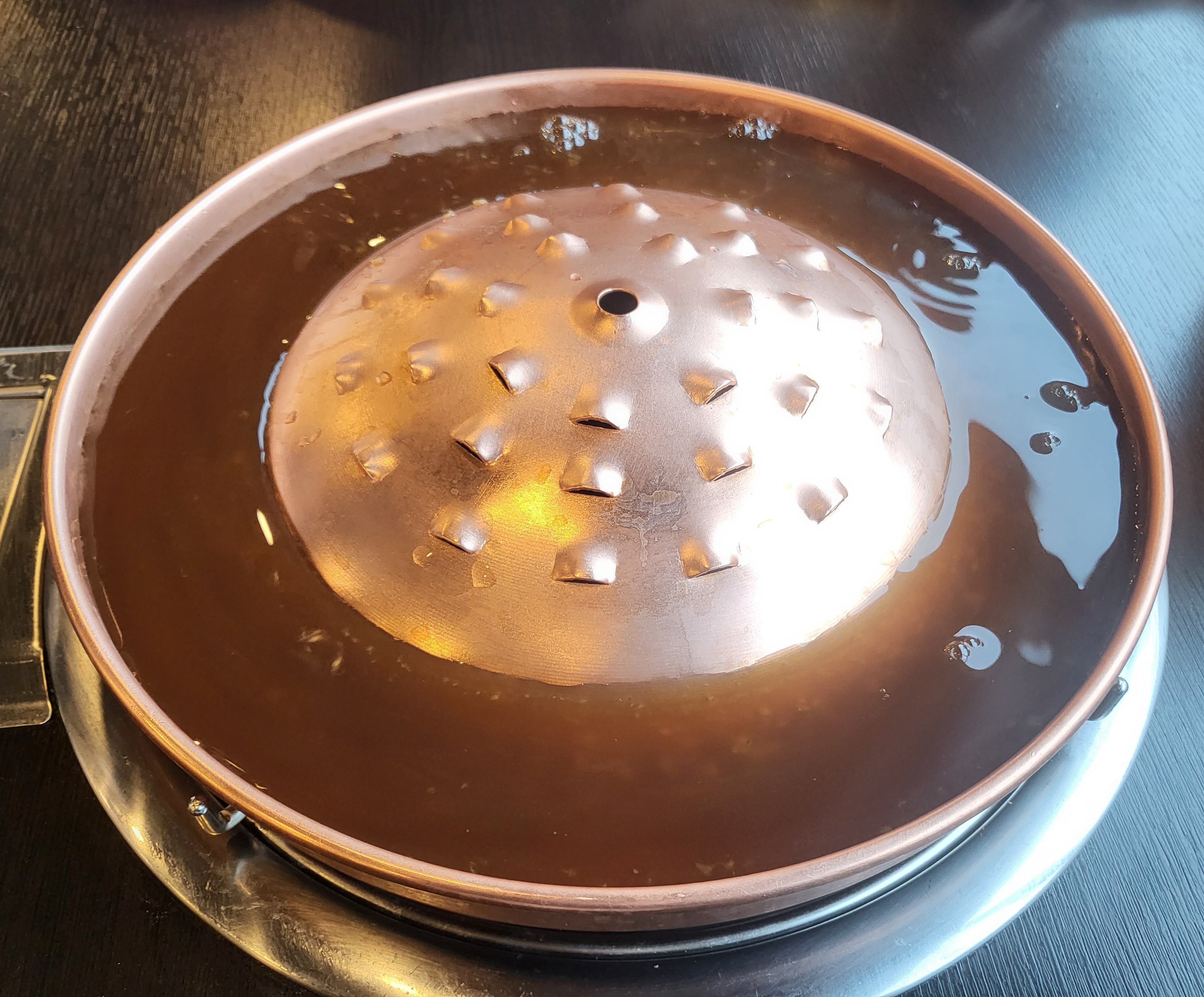 맛있게 먹는 방법은 간단하더라고요. 동판에 올린 고기를 앞, 뒤 핏기가 가실 정도로만 익힌 후 육수에 넣어 중불로 줄여 가능한 바로 먹는 게 좋다고 너무 익히면 고기가 퍽퍽해진다고 안내해 주었습니다.