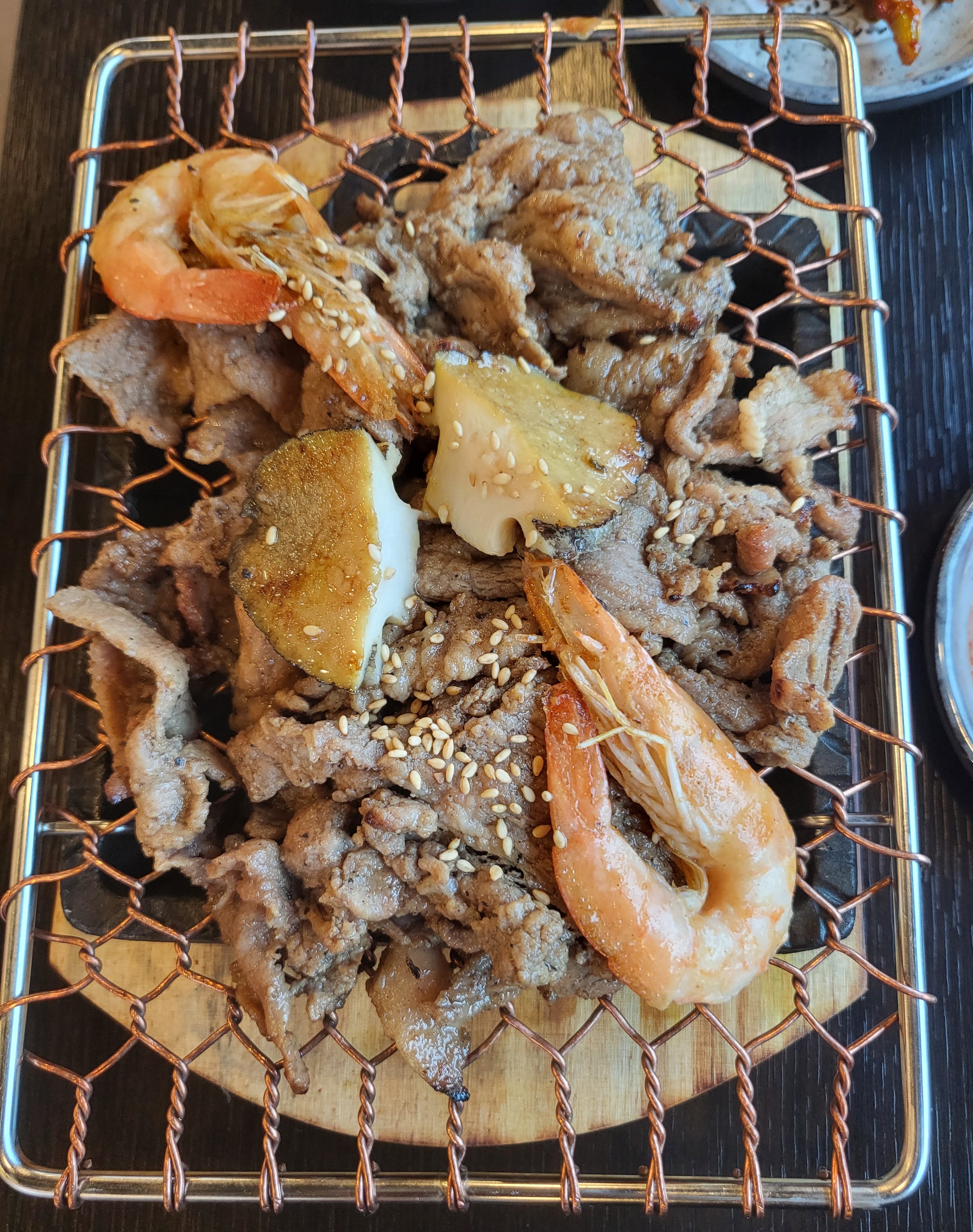 그리고 나온 돼지 불고기. 1인분만 시켰는데 생각보다 양이 많았는데요. 새우도 2마리 들어있고 전복도 반개가 떡하니 나오더라고요.