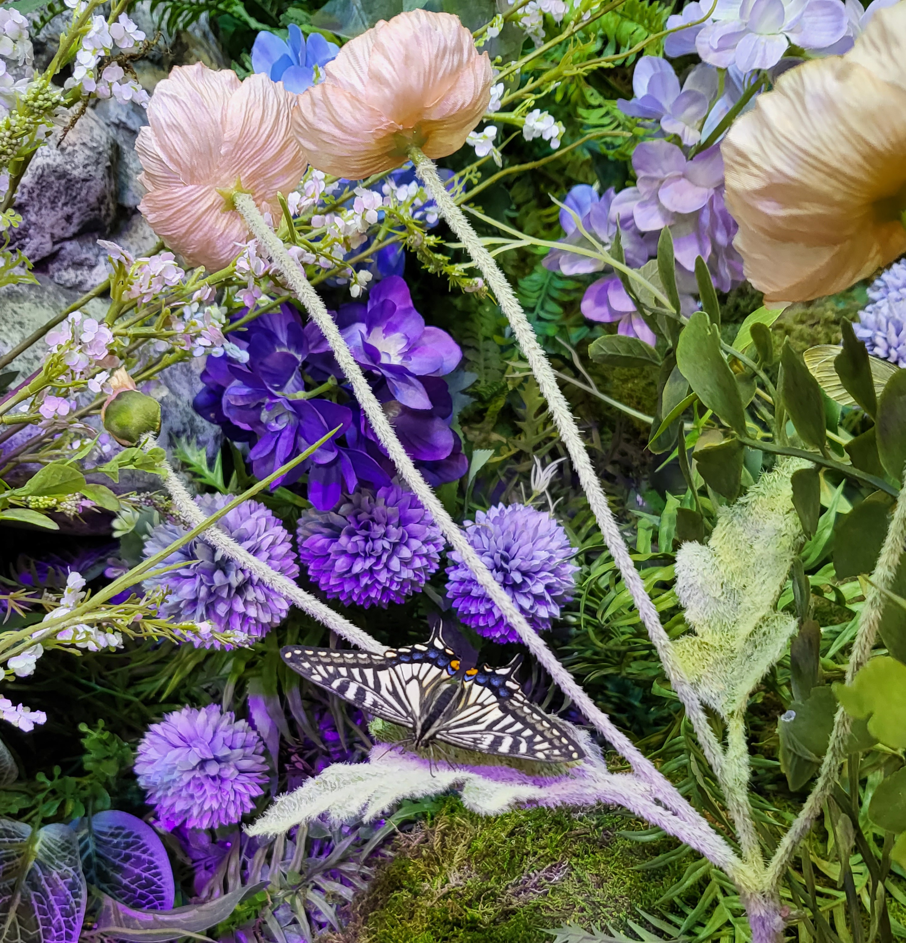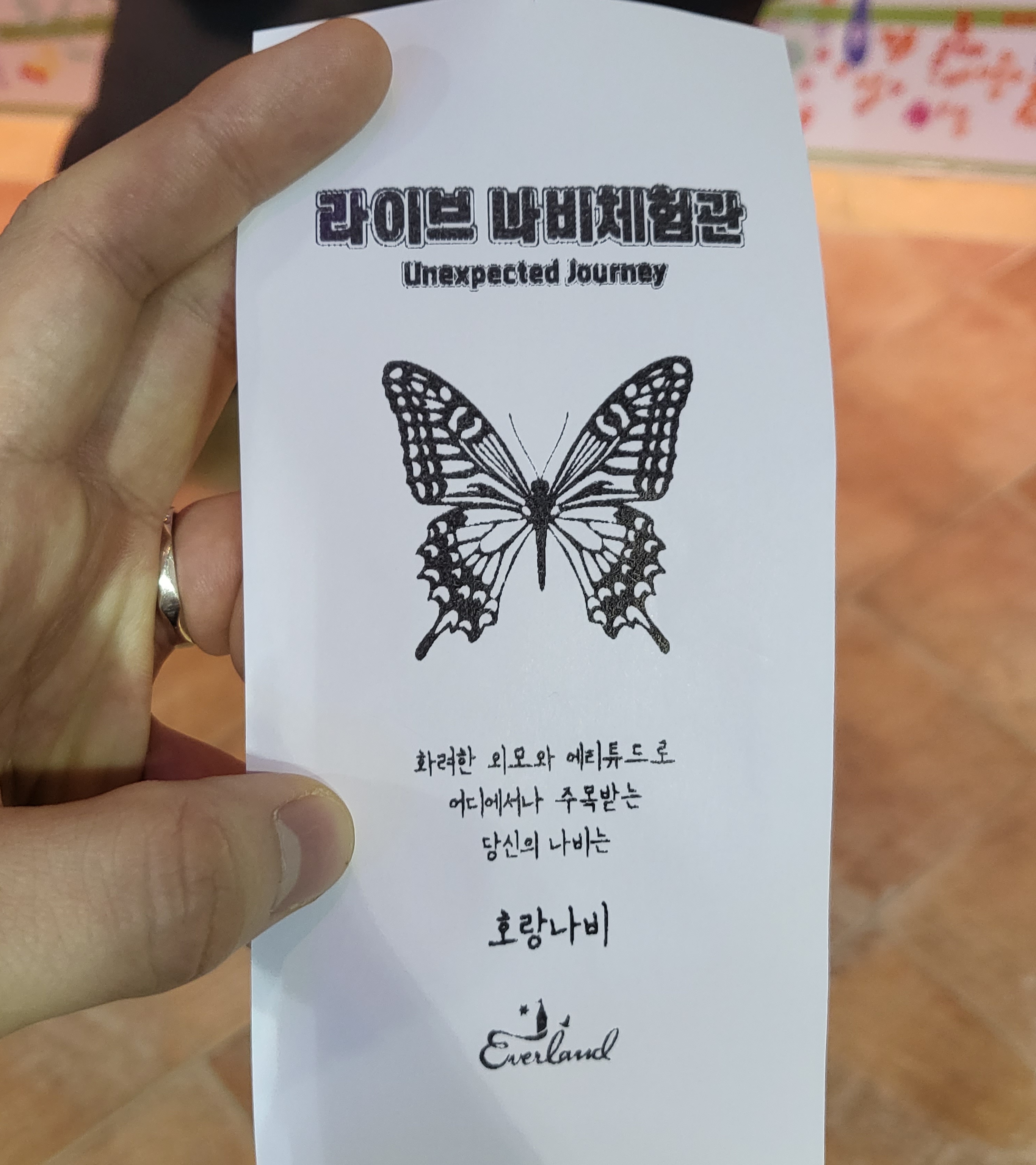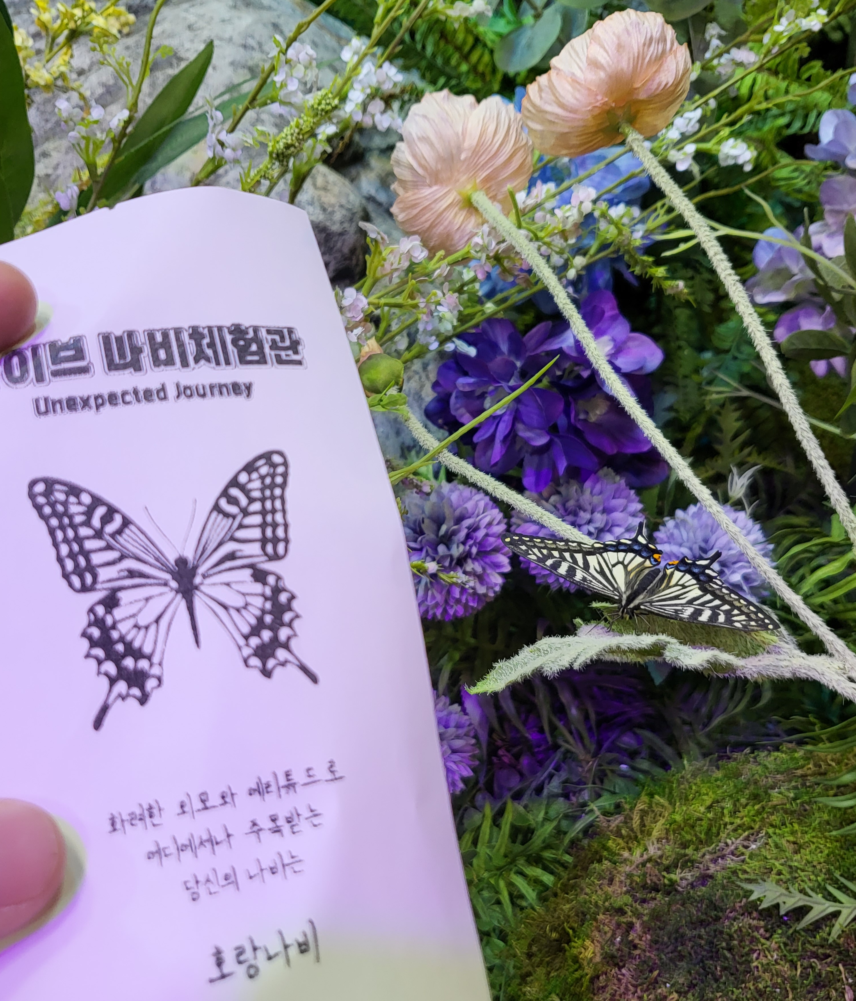 기다리는 동안 하늘 위에 꾸며놓은 나비모형도 구경하고 근처를 이쁘게 잘 꾸며놓았더라고요. 30분 정도 대기하고 입장한 라이브 나비체험관 제가 사진을 찍지 못했지만 실제 나비를 보기 전 방에서 1-2분짜리 영상하나를 시청하고 실제 나비가 있는 방으로 입장을 하는데요
