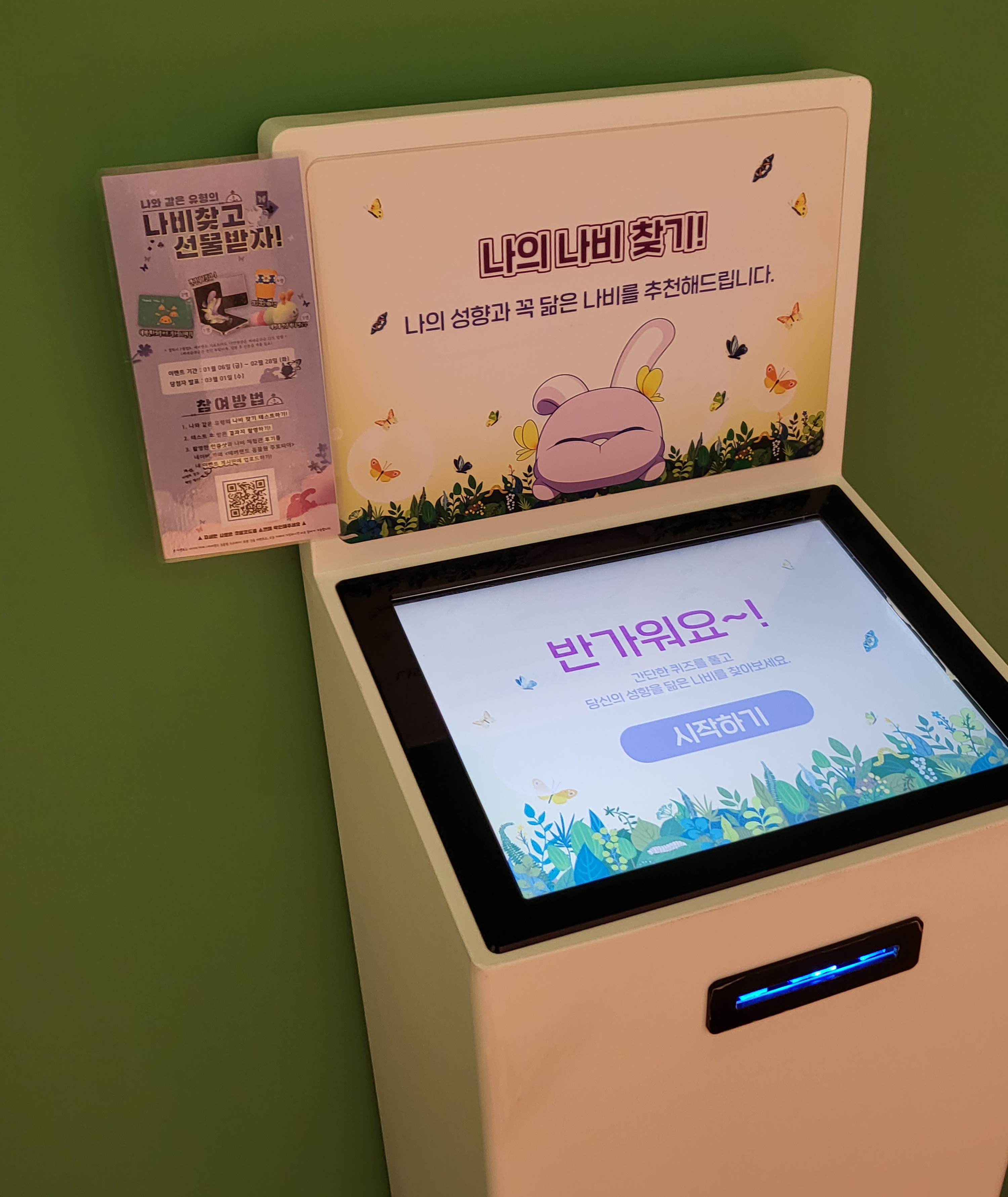 그리고 나비 찾고 선물 받자! 이벤트도 진행 중이었는데요. 사진에 보이는 해당 키오스크에서 시작하기를 클릭하고 간단한 질문을 클릭하면 나의 나비가 인쇄됩니다. 저는 화려한 외모와 에티튜드로 어디에서나 주목받는다는 호랑나비가 나왔답니다. 사은품도 자세히 보니 푸짐하더라고요.