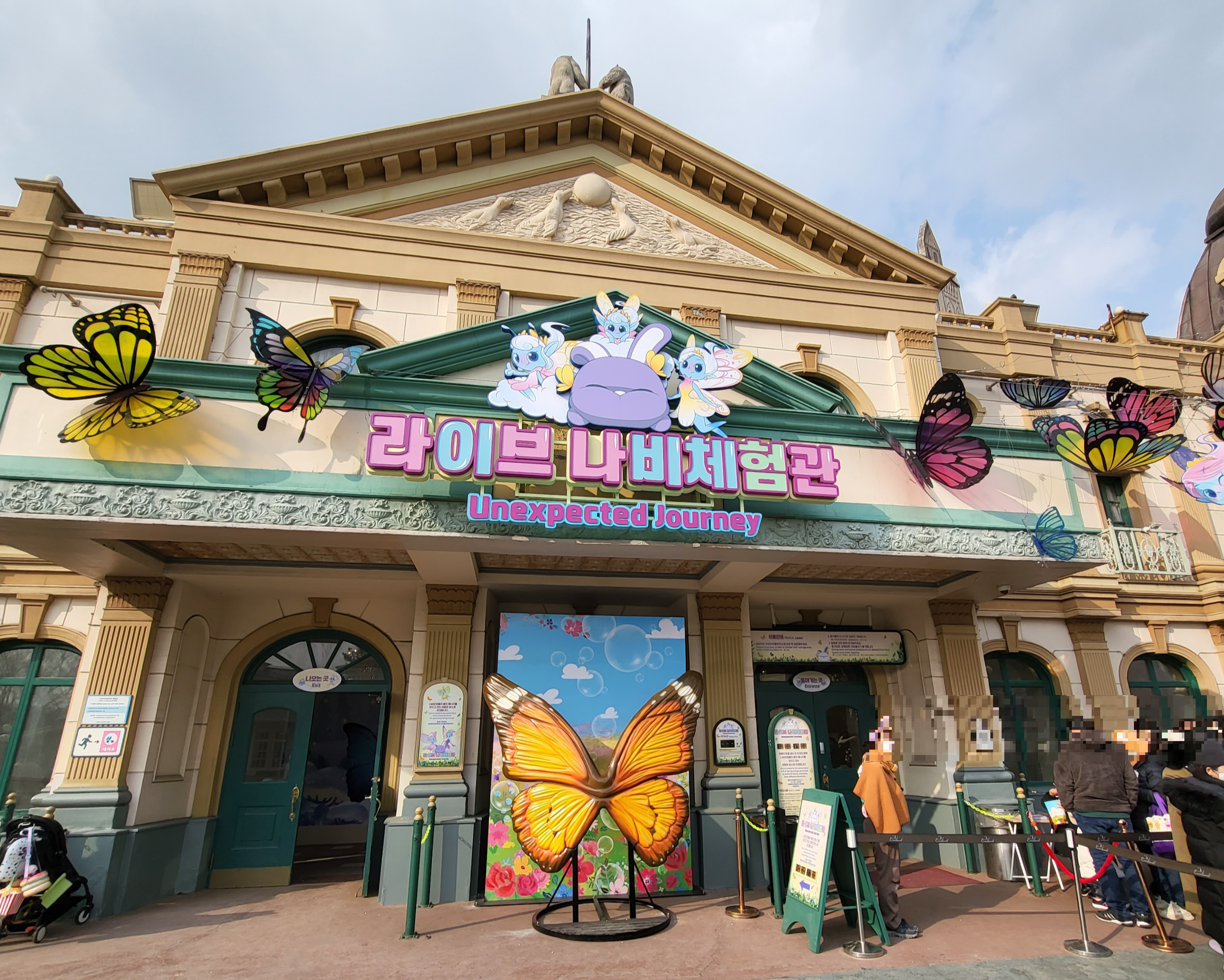 그리고 조금 걷다 보니 라이브 나비체험관이라고 못 보던 게 보이더라고요 사람들도 많이 줄 서있고 에버랜드에 많이 놀러와봤지만 처음 보는 체험관이길래 직원분한테 몇 분 기다려야 하는지 여쭤보니 약 30~ 40분 기다려야 한다고 하더라고요. 아들한테 보고 싶은지 물어보고 보고 싶다고 말해 줄 서서 기다려 보았습니다.