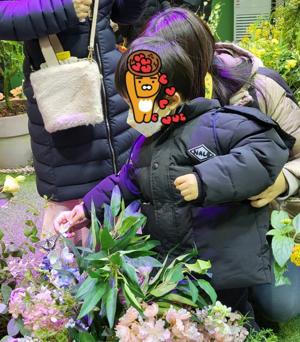 실제 나비가 날아다니는 게 보이시나요?? 아직 봄도 아닌데 꽃들도 이쁘게 피어있고 엄청 많은 나비들이 날아다니는데 남자인 제가 봐도 이쁘더라고요. 아들이랑 와이프가 눈이 휘둥그레지면서 꽃이랑 나비 구경을 했답니다.