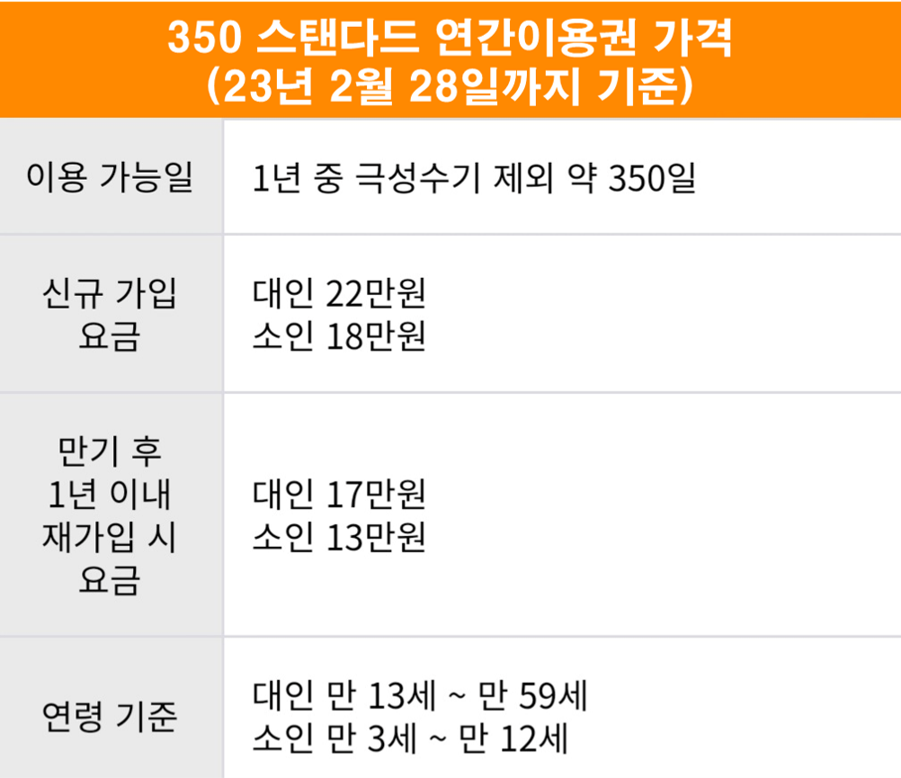우대 혜택 금액 또한 변경되었습니다. 왼쪽 이미지가 23년 2월 28일까지 기준이고 오른쪽이 23년 3월 1일부터 변경되는 금액이니 참고하시면 좋을 것같습니다. 저희 가족은 22년 4월 25일 날 와이프 저해서 350 스탠다드 연간이용권 22만 원에 구매했는데요. 아직 36개월 안된 아들이 있기에 2월 28일 가격 오르기 전에 선 재가입할 예정입니다. 가까워서 그런지 생각보다 많이 가게 되더라고요.