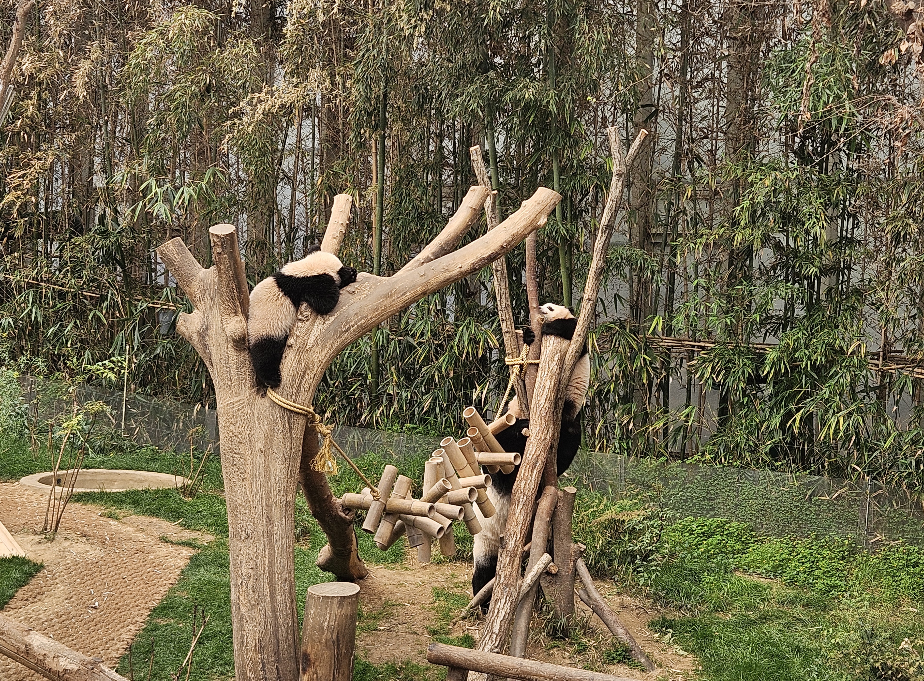 아빠 판다 러바오 보다 역시 쌍둥이 판다 루이&후이바오가 있는 쪽에 사람들이 많이 있었답니다. 솔직히 누가 루이바오고 후이바오인지 모르겠지만 어린 판다 한 마리는 나무에서 자고 있었고 다른 어린 판다는 나무를 잘 못 타는지 엄마 판다 아이바오가 나무 타는 걸 도와주는 것처럼 보이더라고요. 결국 떨어지긴 했지만요.