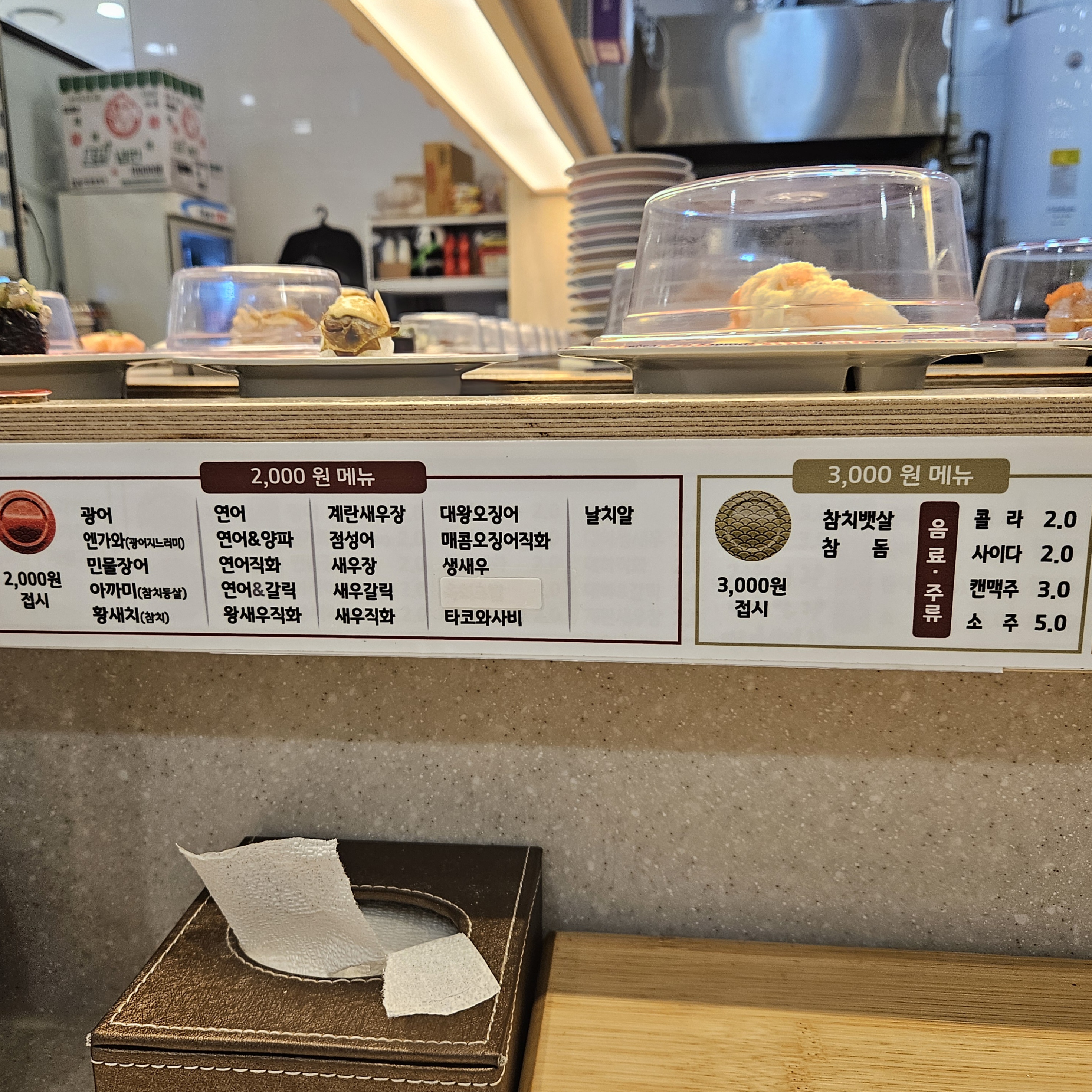 최소금액이 1,300원이라는 것만 보고 엄청 저렴하겠구나 기대했었는데, 막상 방문해 보니 주로 2,000원짜리 접시를 골라서 먹게 되더라고요. 그래서 다 먹고 계산해 보니 전체 가격이 일반 초밥집과 큰 차이가 없었습니다. 그리고 어떤 건 맛있고 어떤 건 별로여서 고를 때 신중해야겠더라고요.
