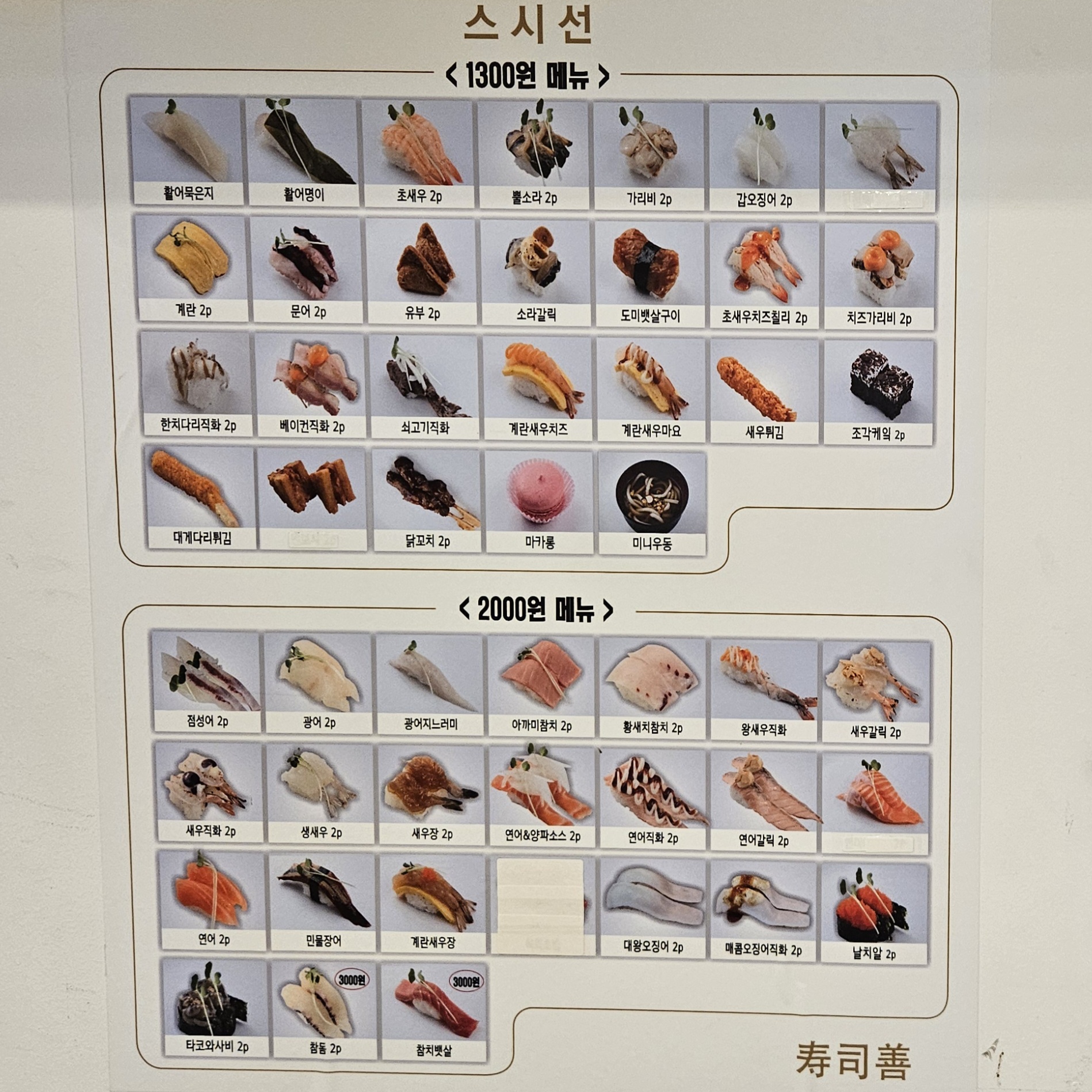 가게 안쪽 벽에 사진으로 붙어 있는 스시선 초밥 메뉴판 1,300원 메뉴 2,000원 메뉴 종류입니다. 3,000원 메뉴판은 못 본 건지 모르겠지만 그냥 참고만 하시길 바랍니다.
