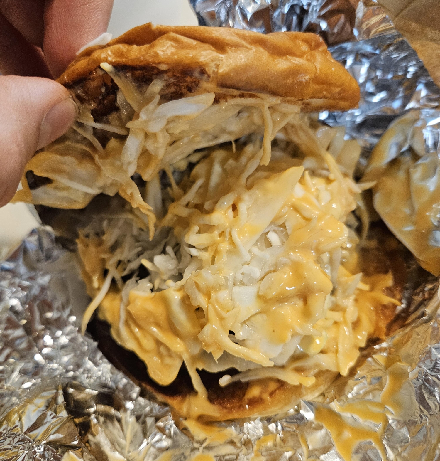일단 한입 베어 먹어보니 양배추 아삭한 식감 및 고기패티가 두툼해서 맛있더라고요. 소스 또한 케첩+마요네즈만 들어간 게 아닌 뭔가 다른 게 첨가된 느낌이었고 수제고기패티라서 그런지 육즙이 좔좔 너무 맛있었습니다.