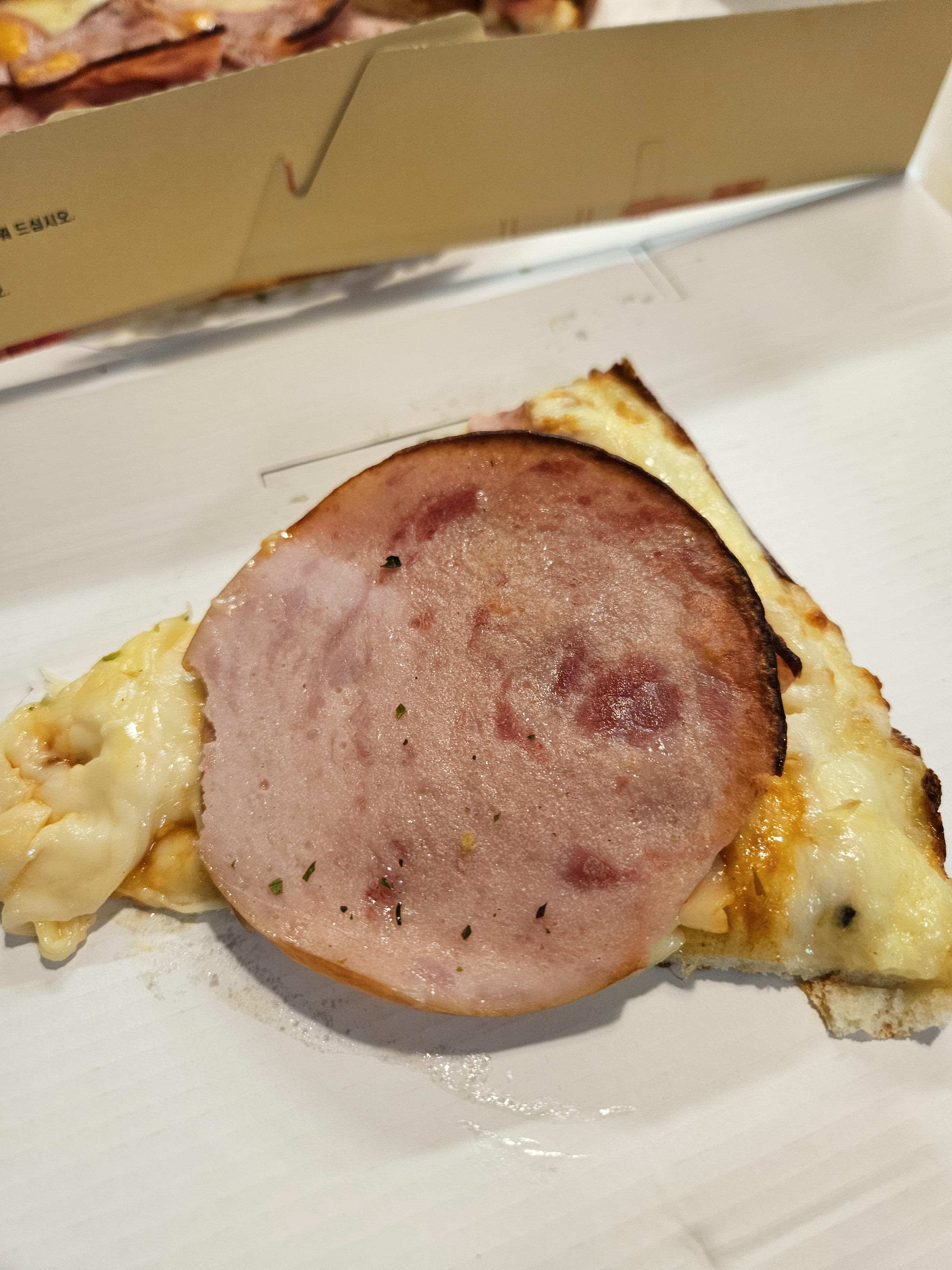 ▼그래도 맛만 있으면 되니깐 한입 먹어보았는데요. 일단 도우는 딱 중간정도 두께여서 먹을 만했고 맛은 짠짠느낌? 그냥 햄도 아닌 대왕햄이 들어간 거라 맛이 없을 수 없는 맛이었지만 아무리 생각해도 토핑이 별로여서 그런 건지 계속 뭔가 섭섭한 느낌을 받았는데요.